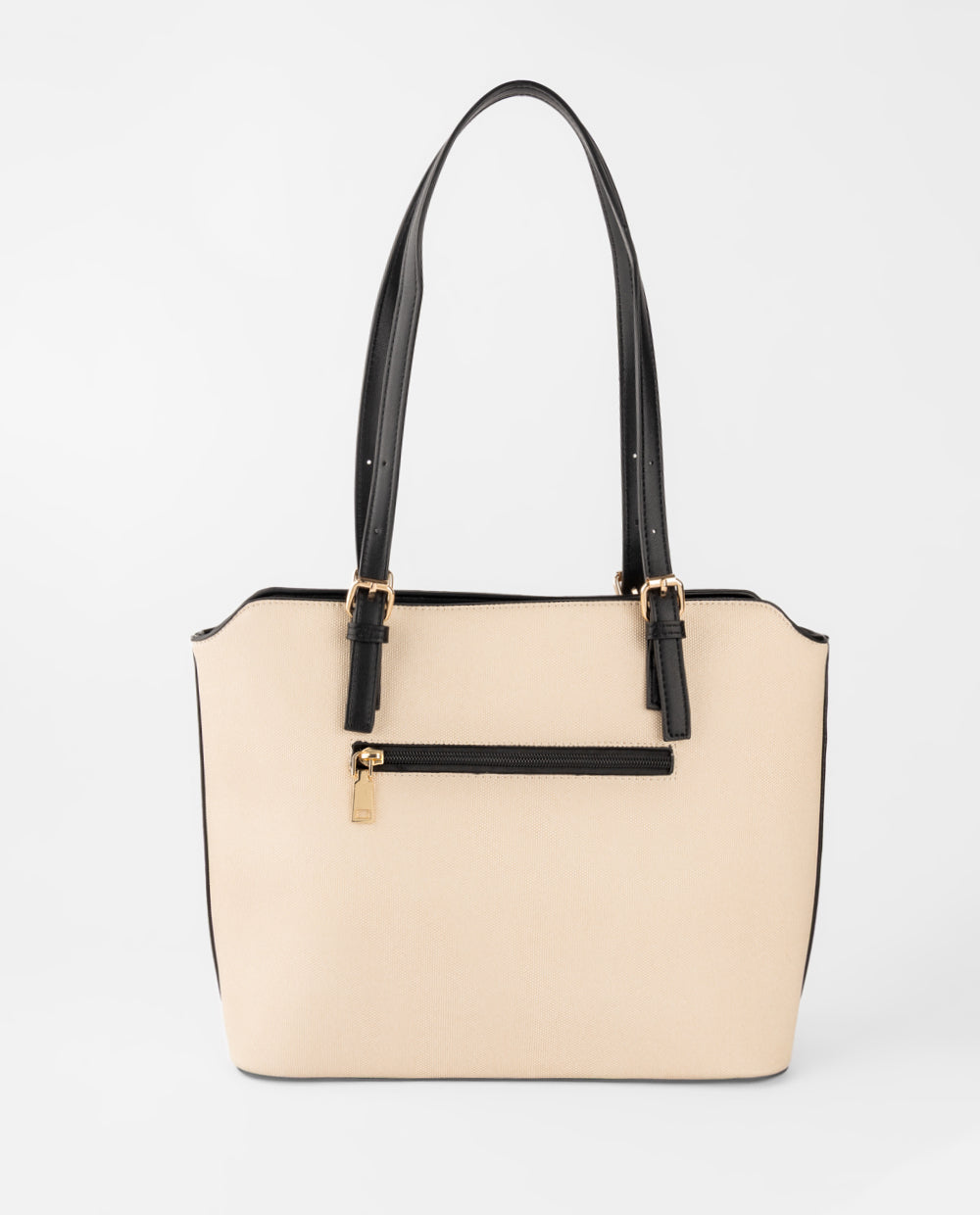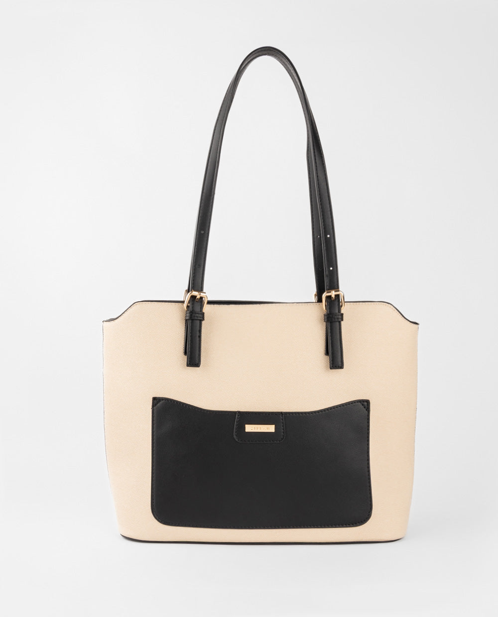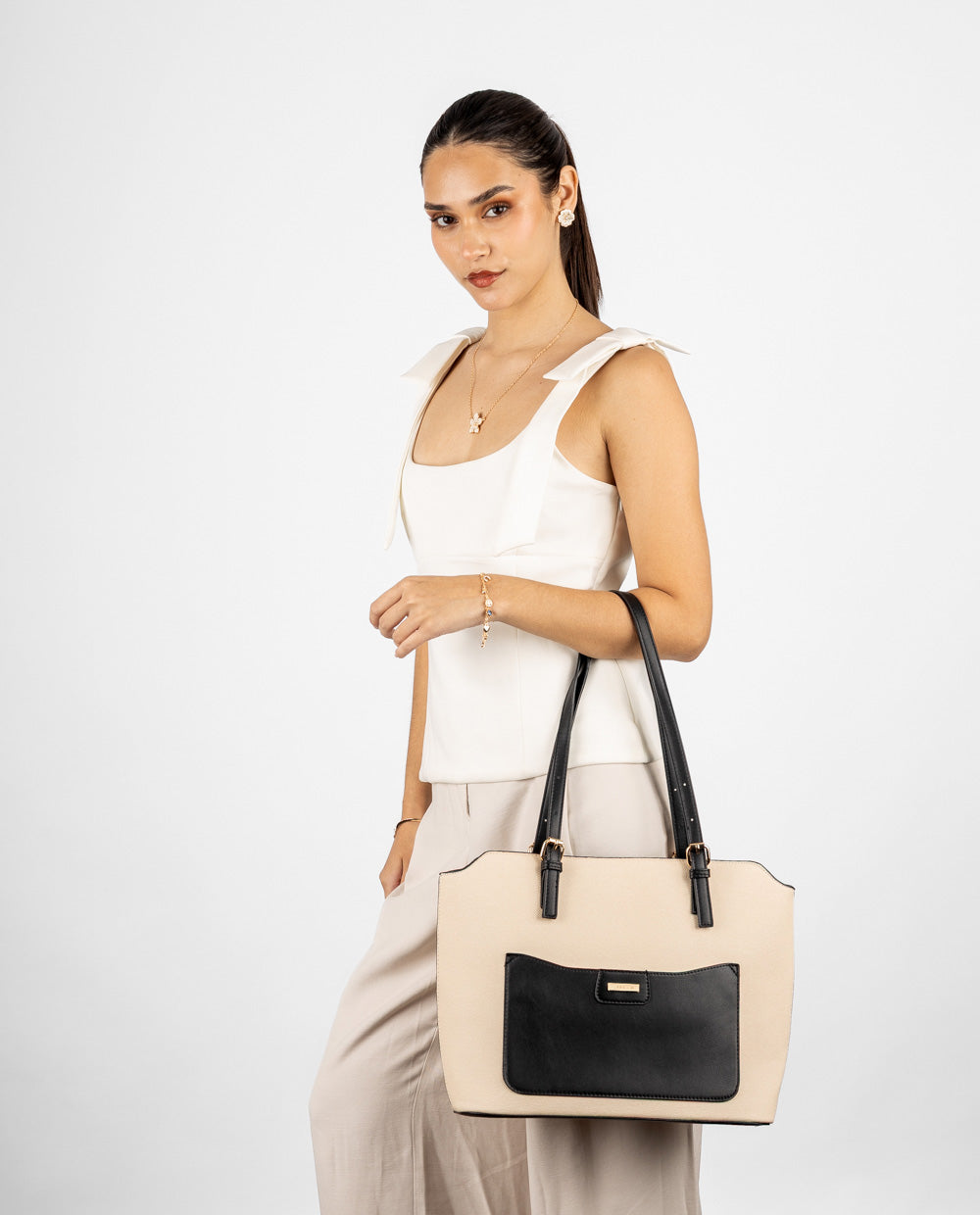 Cartera tote en material PU beige con bolsillo frontal negro y cierre posterior. Incluye asas largas en PU negro, resistentes y cómodas para llevarla al hombro.