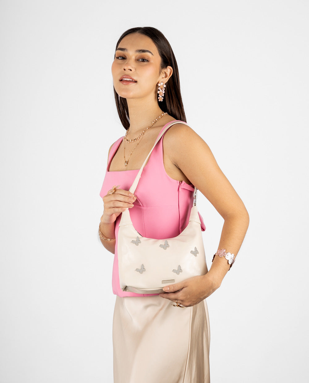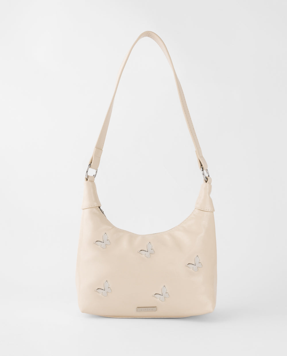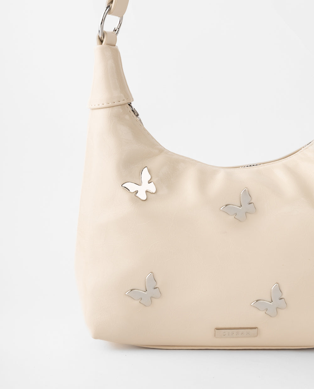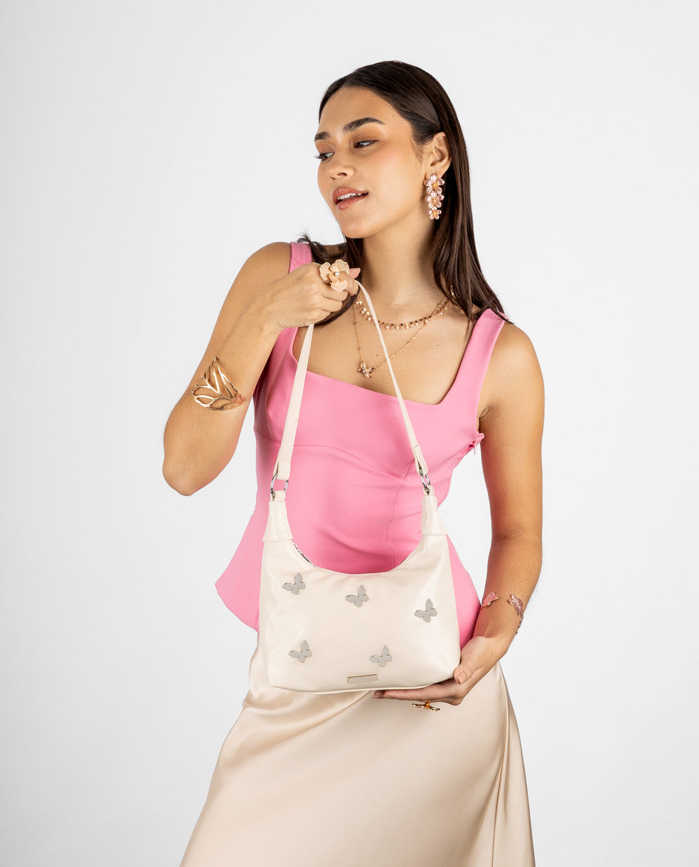 Cartera tote en tono marfil con apliques de mariposas troqueladas al frente. Incluye correa ajustable y desmontable, para llevarla cruzada.
