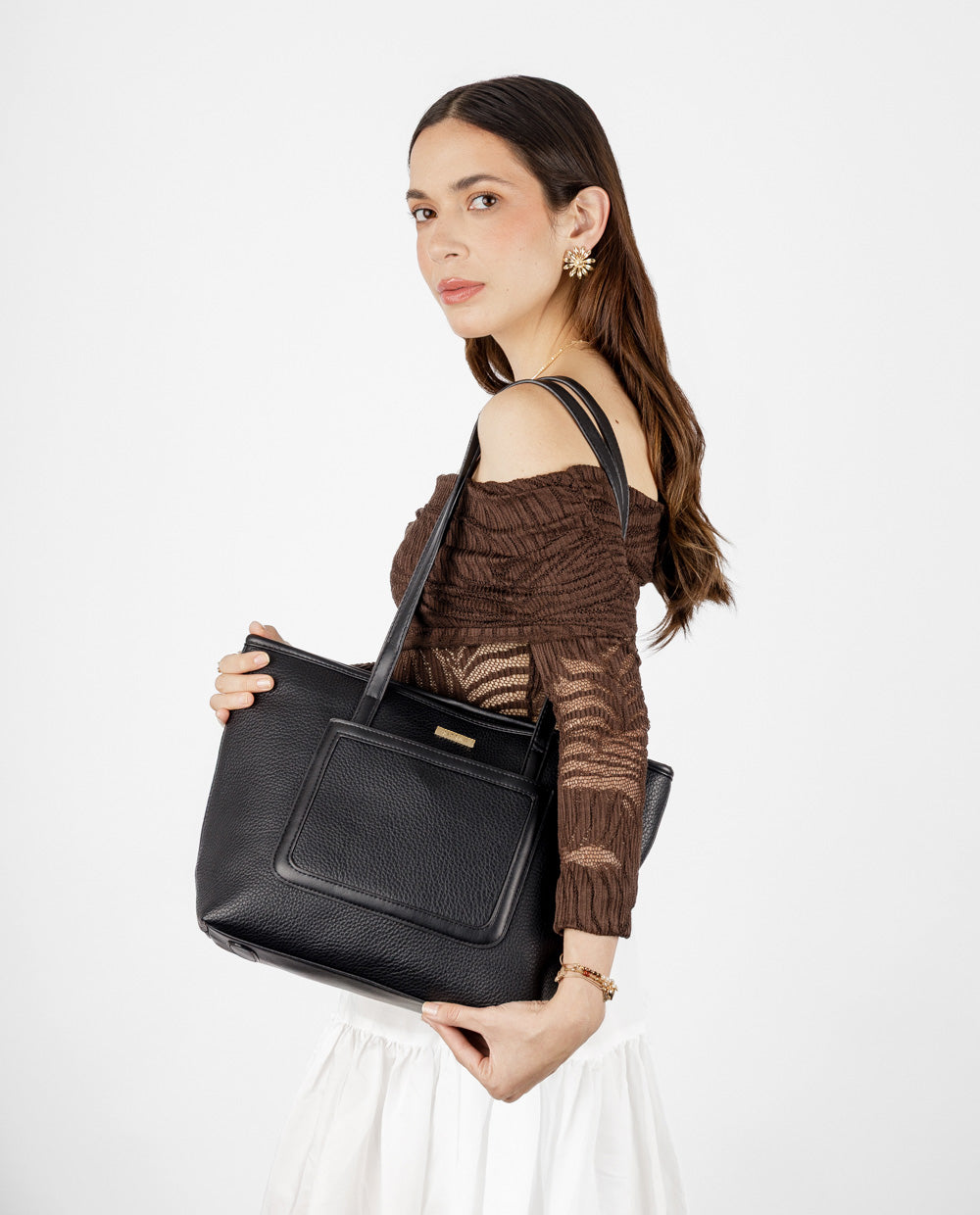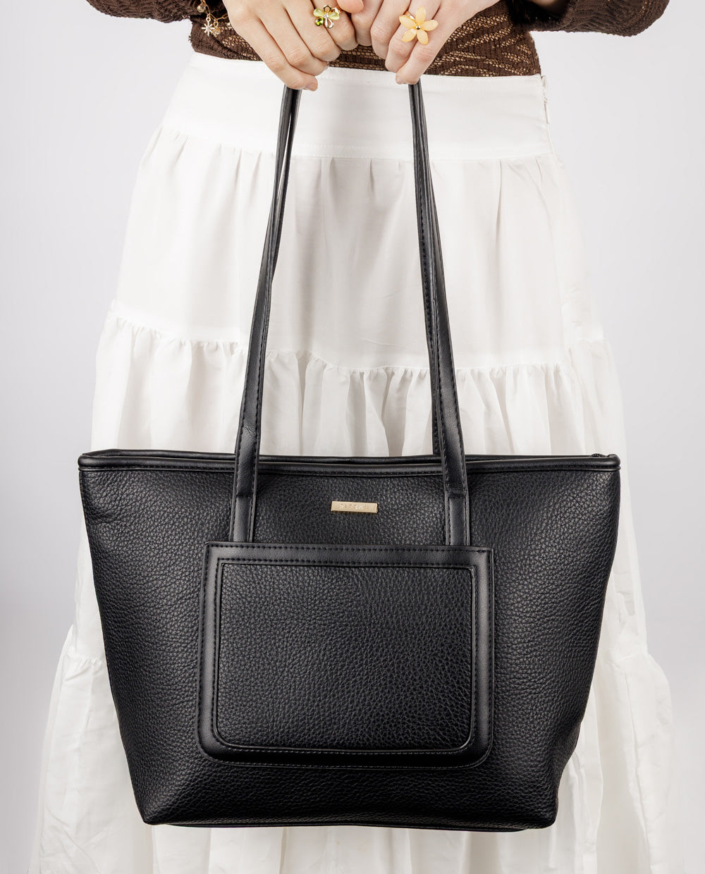 Una cartera tote elegante y práctica, confeccionada en material tipo cuero de textura suave, ideal para acompañarte desde el trabajo hasta tus planes after office. Su diseño espacioso incluye un cierre superior seguro, bolsillo posterior con cierre y un bolsillo frontal estructurado para mantener a la mano tus esenciales. Sus asas largas permiten llevarla cómodamente al hombro, brindando funcionalidad y estilo a la vez.