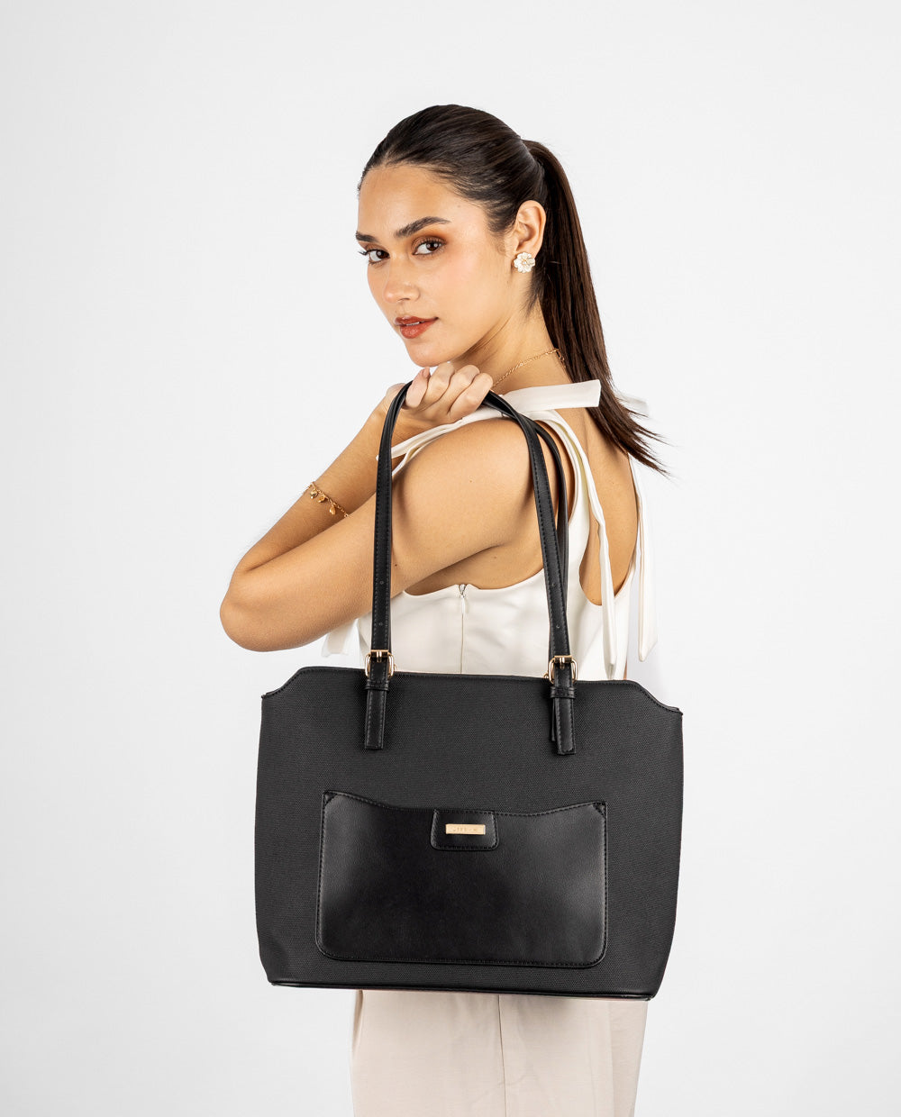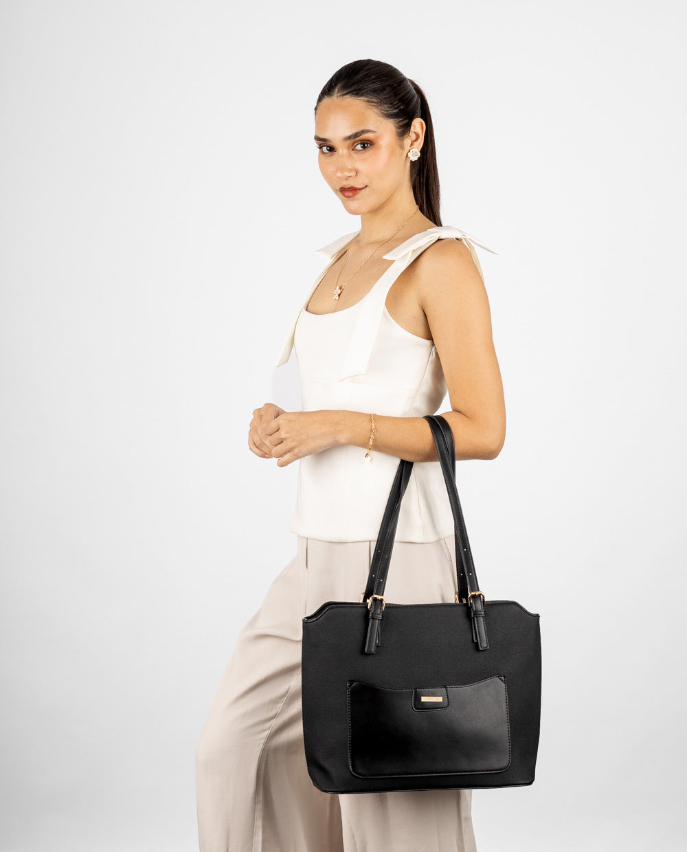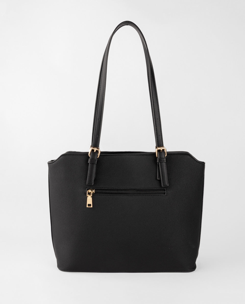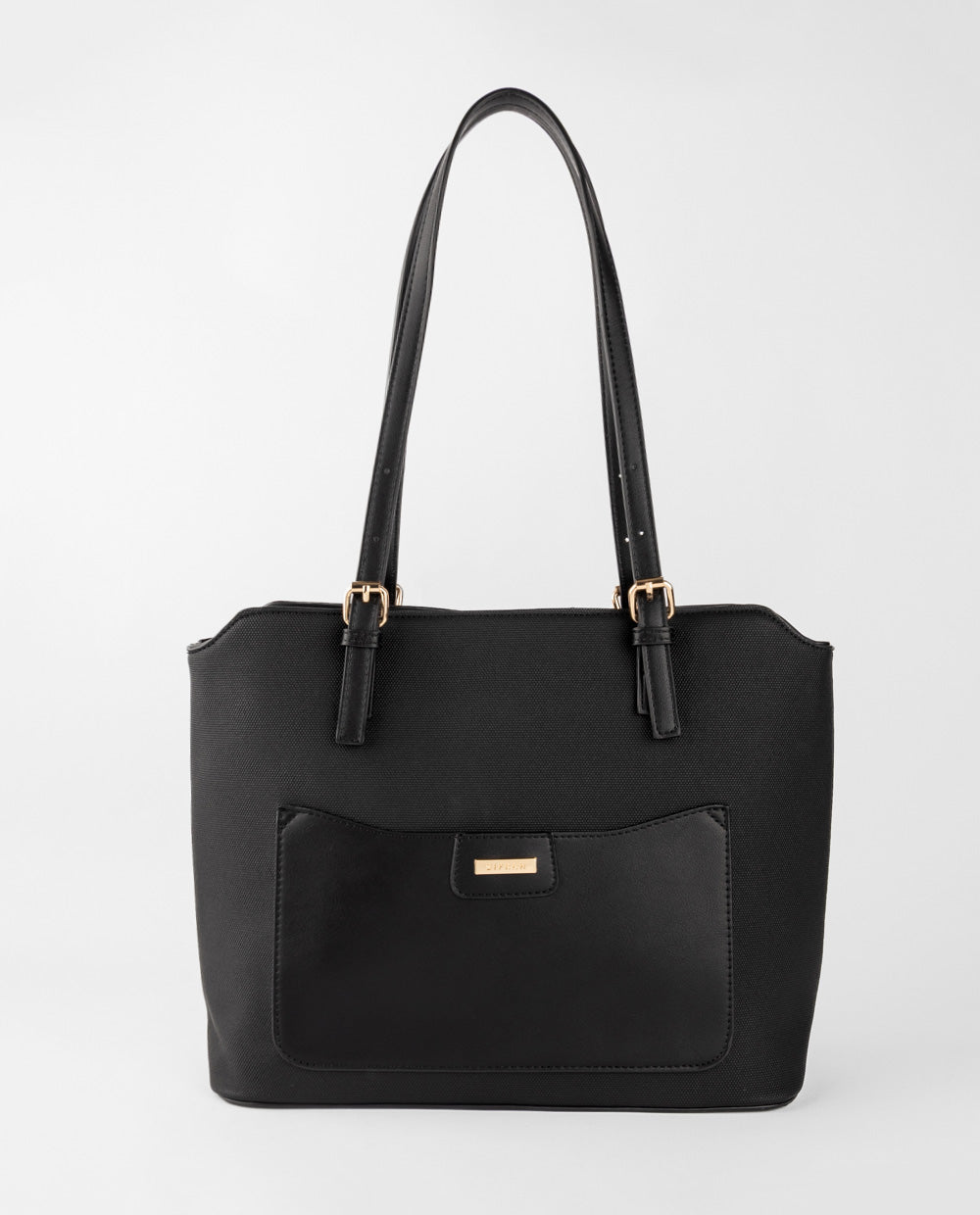 Cartera tote en material PU negro con bolsillo frontal negro y cierre posterior. Incluye asas largas en PU negro, resistentes y cómodas para llevarla al hombro.