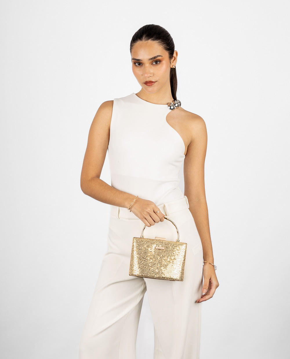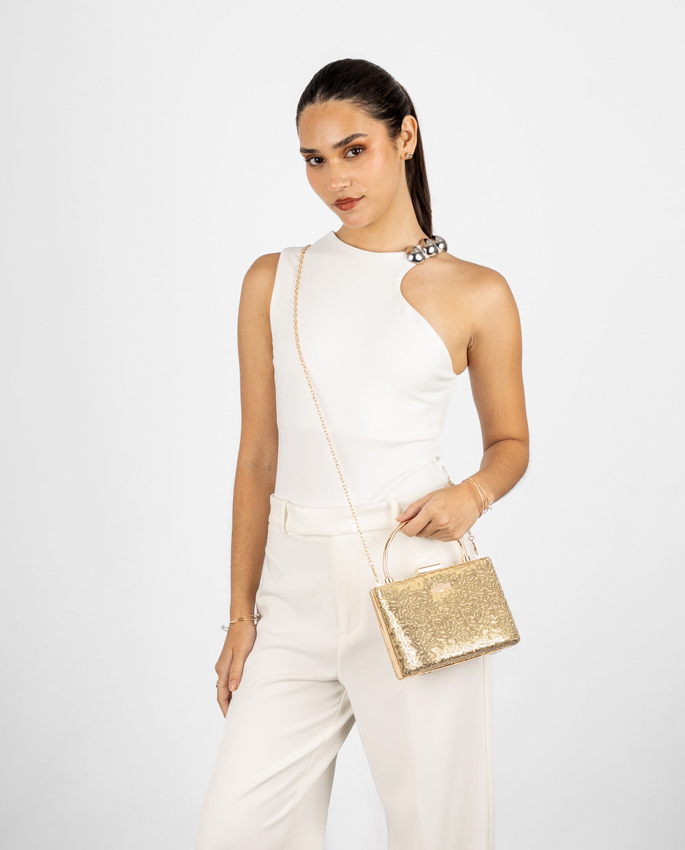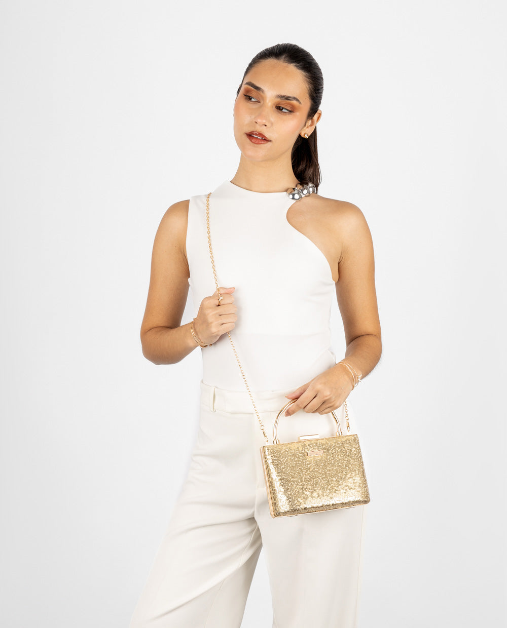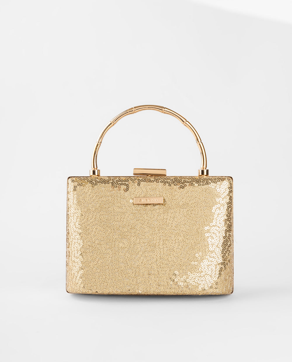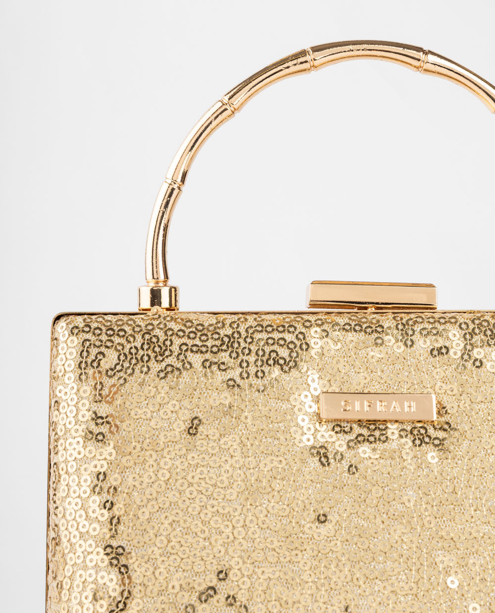 Cartera tipo vanité con exterior de lentejuelas doradas. Incluye asa metálica dorada, cierre superior y cadena desmontable para llevarla cruzada o de mano.
