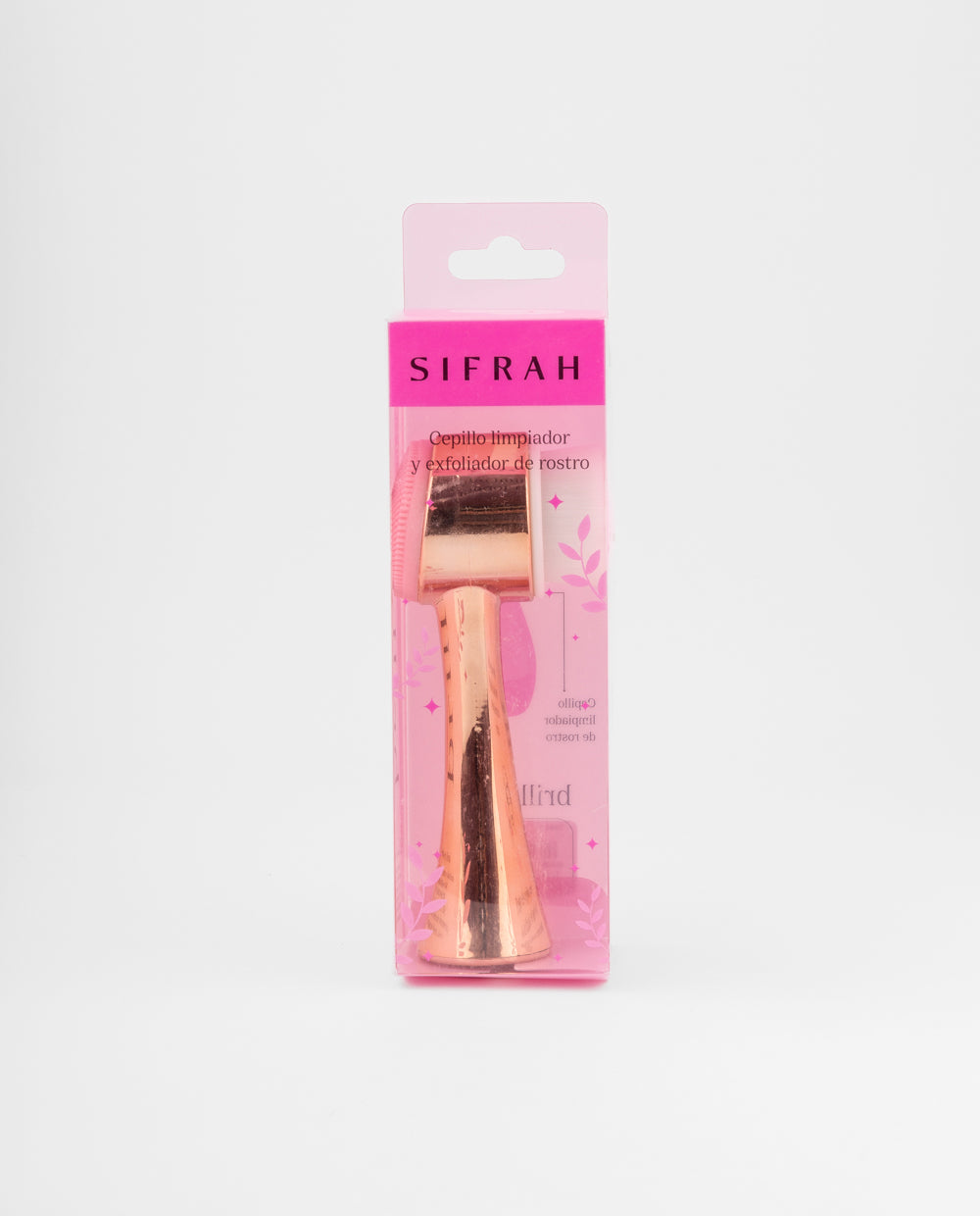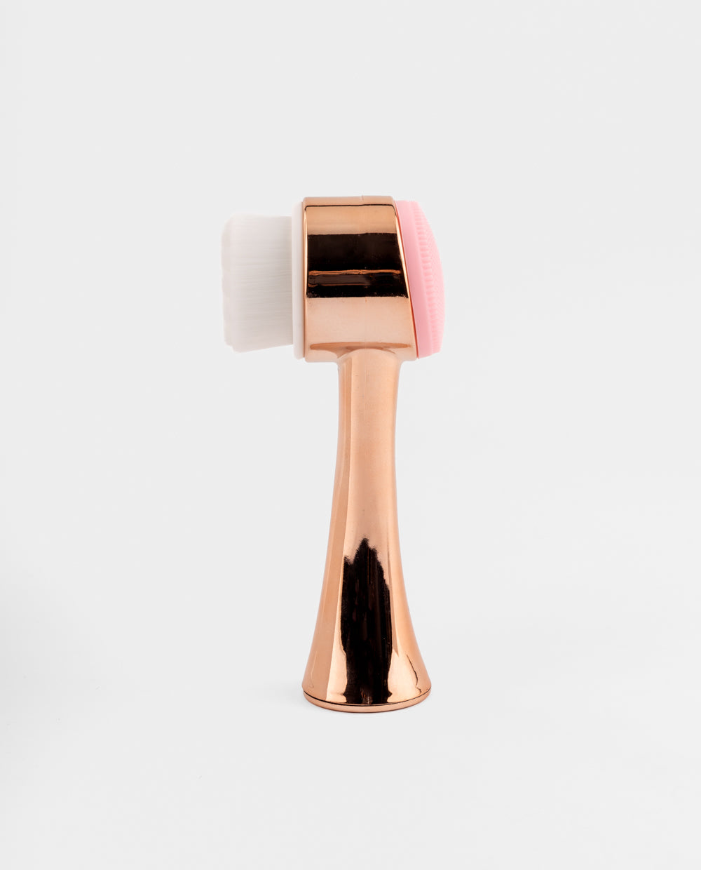 Cepillo facial de doble cara con mango rose gold, que combina cerdas ultrasuaves para una limpieza profunda y una superficie de silicona para exfoliar delicadamente.