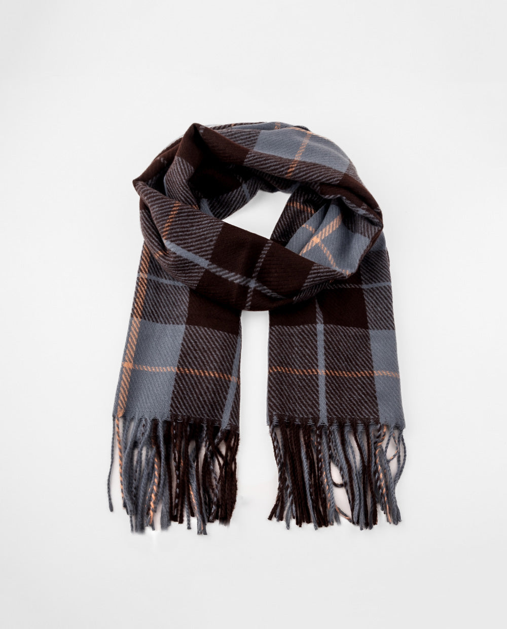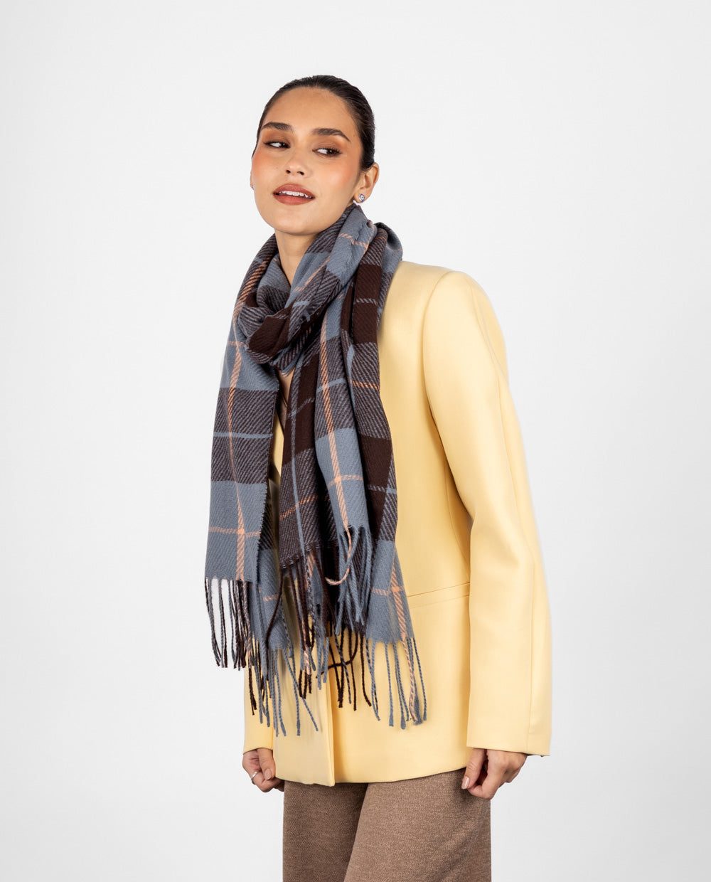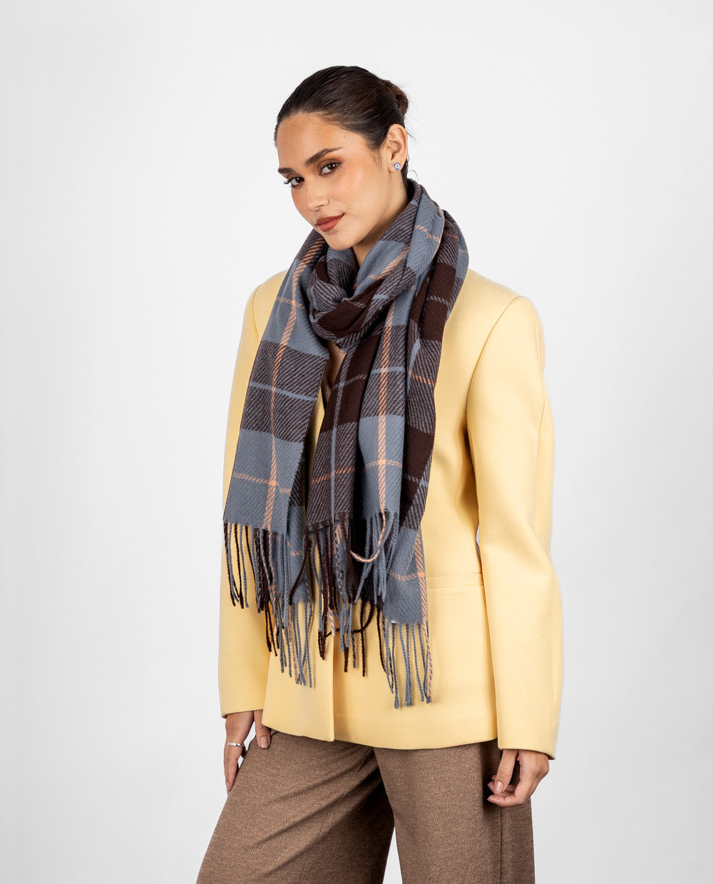 Chalina en tonos marrón y gris con diseño a cuadros y líneas sutiles en contraste. Su textura suave la convierte en el complemento ideal para mantenerte abrigada sin perder estilo. Los flecos al borde le suman un aire moderno y casual, perfecta para realzar outfits urbanos y de media estación.