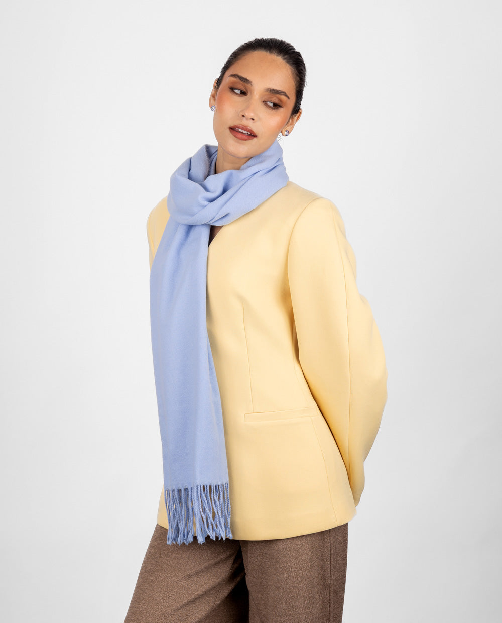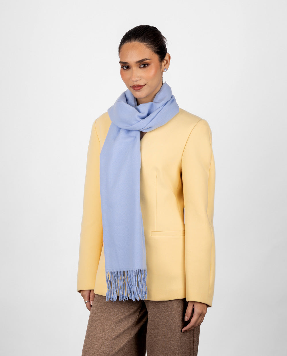 Chalina en tono celeste, fresca y femenina, perfecta para darle un toque de color suave a tu look. Su textura ligera y suave brinda abrigo sin perder comodidad, ideal para los días fríos de temporada. Los flecos al borde aportan un acabado moderno y versátil, fácil de combinar con outfits casuales o más elegantes.