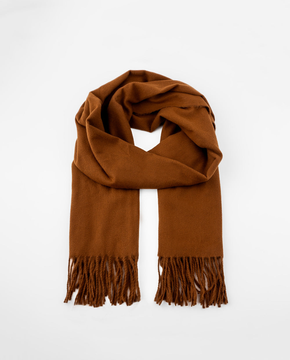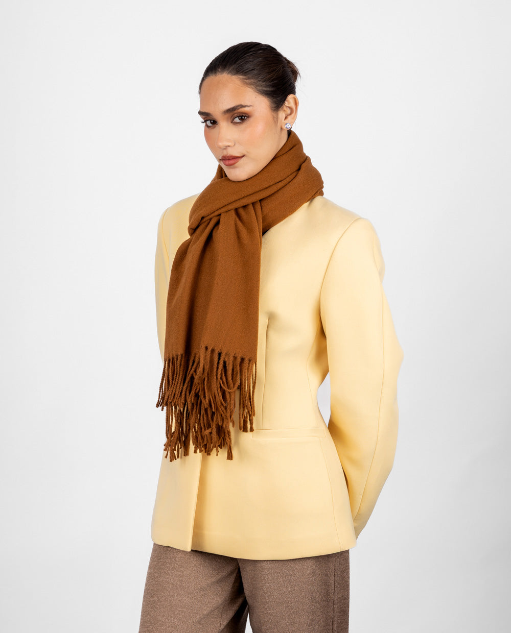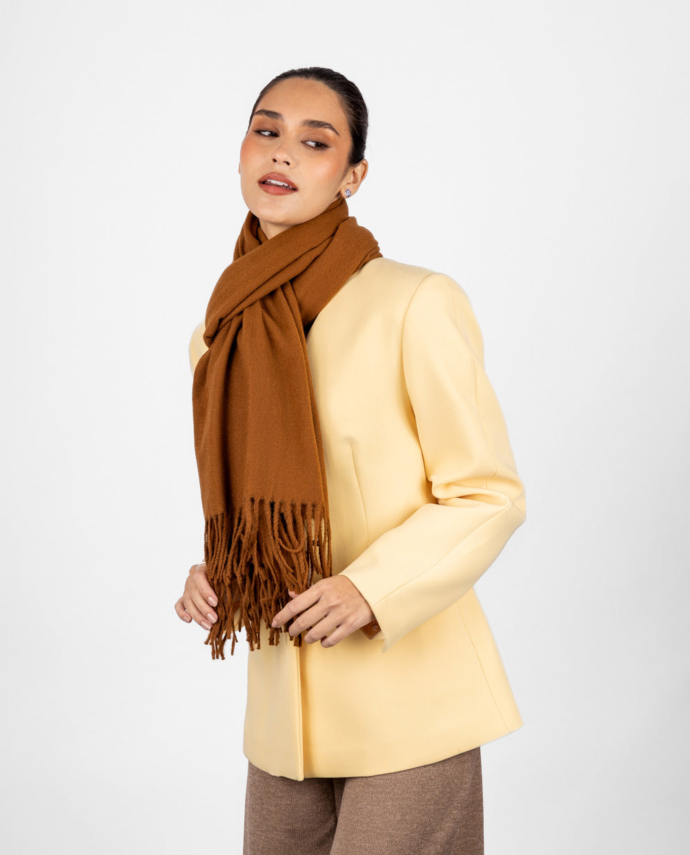 Chalina en color marrón, un básico versátil que combina fácilmente con diferentes estilos y colores. Su textura suave aporta abrigo y confort, ideal para acompañarte en días fríos. Los flecos en los extremos le dan un acabado moderno, convirtiéndola en el accesorio perfecto para elevar tus looks casuales o elegantes.
