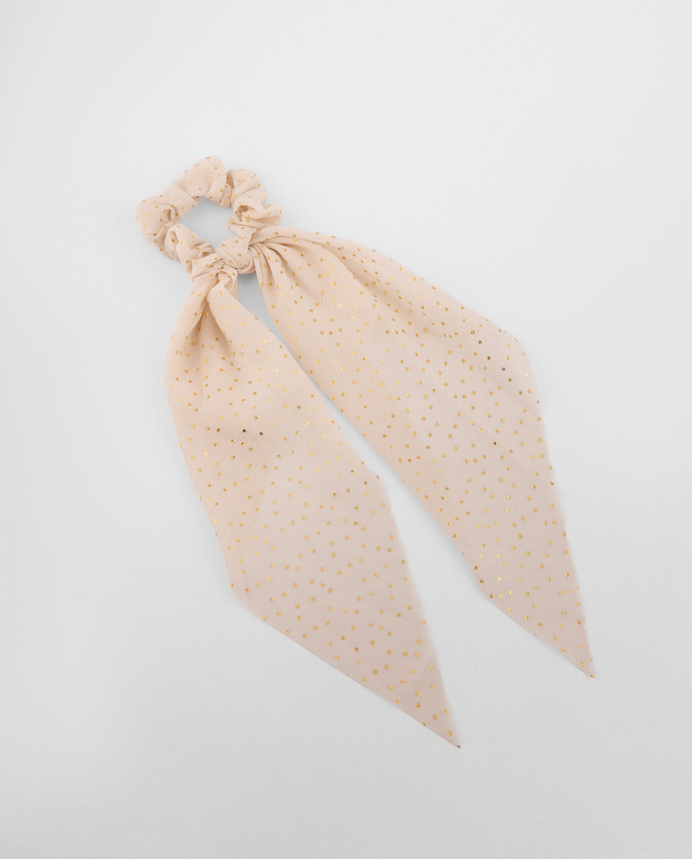 Colet beige con pañuelo integrado en tela ligera con estampado de puntos dorados; su caída fluida permite usarlo como lazo decorativo para peinados.