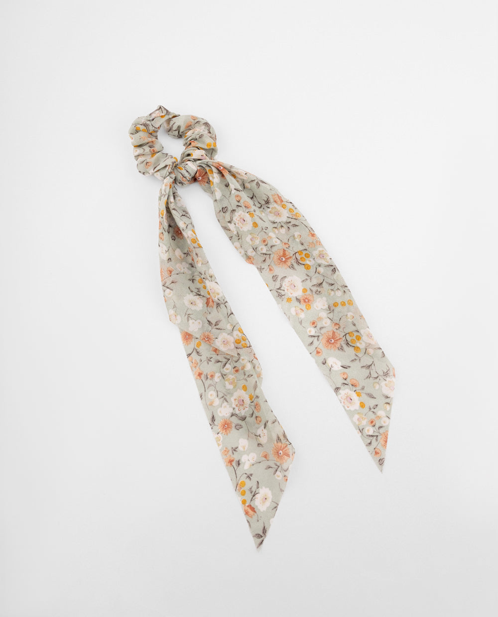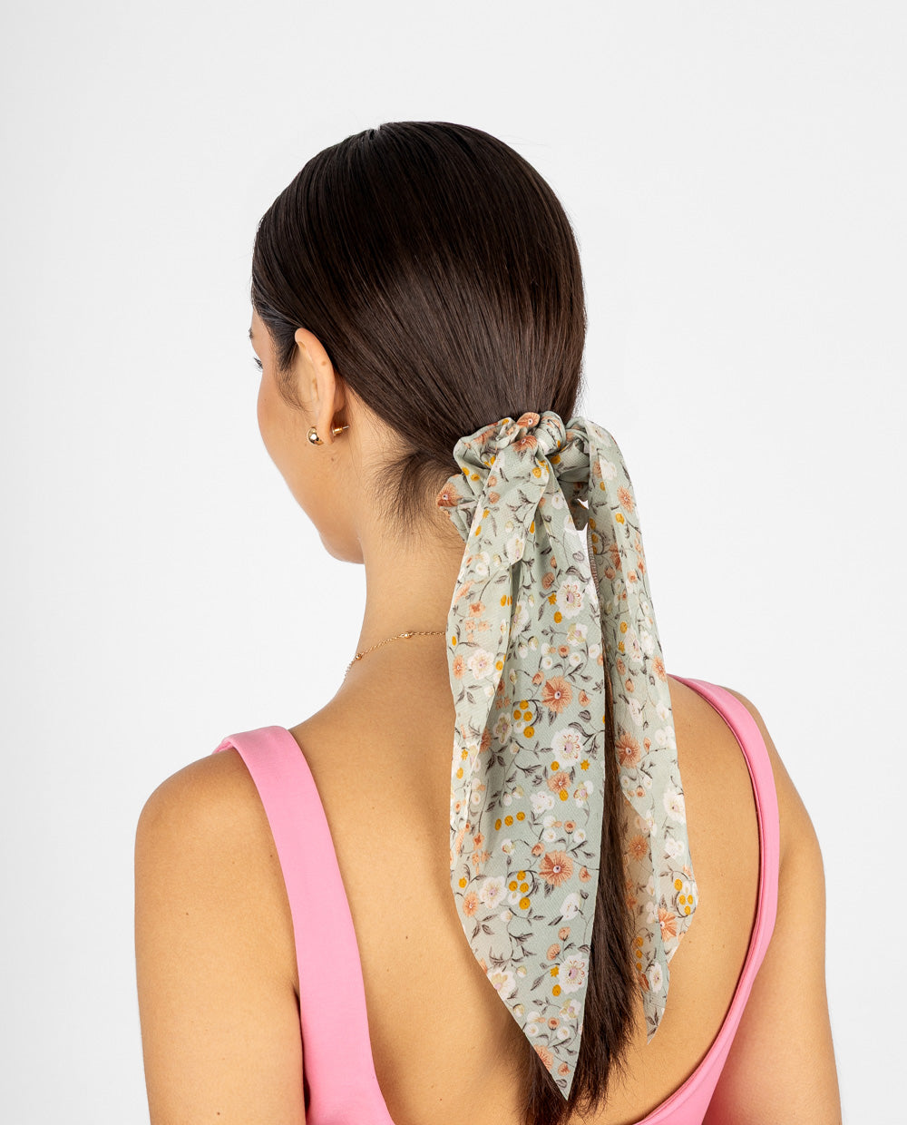 Colet con pañuelo integrado en tela ligera de acabado semitransparente y estampado floral. Su caída suave permite usarlo como lazo decorativo.