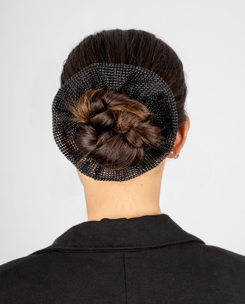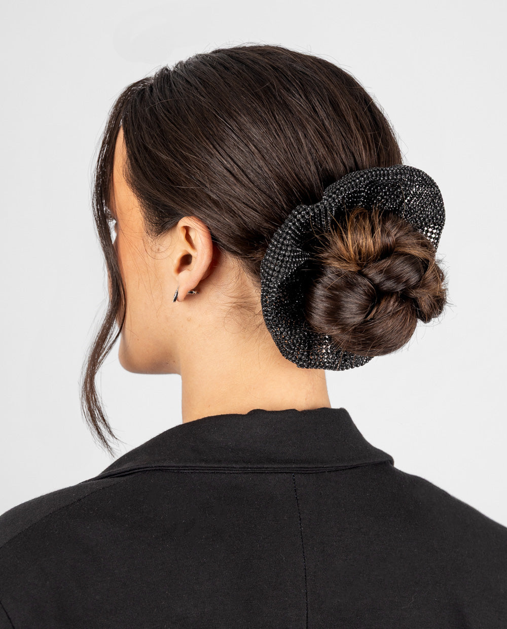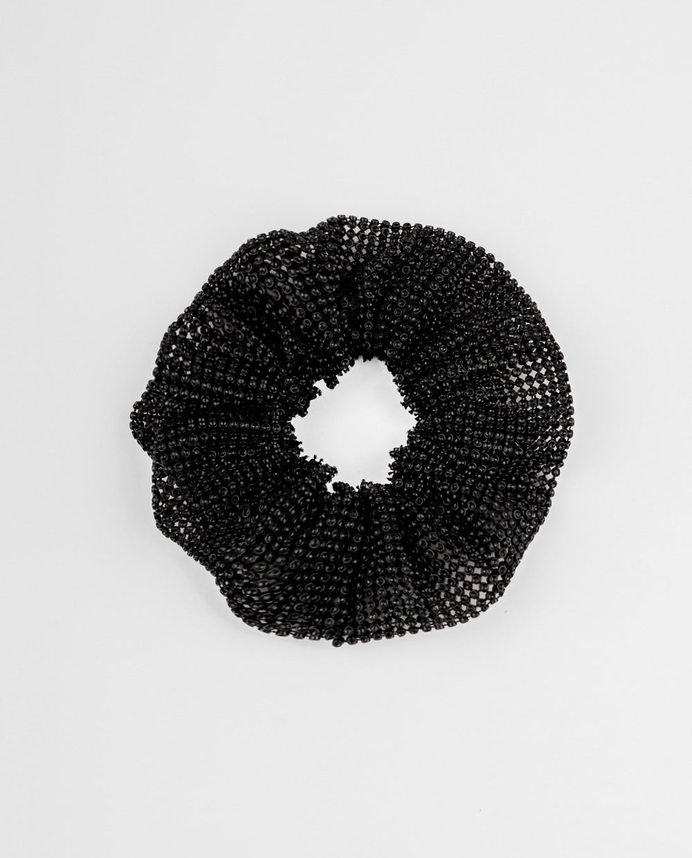 Ideal para realzar peinados altos o coletas elegantes, esta scrunchie negro con detalles de brillos aporta un toque glam a cualquier look. Su textura llamativa y diseño cómodo la hacen perfecta para eventos, fiestas o para brillar en tu día a día. ¡Atrévete a destacar desde el cabello!
