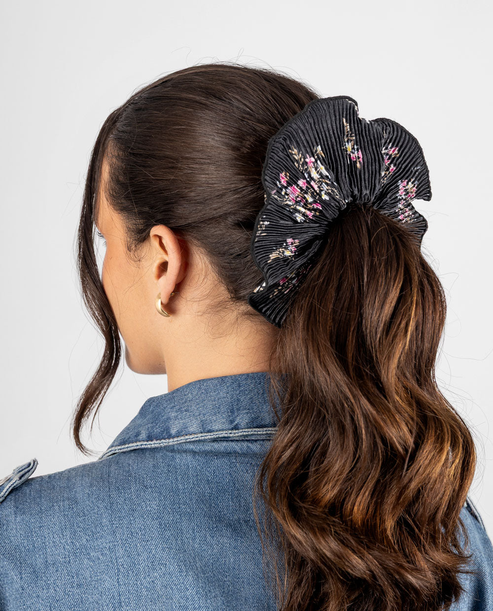 Este scrunchie con textura plisada y estampado floral combina suavidad y firmeza para sujetar tu cabello con estilo. Ideal para peinados altos o semi recogidos, su diseño en tono negro con flores aporta un toque romántico y versátil. Perfecto para elevar tu look del día a día sin maltratar tu melena.
