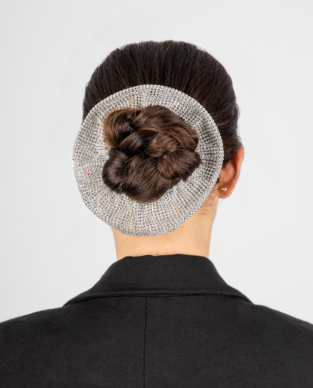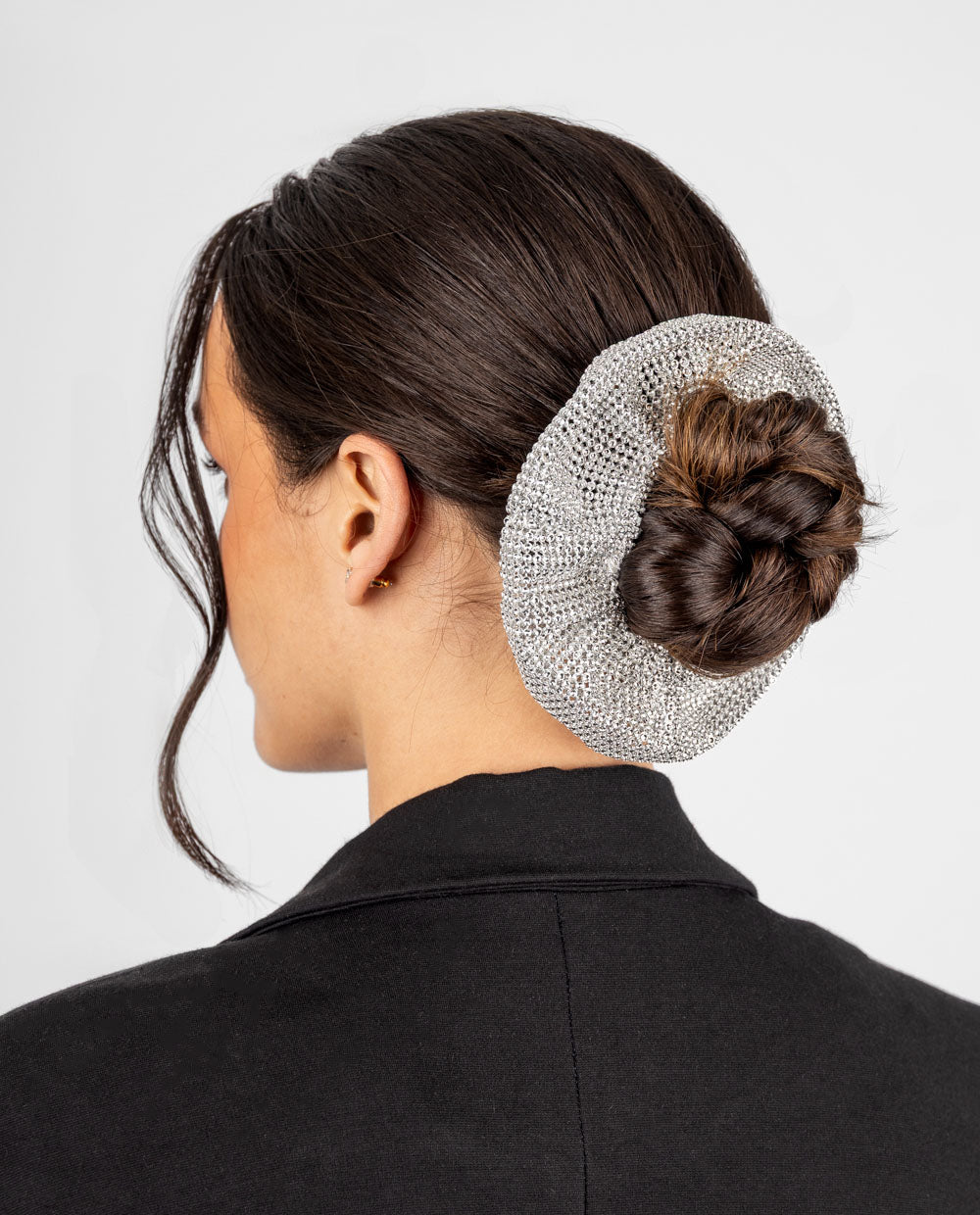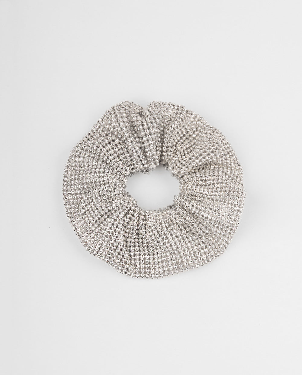 Ideal para realzar peinados altos o coletas elegantes, esta scrunchie plateada con detalles de brillos aporta un toque glam a cualquier look. Su textura llamativa y diseño cómodo la hacen perfecta para eventos, fiestas o para brillar en tu día a día. ¡Atrévete a destacar desde el cabello!