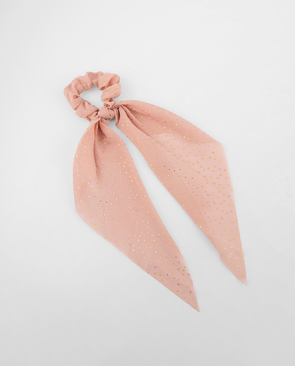 Colet rosado con pañuelo integrado en tela ligera. Su caída suave permite usarlo como lazo decorativo.