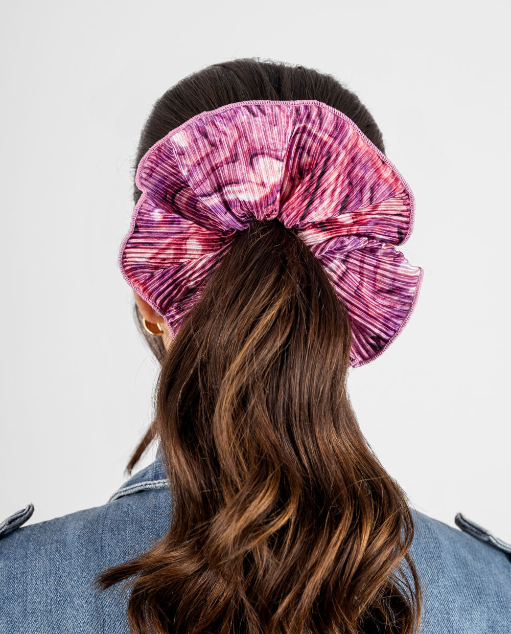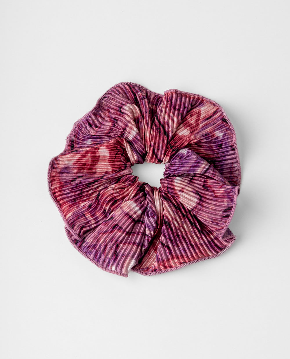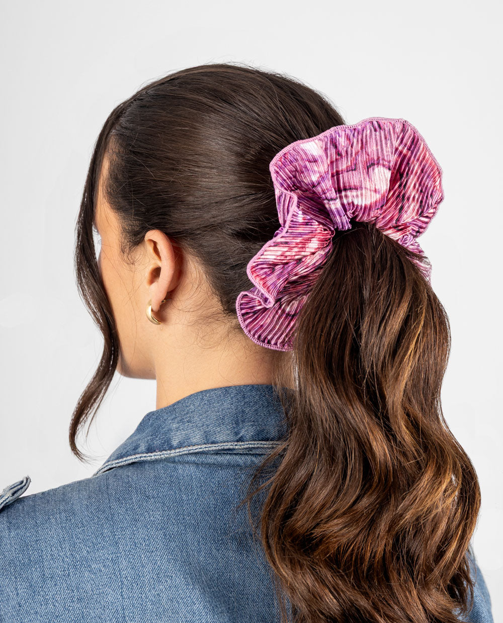 Este scrunchie con acabado plisado y estampado tie dye en tonos rosados y morados es el complemento perfecto para darle un toque vibrante a tu peinado. Ideal para sujetar el cabello sin dañarlo, gracias a su textura suave y diseño amplio. Úsalo en looks casuales o para destacar un recogido con estilo.