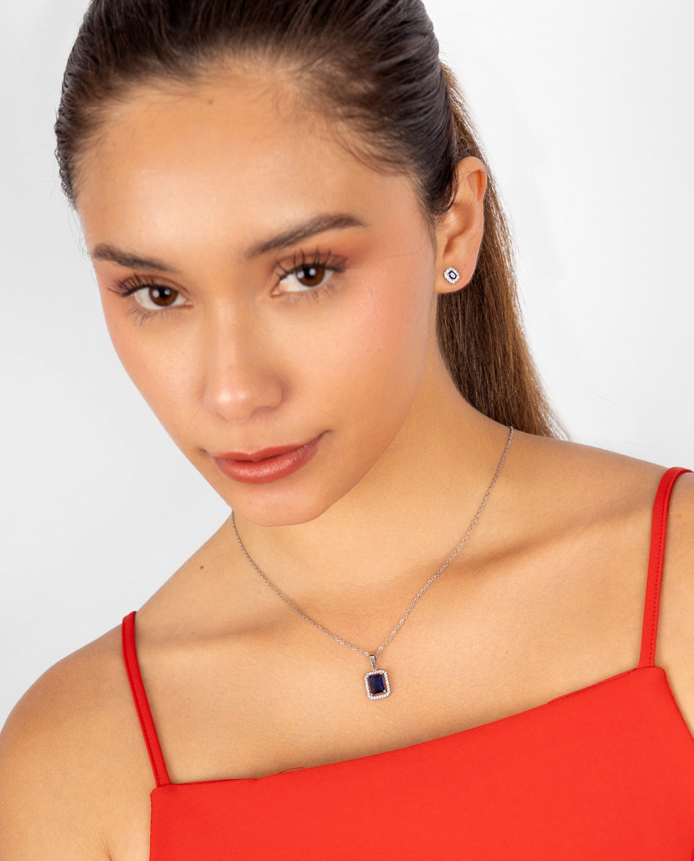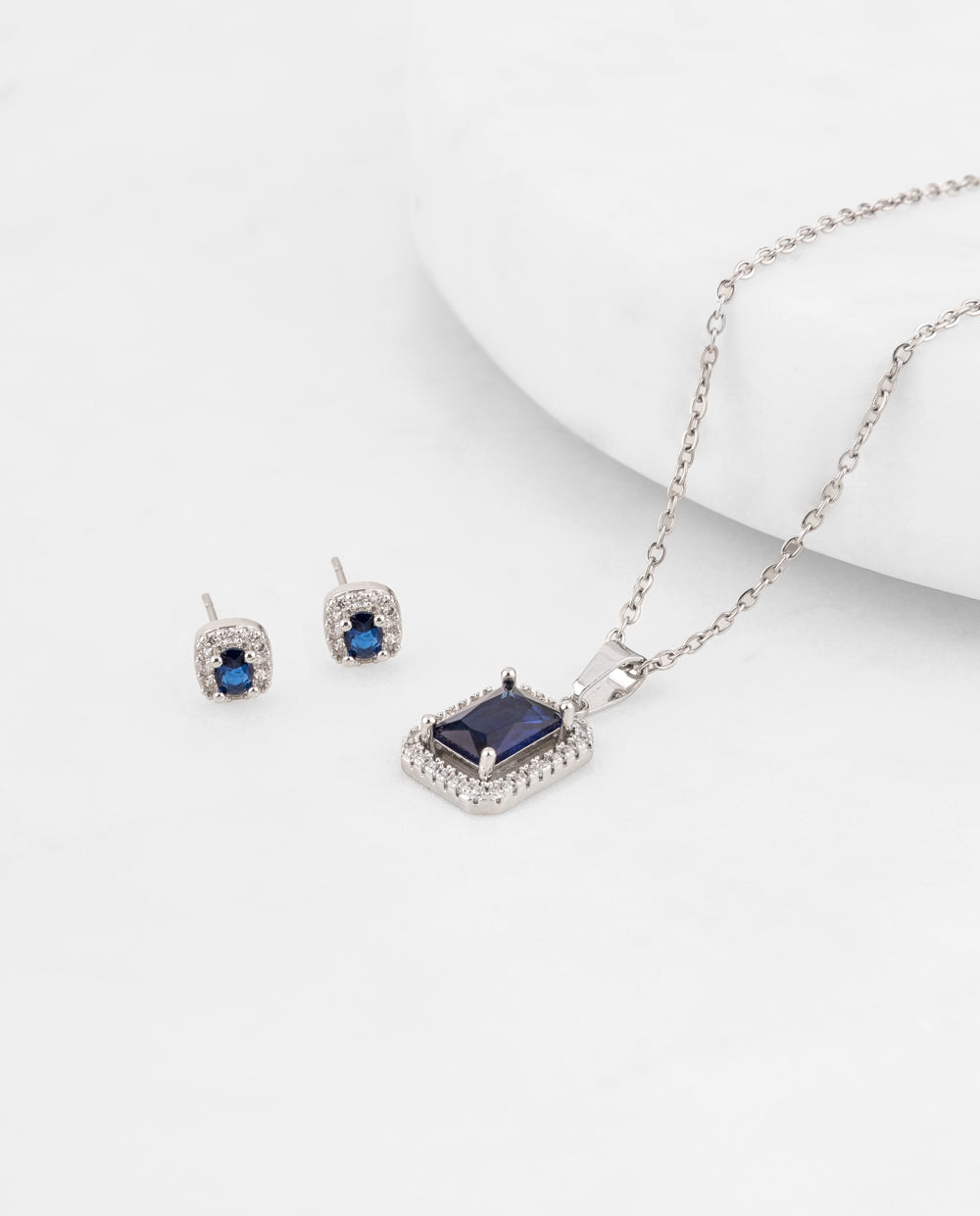 Set de collar y aretes plateados bañados en plata con piedra central azul intenso, rodeada de pedrería de zircón que potencia su brillo, durabilidad y elegancia.