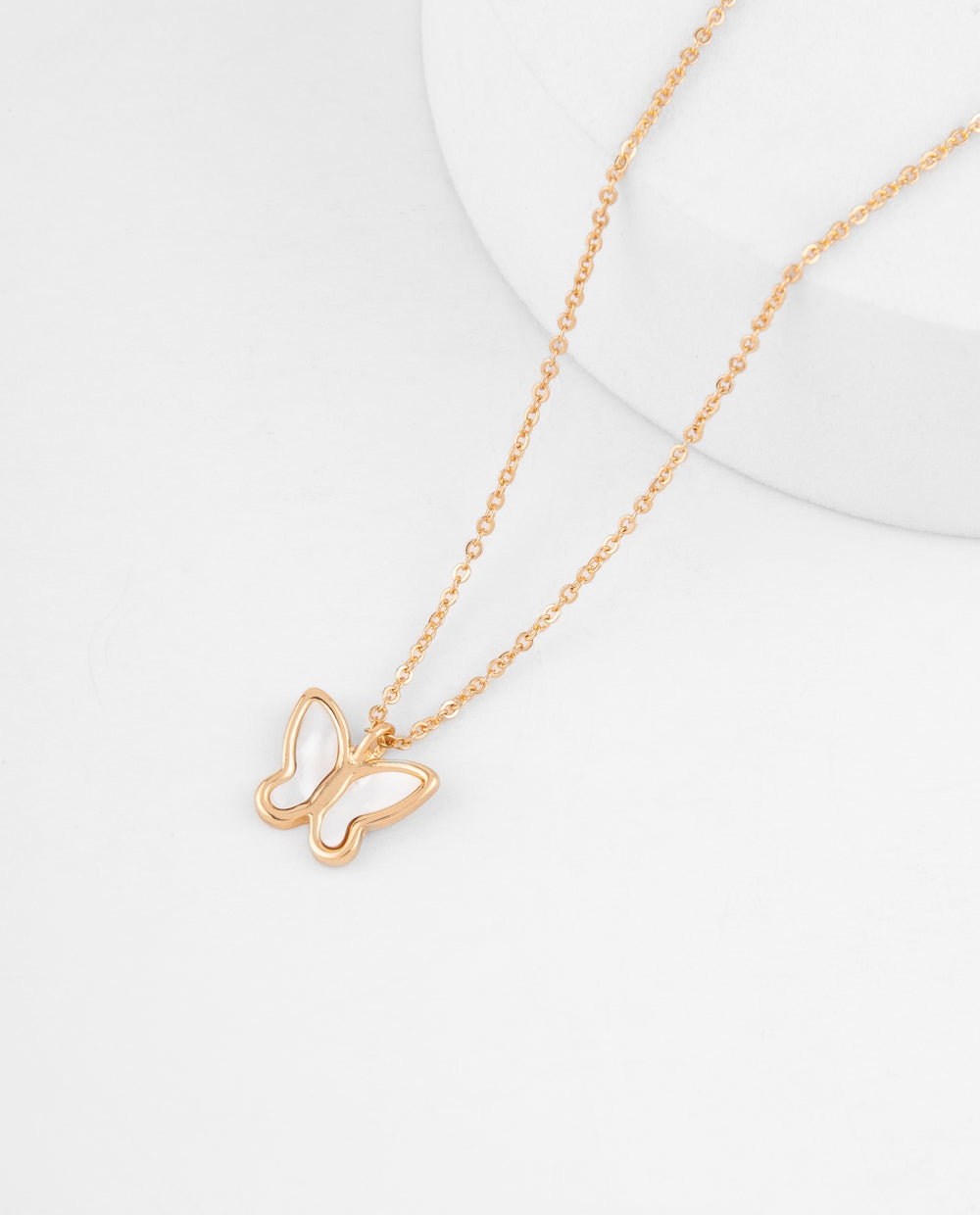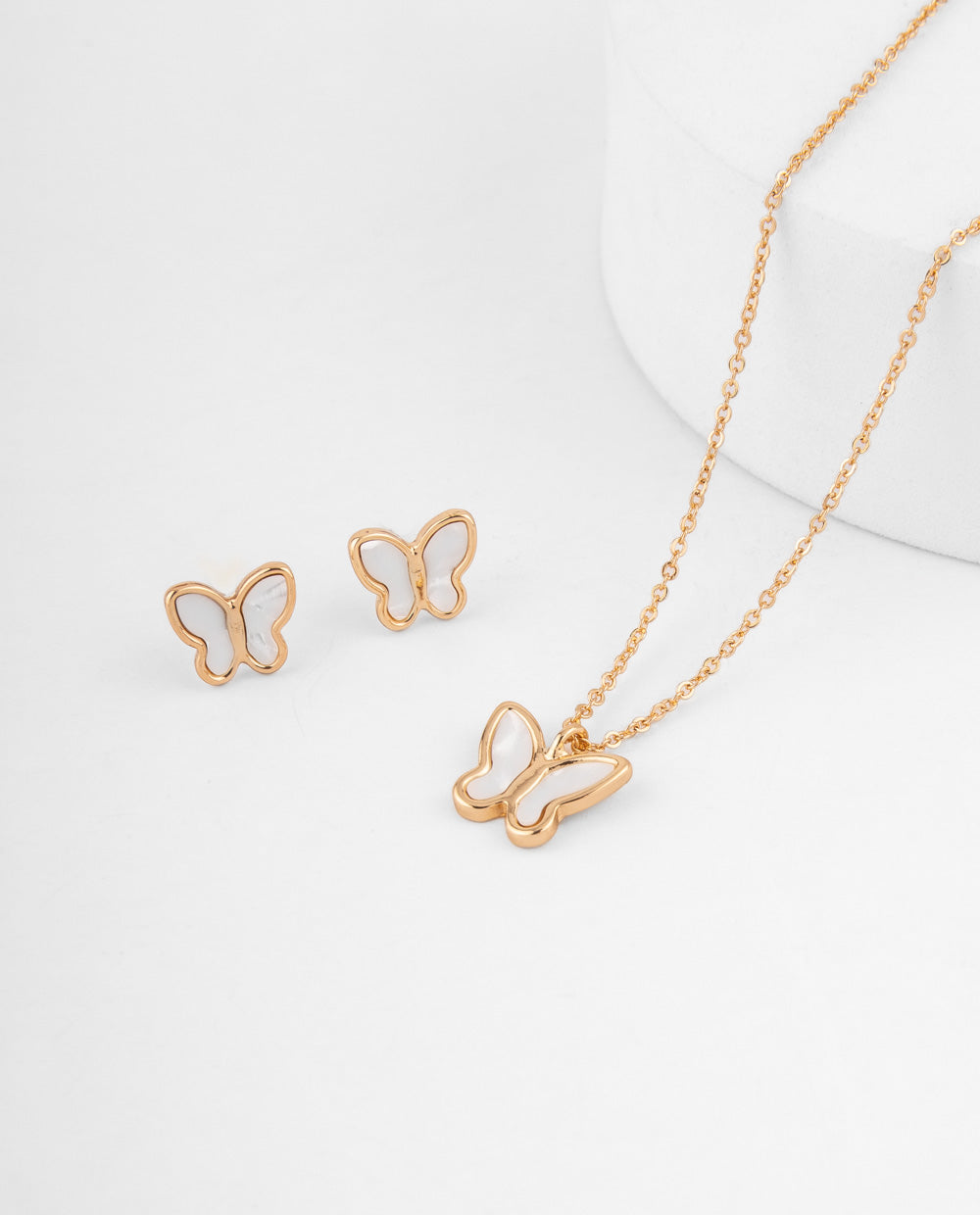 Set de collar y aretes en acabado dorado con diseño de mariposa esmaltada en blanco. Un accesorio delicado y femenino que simboliza transformación y libertad. Perfecto para usar en tu día a día con looks casuales o darle un aire romántico a un outfit especial.