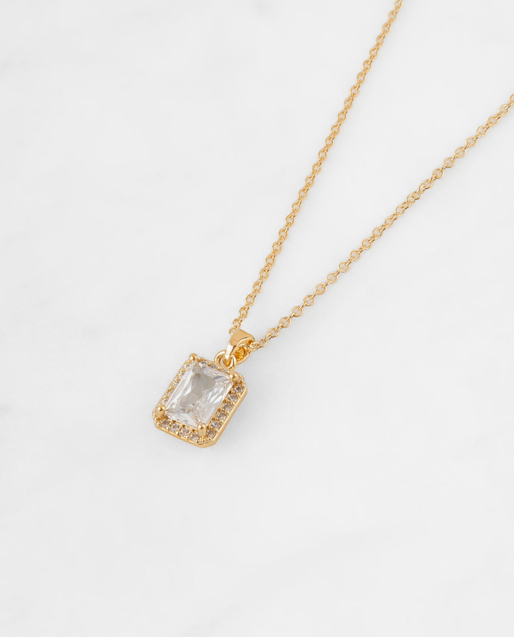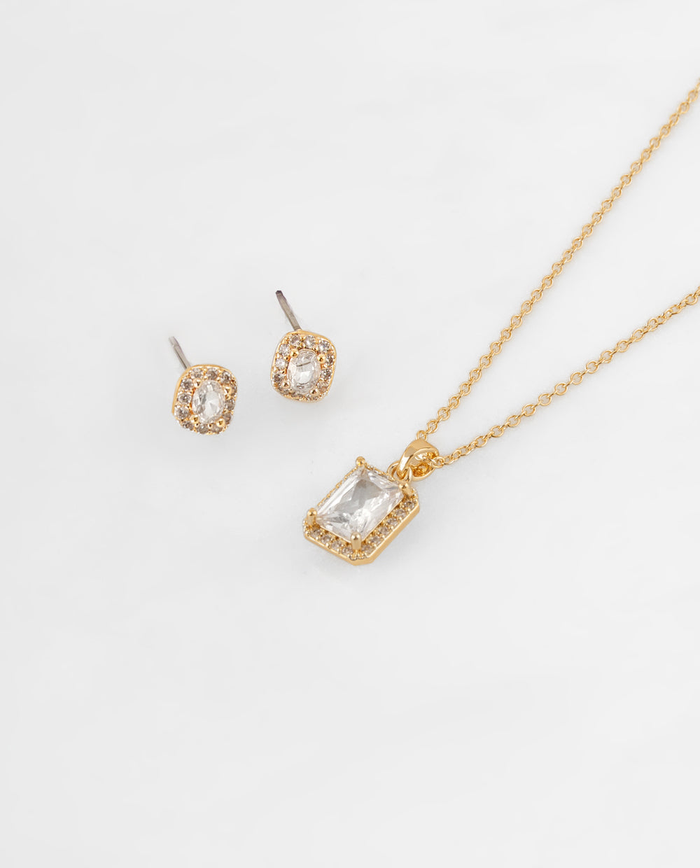 Este set incluye un collar con dije rectangular enmarcado en pedrería de zircón y aretes a juego con acabado brillante. Su baño en oro asegura un estilo elegante y duradero, perfecto para ocasiones especiales o para elevar un look diario. Una pieza de la colección Glow que refleja sofisticación y frescura con cada detalle.