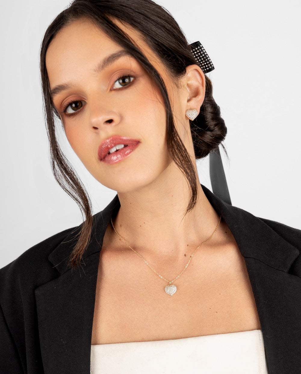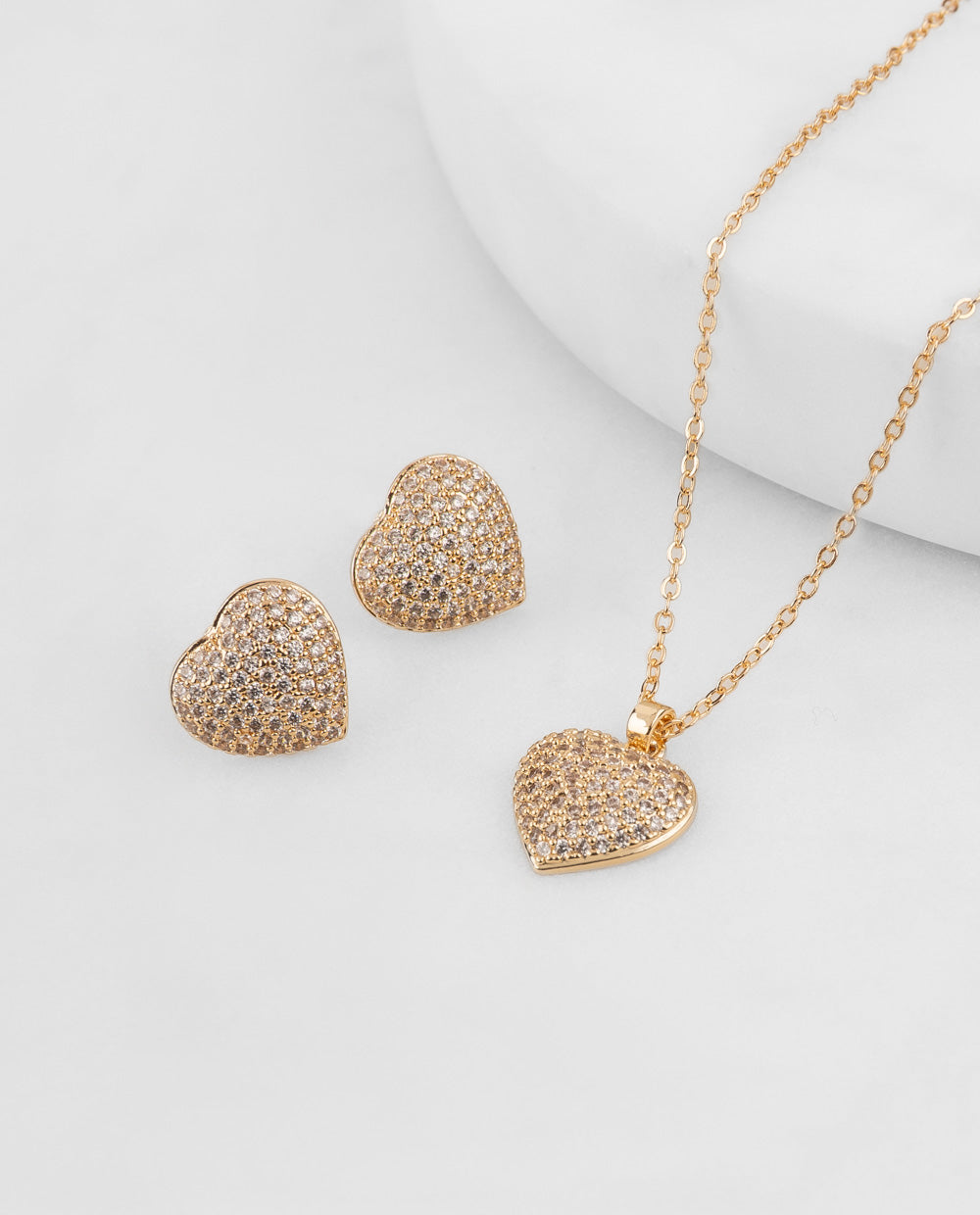 Romántico y lleno de brillo, este set de la colección Glow incluye collar y aretes en forma de corazón, completamente decorados con pedrería de zircón. Bañado en oro y con acabado elegante, es perfecto para regalar (o regalarte) un detalle que brille con amor y estilo todos los días.
