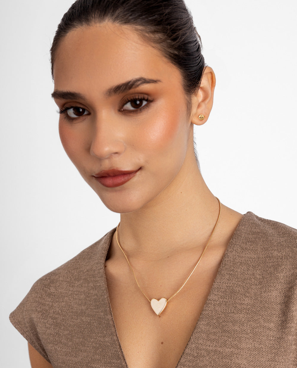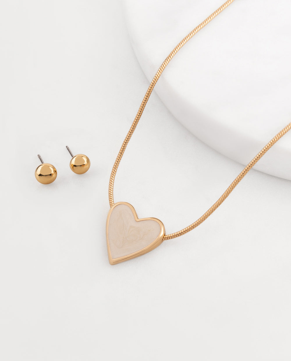 Este set incluye un elegante collar con dije de corazón en acabado nacarado y unos aretes tipo bolita, ambos bañados en oro. Pertenecen a nuestra colección Premium, elaborados con materiales hipoalergénicos, ideales para pieles sensibles. Una combinación delicada y versátil, perfecta para darle un brillo sutil y sofisticado a tu look diario o para complementar un estilo más especial.