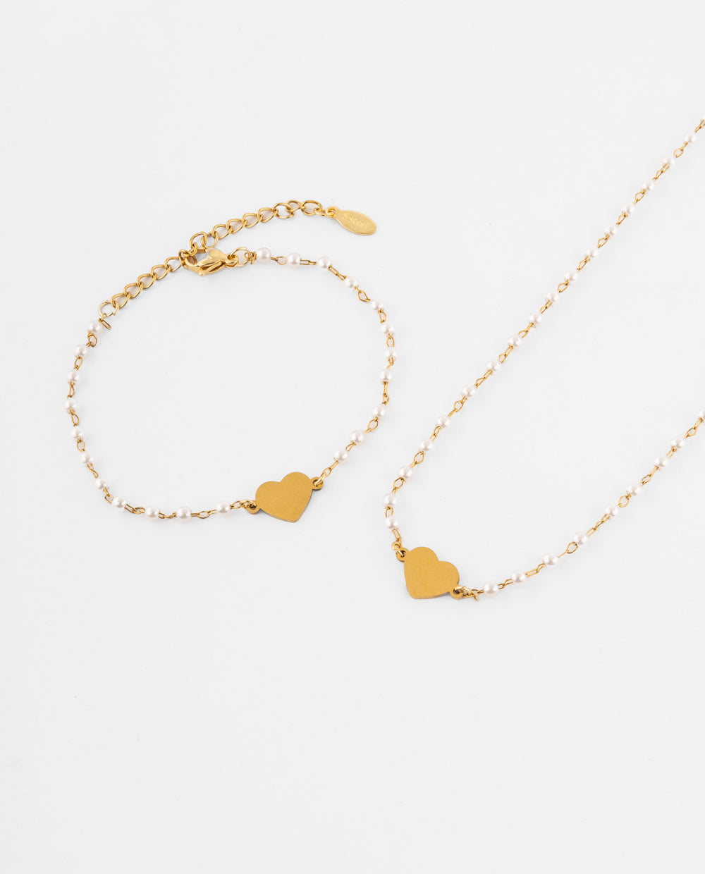 Collar y pulsera de acero inoxidable bañados en oro con cadena fina y dije corazón liso, un dúo resistente y perfecto para el día a día.