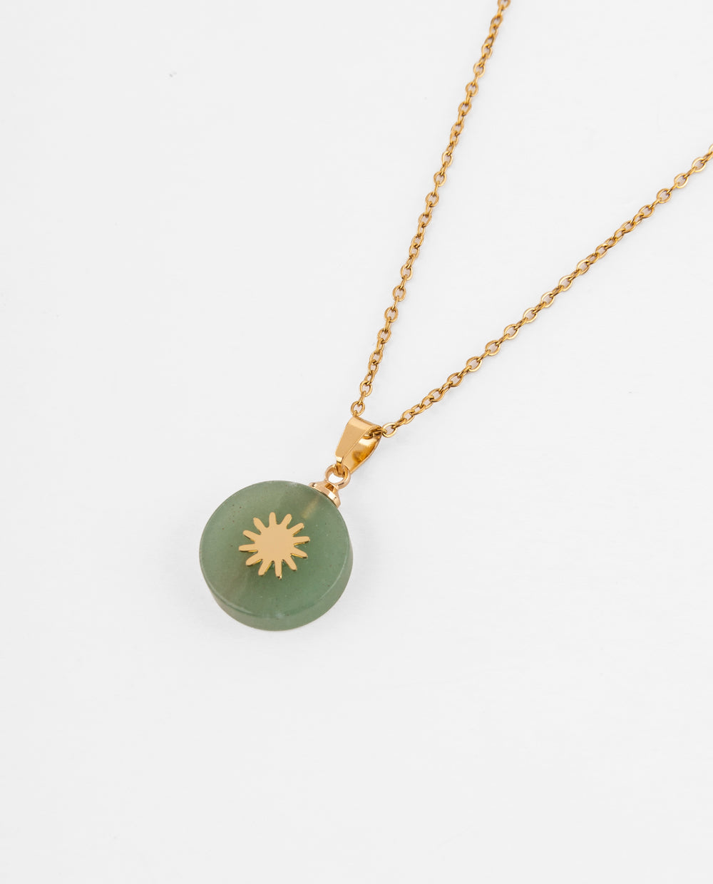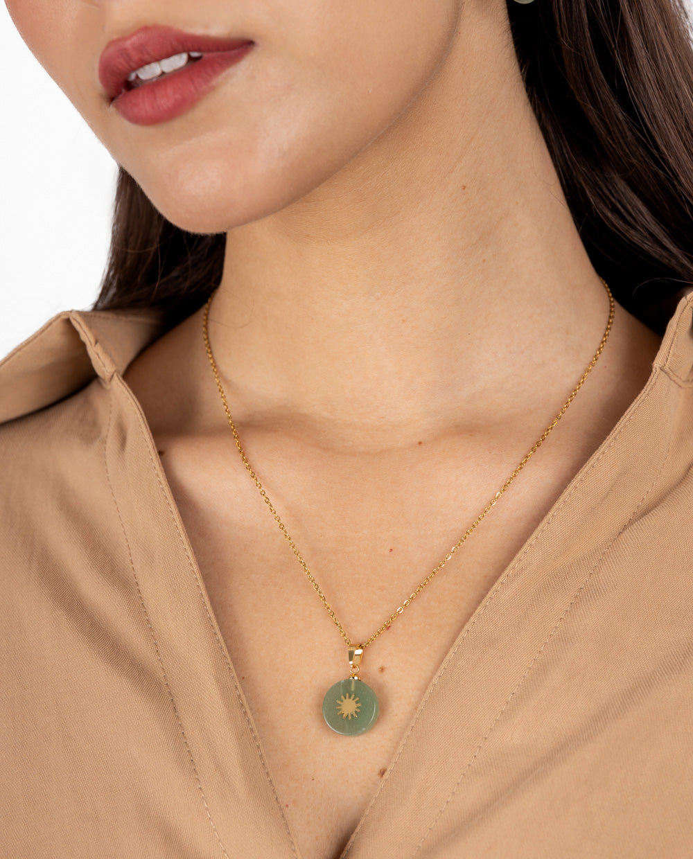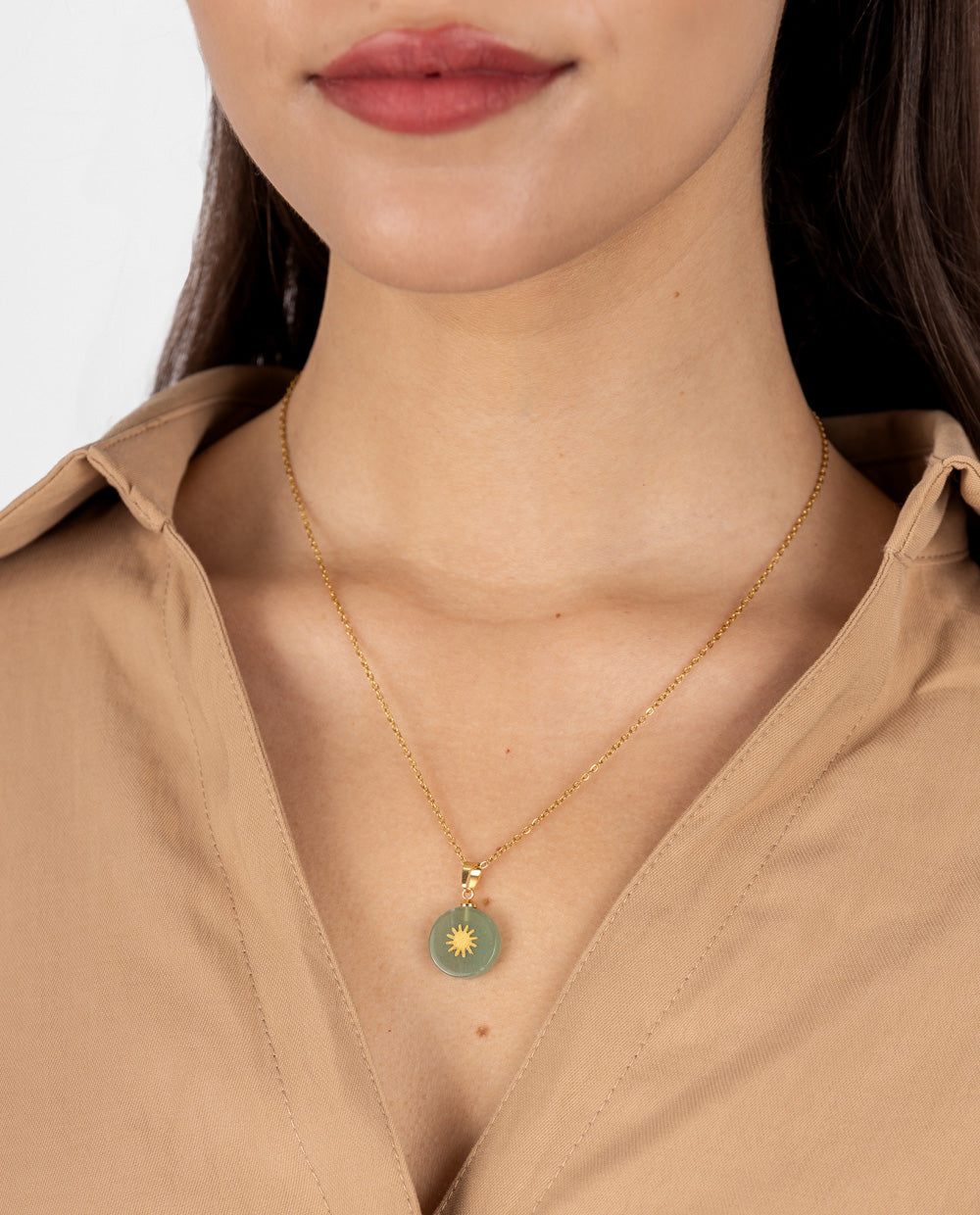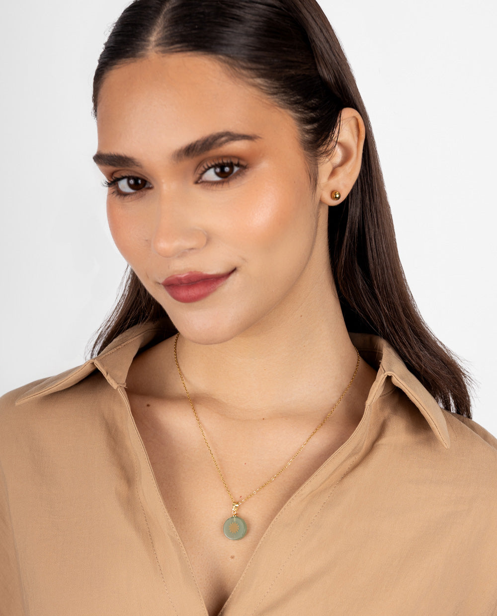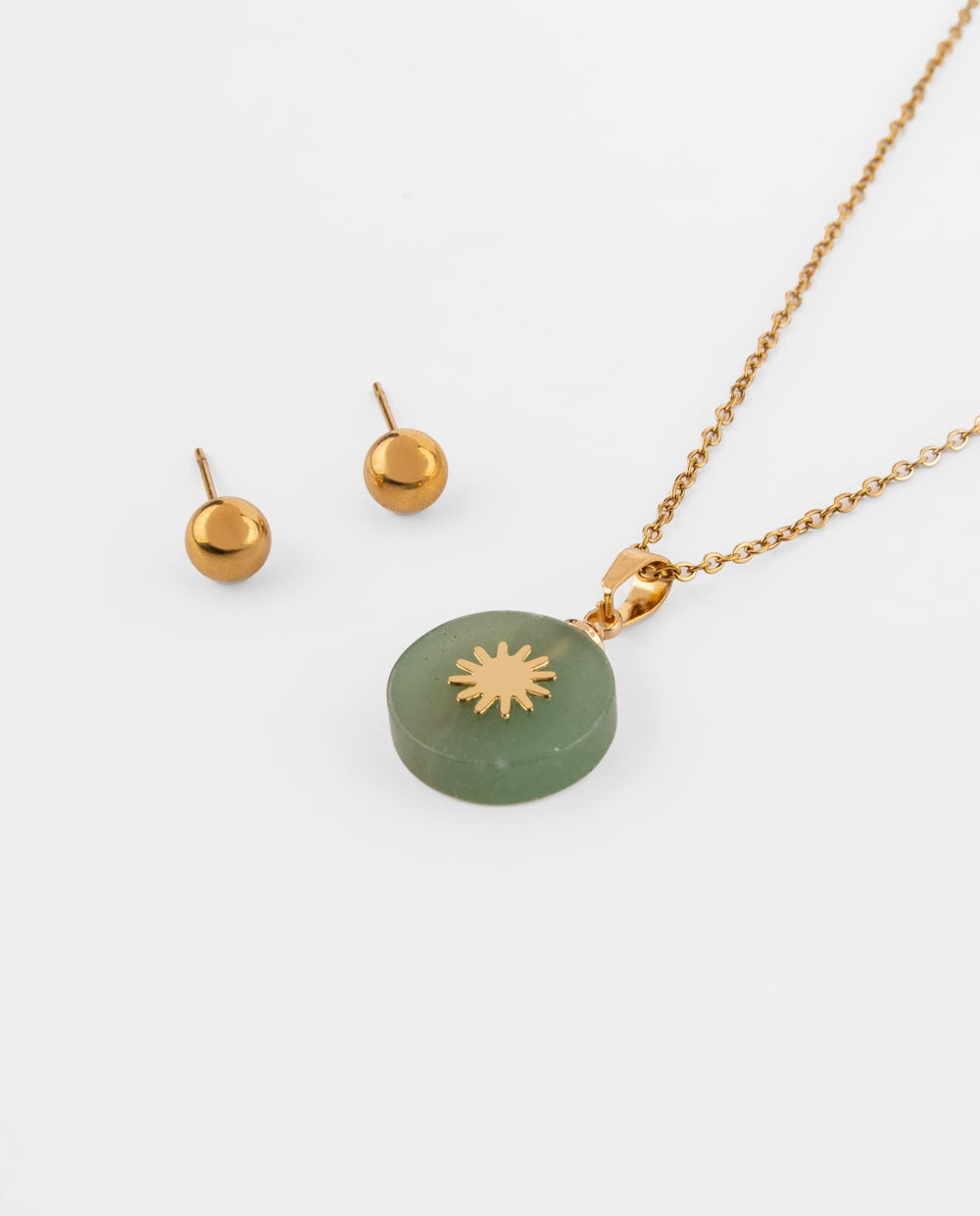 Set en acero inoxidable bañado en oro, con un collar que lleva un dije circular de cuarzo amazonita, resaltado con un detalle dorado en forma de sol. La amazonita, conocida como la piedra de la calma y la armonía, aporta un toque natural y especial a tu estilo. Los aretes tipo botón dorados complementan el look, ideal para elevar tus outfits diarios o dar un brillo único a la noche.