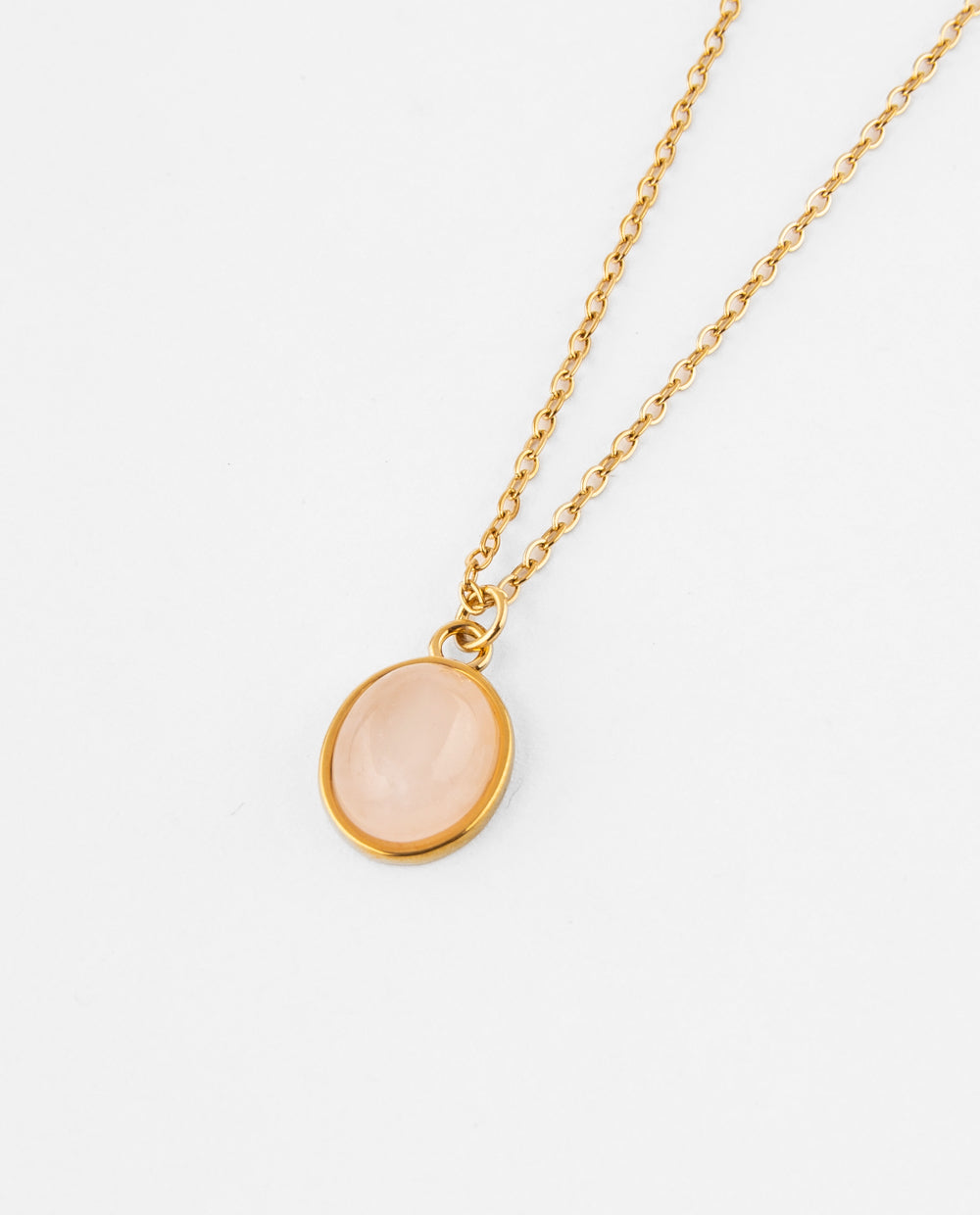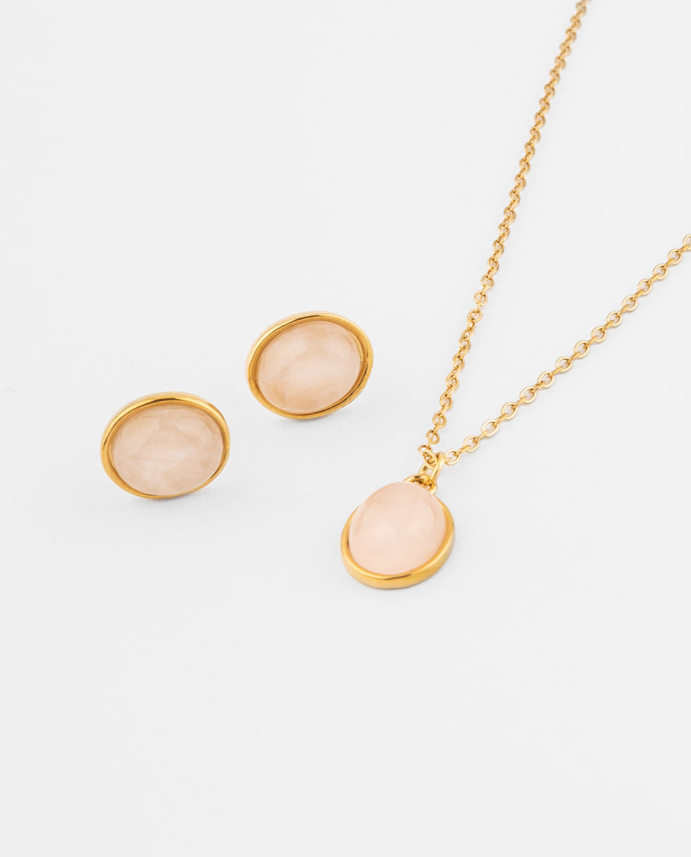 Collar de acero inoxidable dorado bañado en oro con dije de cuarzo rosa y aretes tipo stud a juego, resistente y fácil de combinar.