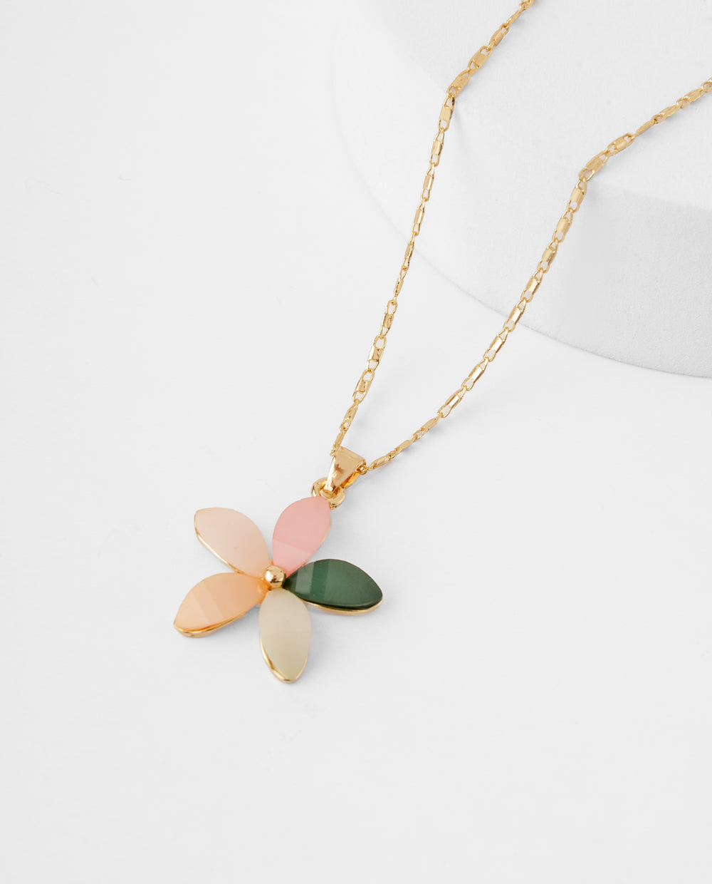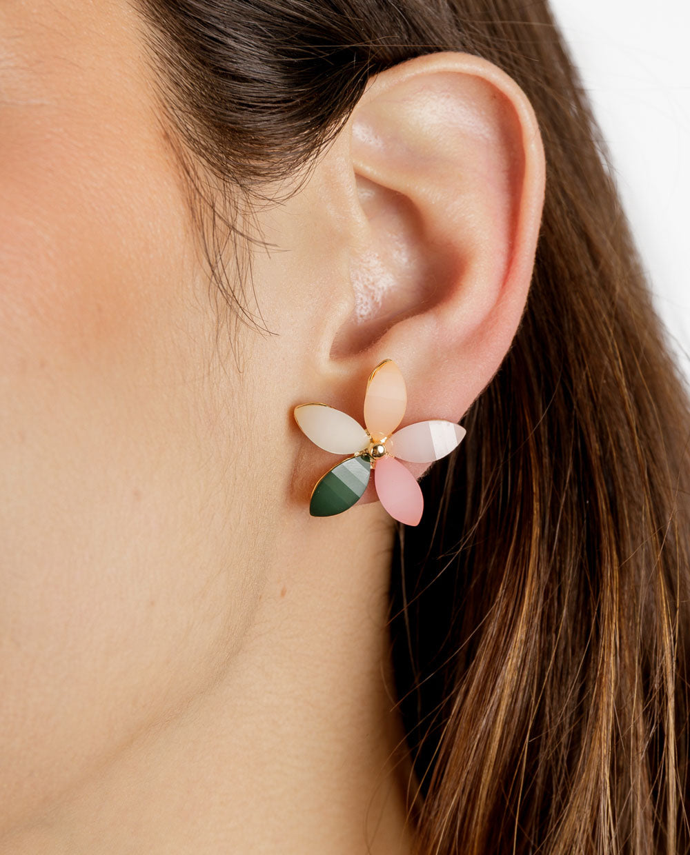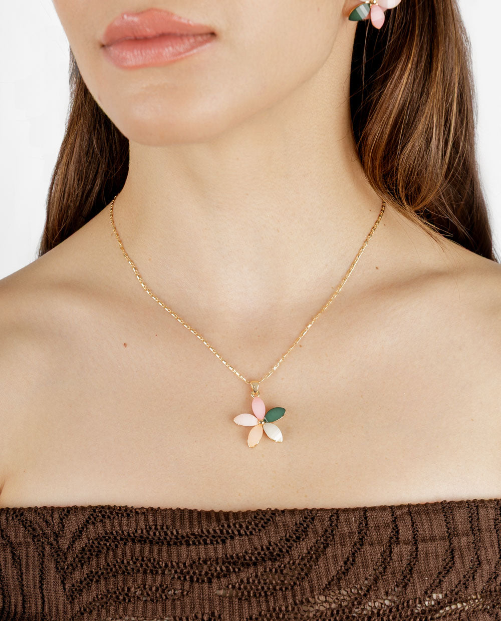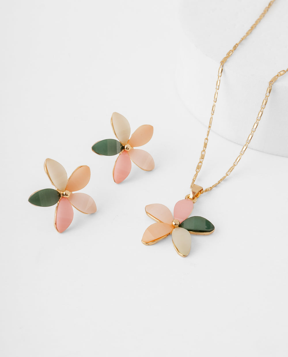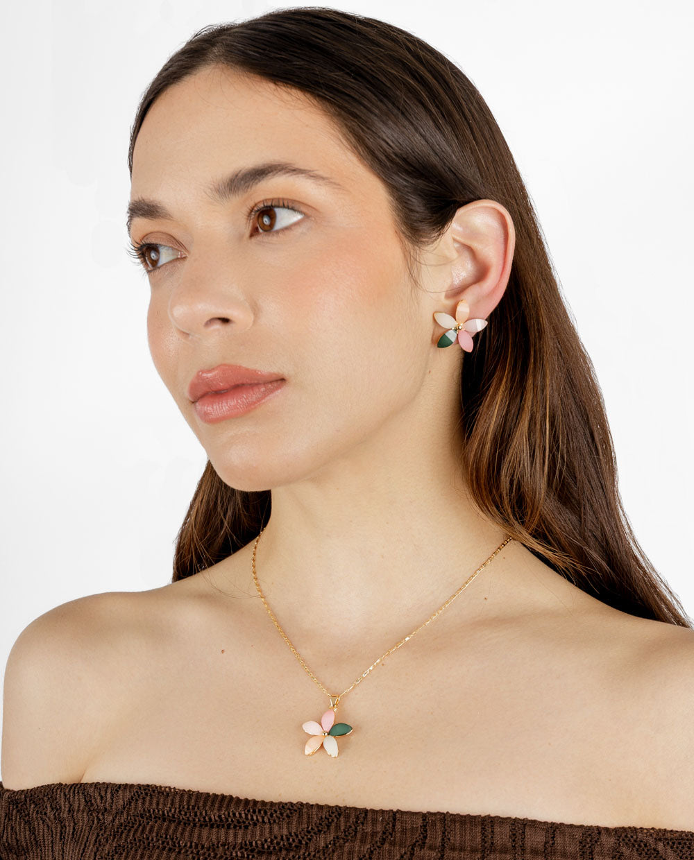 Este set de collar y aretes en forma de flor combina pétalos en tonos verde, beige y rosados, evocando frescura y armonía primaveral. Su diseño delicado y colorido es ideal para complementar vestidos ligeros, blusas románticas o looks casuales con un aire boho chic. Un accesorio versátil que aporta un toque vibrante y femenino a cada estilo.