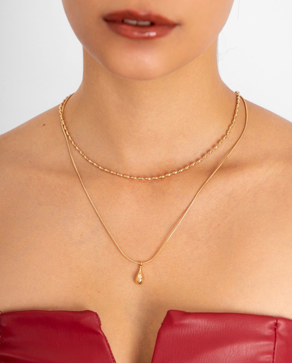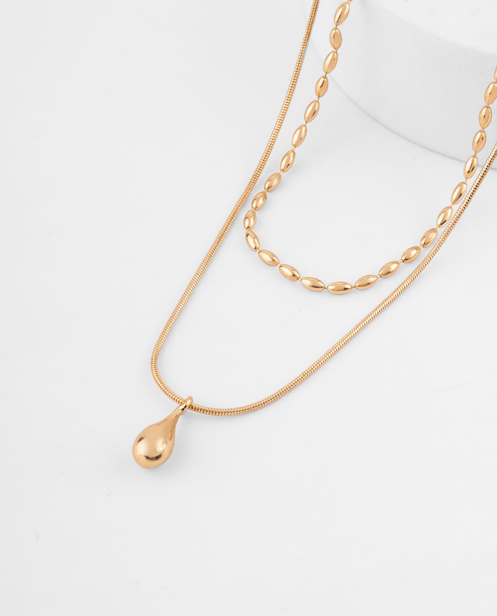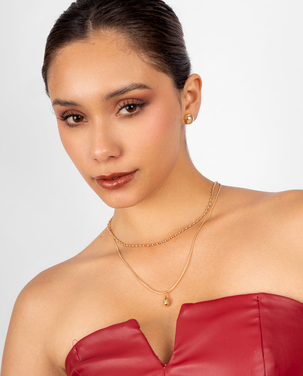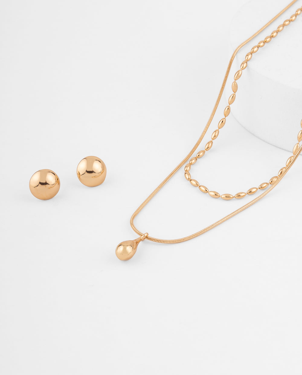 Set de collar doble en acabado dorado con cadenas finas y cuentas ovaladas, acompañado de aretes tipo esfera pulida. El dije en forma de gota aporta un toque elegante y moderno. Ideal para complementar looks minimalistas o elevar un outfit de noche con brillo sutil.