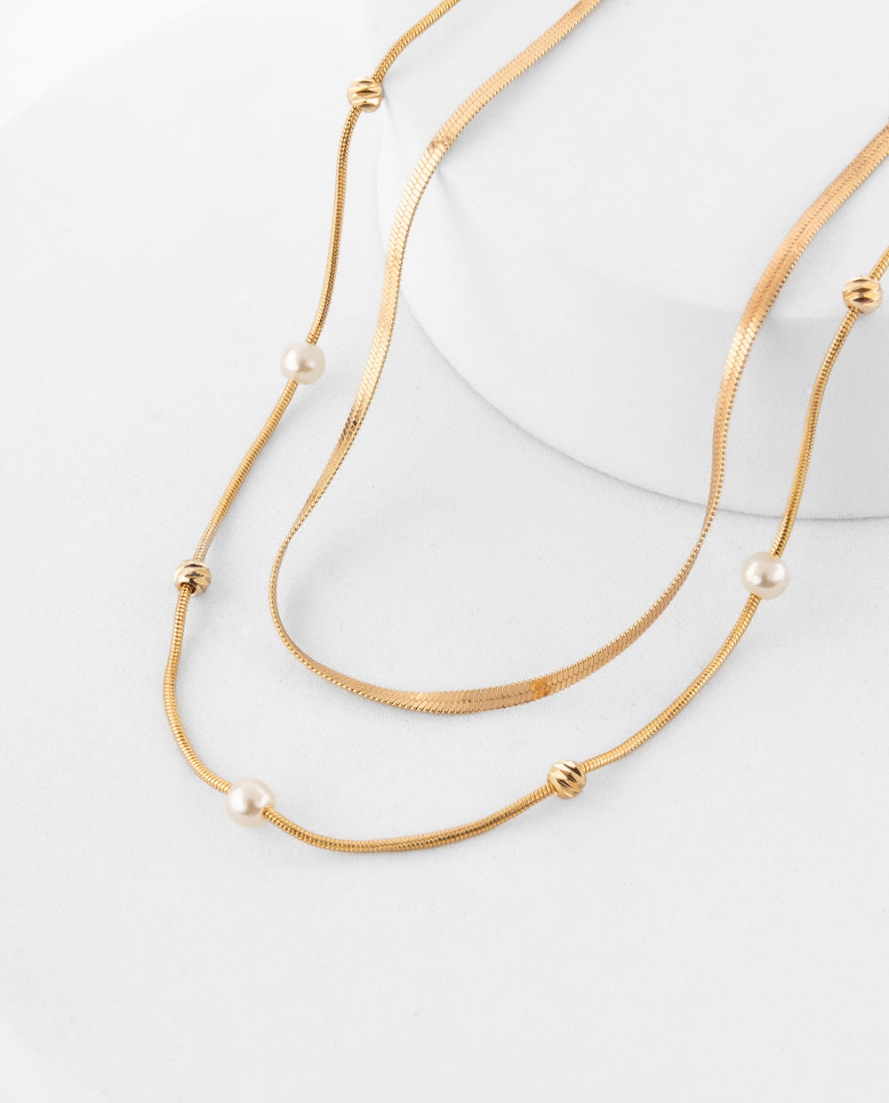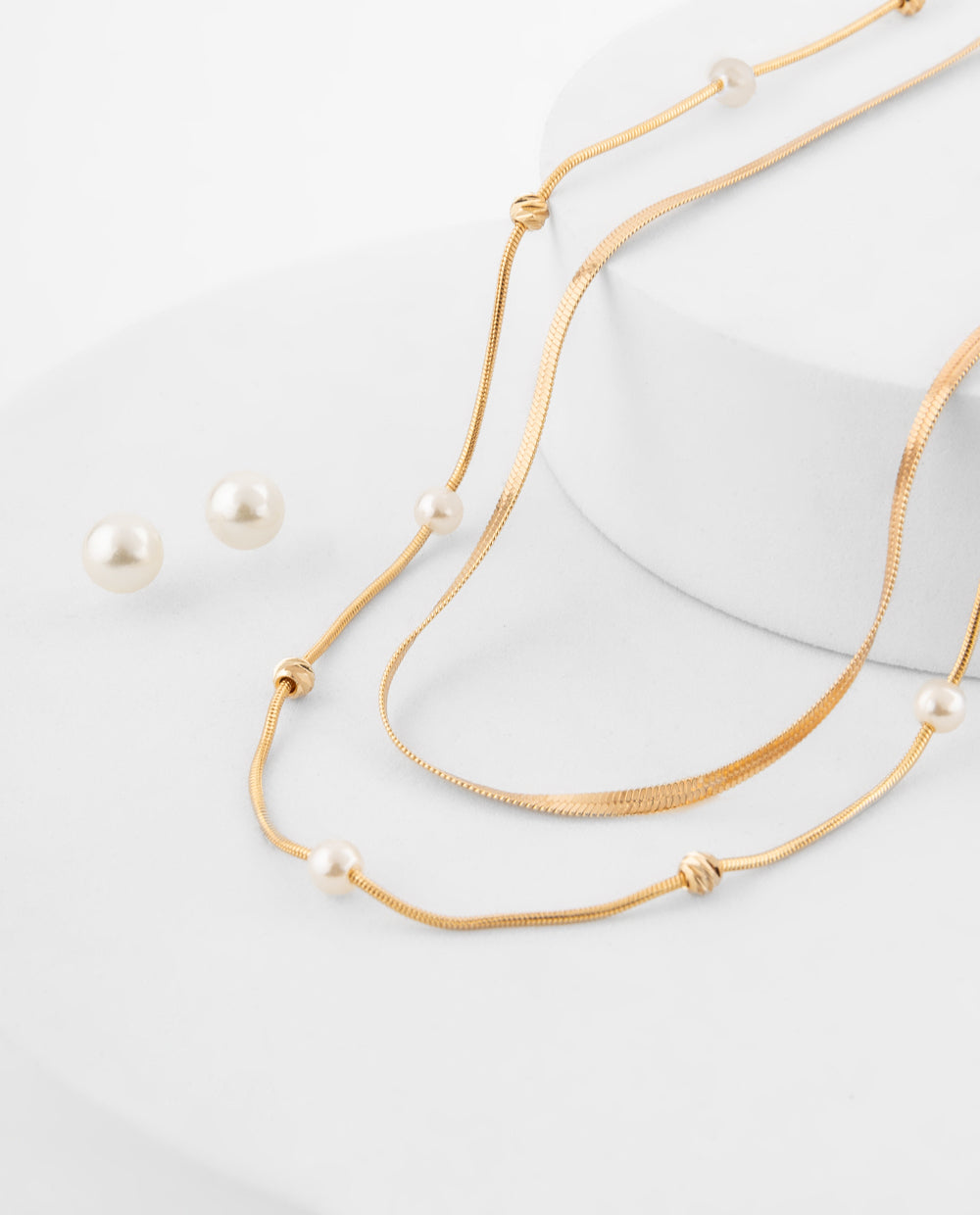 Collar doble dorado con perlas distribuidas en cadena fina y aretes tipo perla, ideal para un look clásico y delicado.