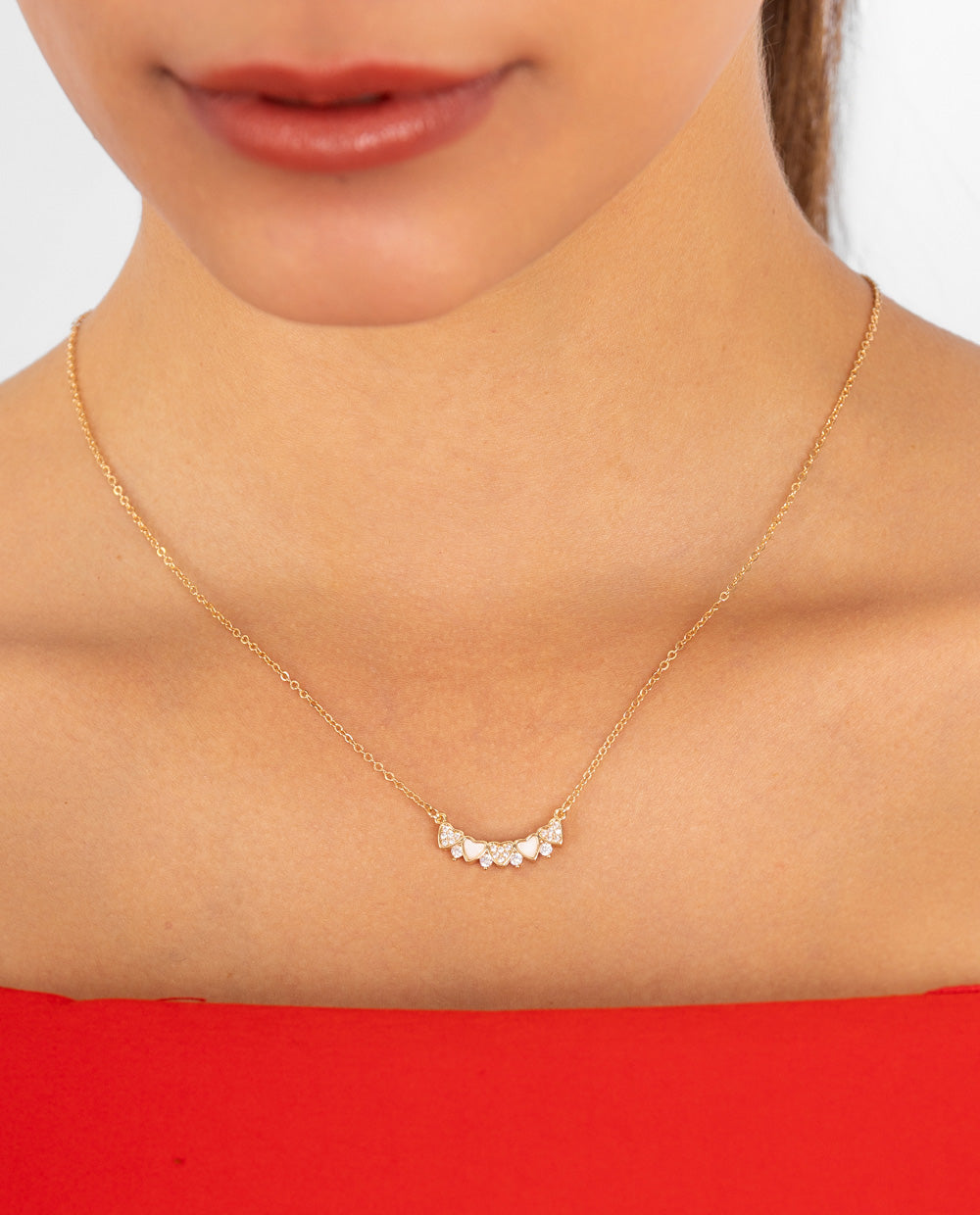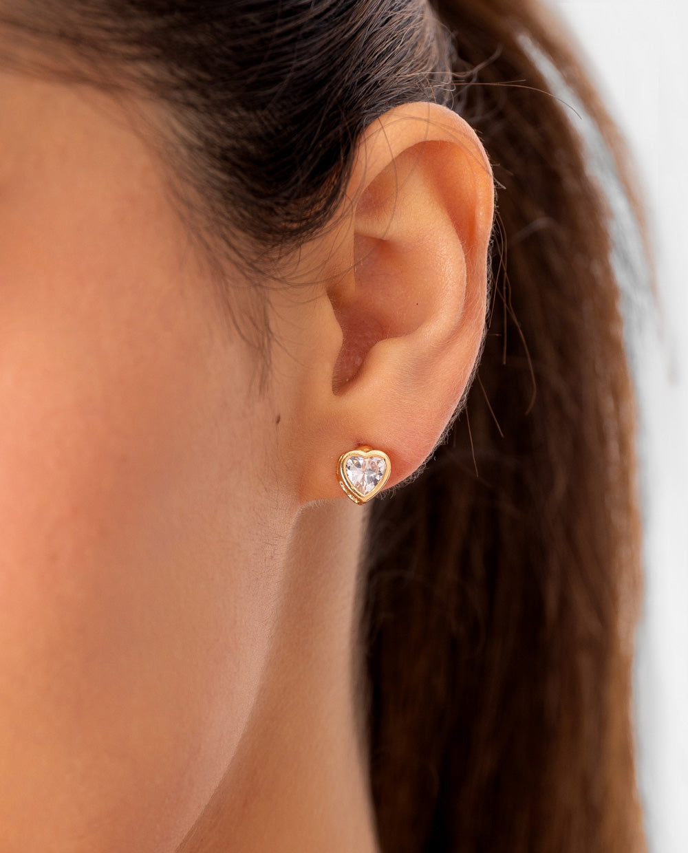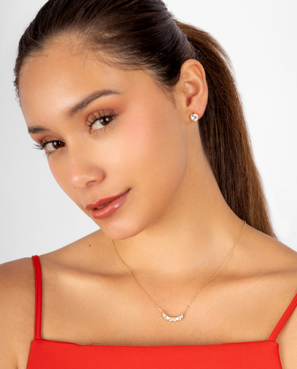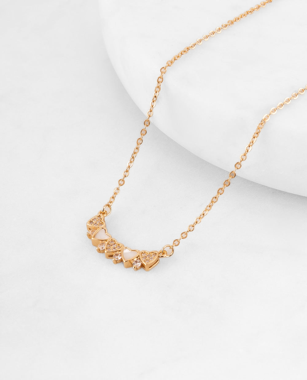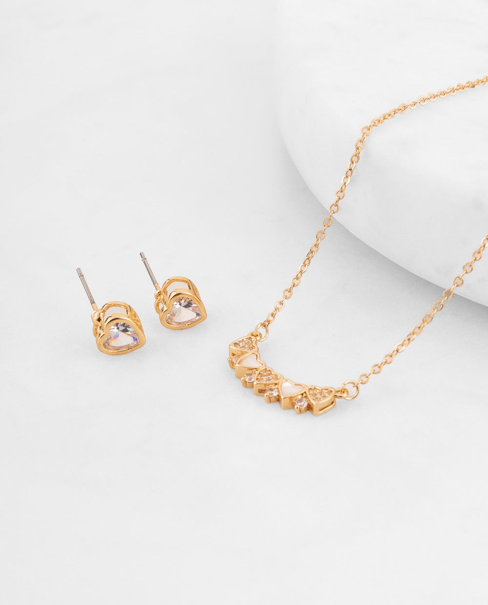 Set de collar y aretes dorados bañados en oro con detalles de corazones y pedrería de zircón, conocida por su brillo excepcional y durabilidad.