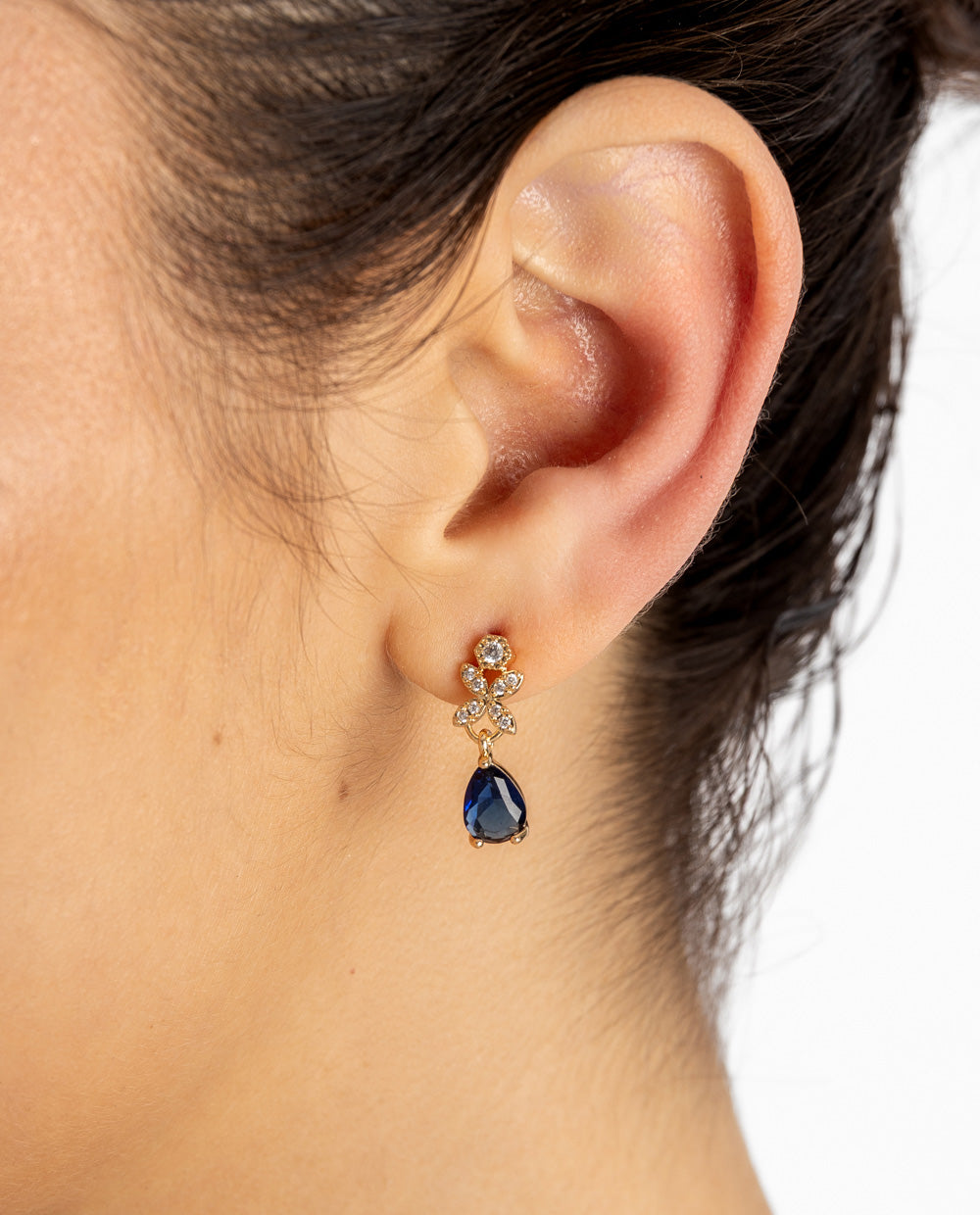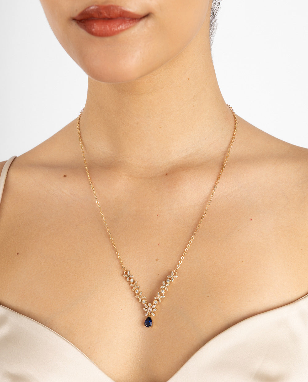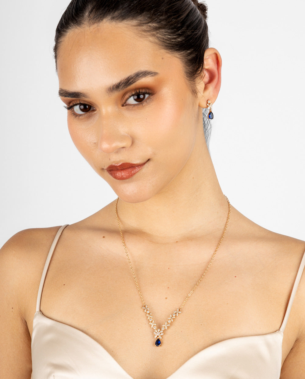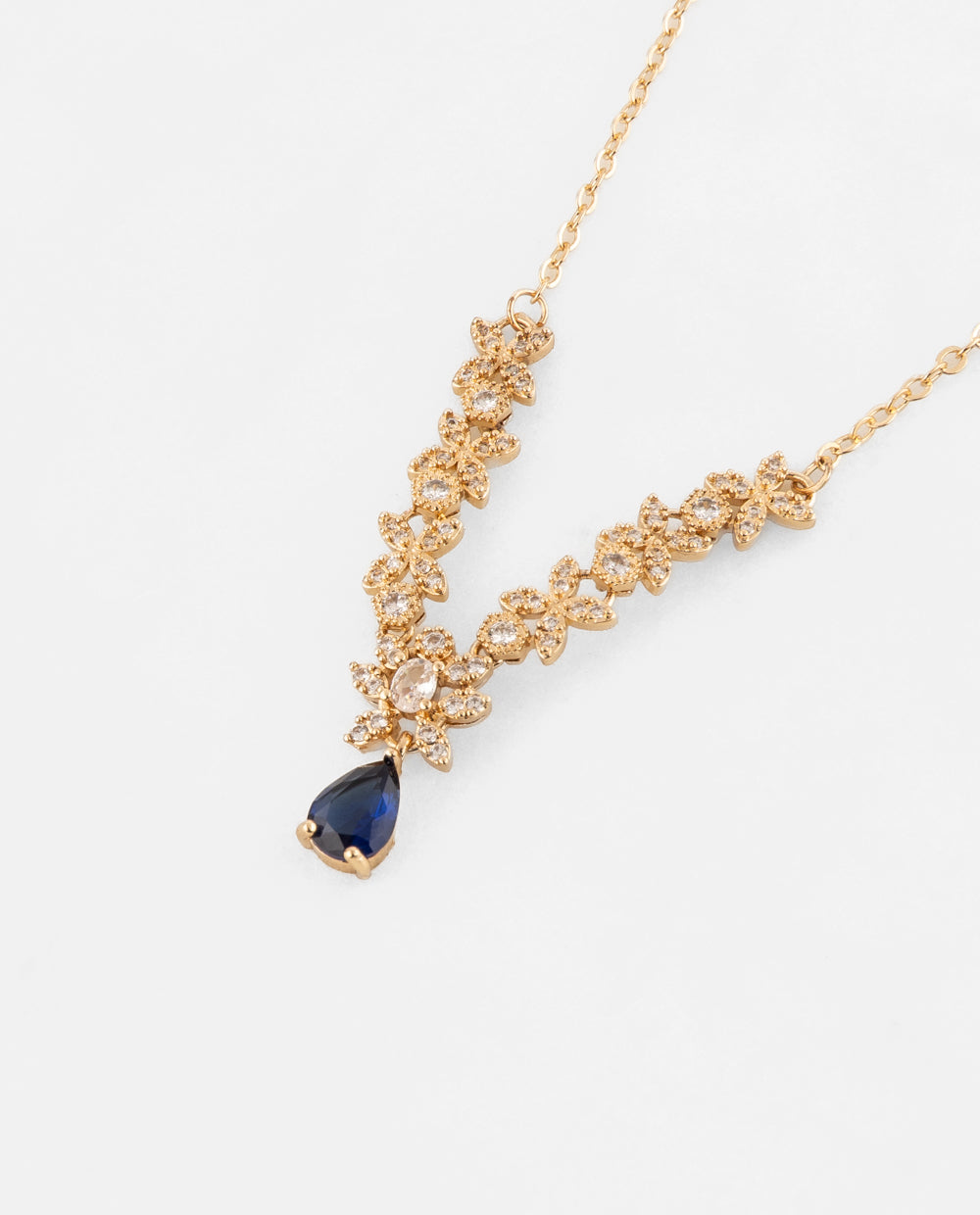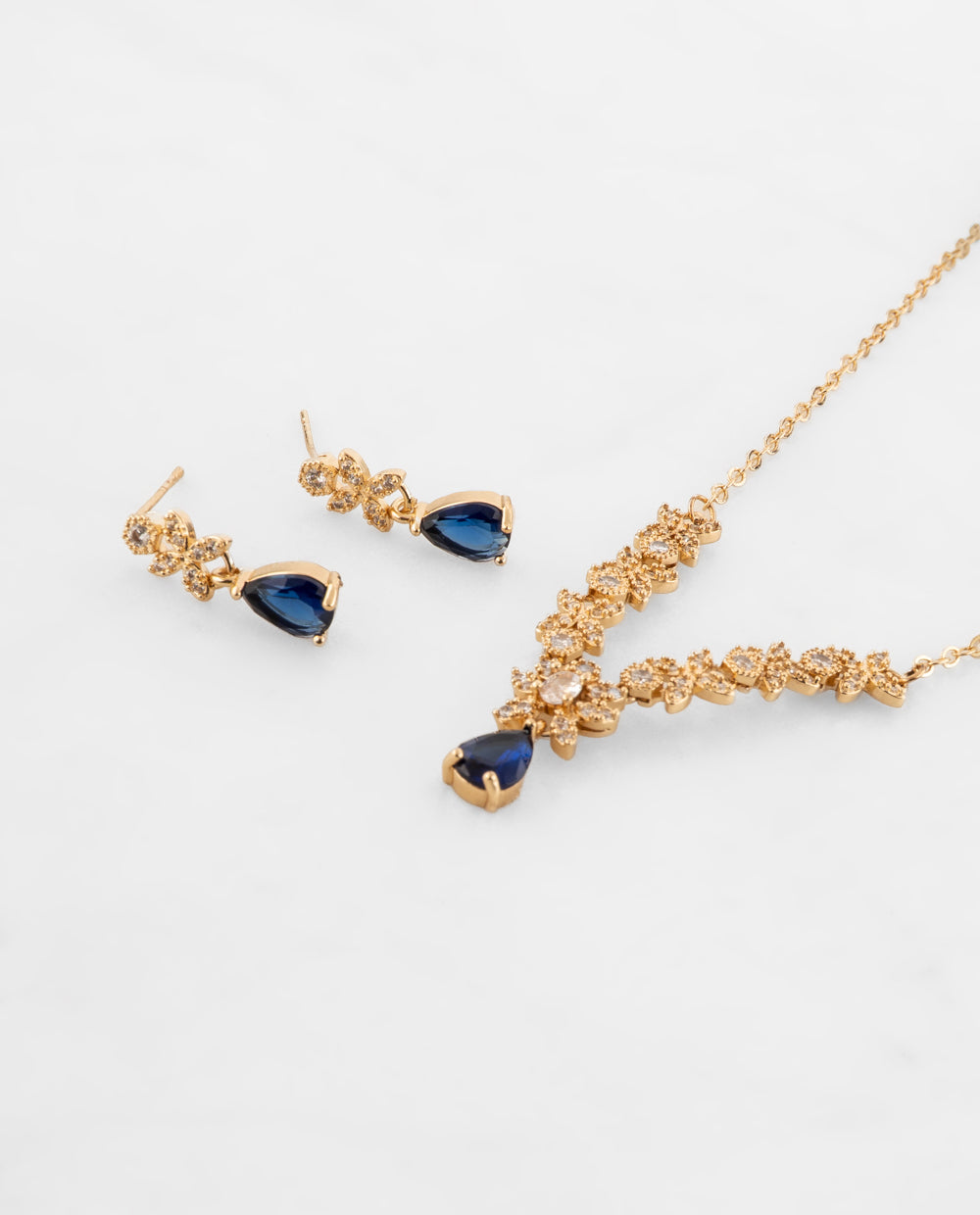 Set bañado en oro con pedrería de zircón y aplicaciones en forma de lágrima azul. Incluye collar y aretes a juego con acabado brillante y diseño elegante para realzar cualquier look.