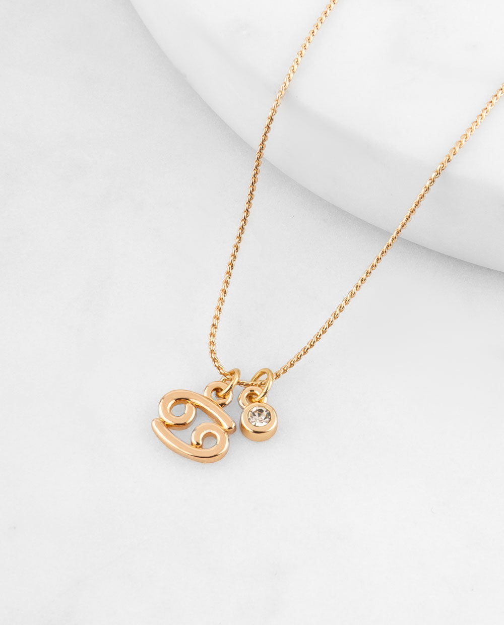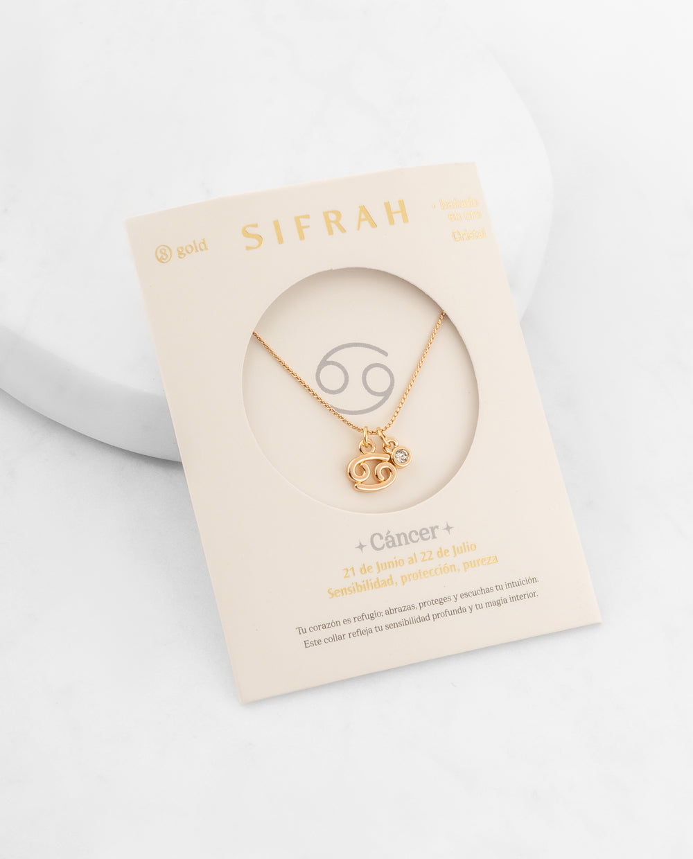 Collar dorado bañado en oro con dije del signo del zodiaco Cáncer y detalle de cristal. Bisutería de la colección premium, hipoalergénica perfecta para pieles sensibles.