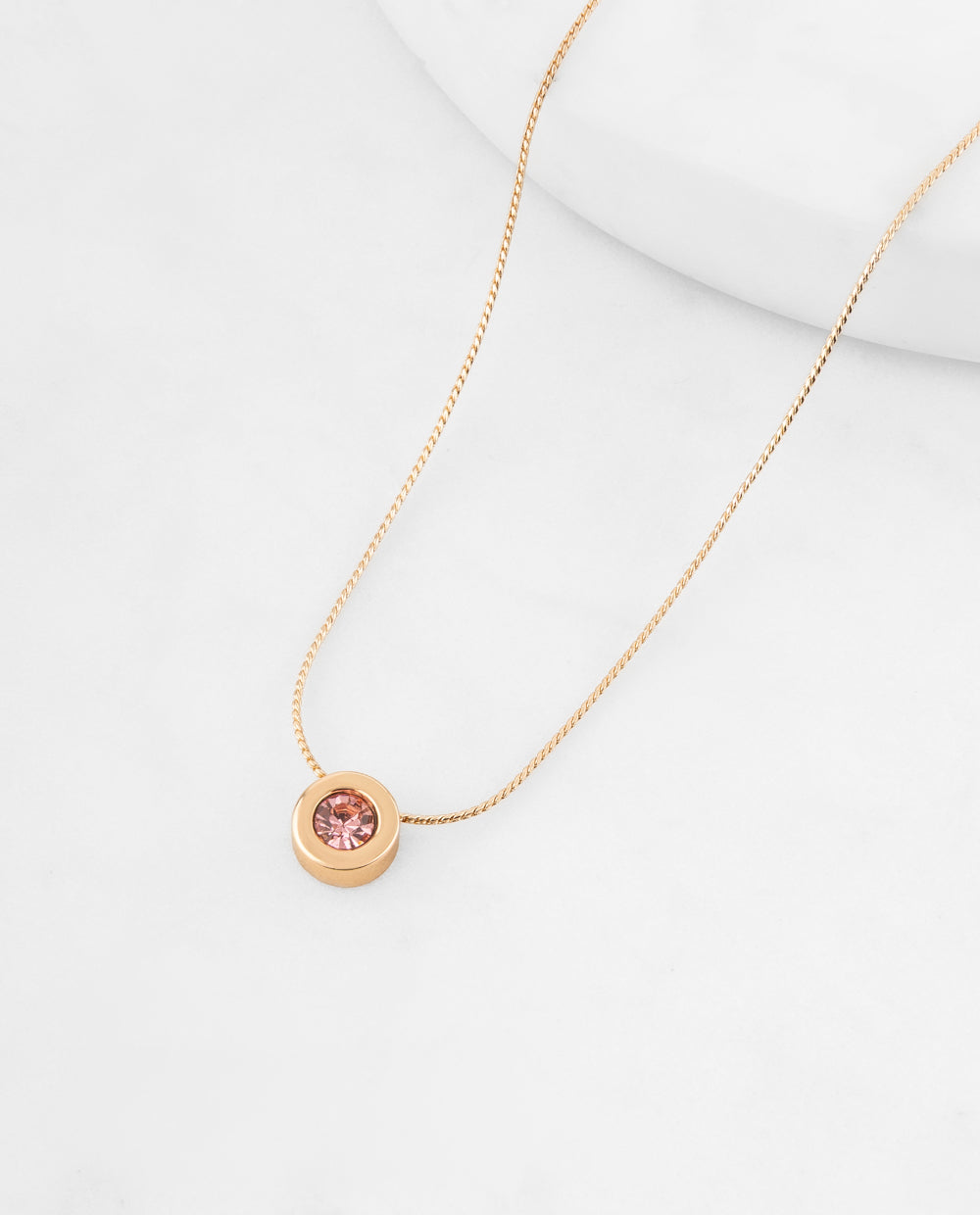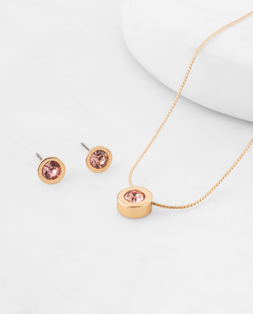 Set de collar dorado y aretes tipo studs con cristal rosado, bañados en oro e hipoalergénicos, ideales para pieles sensibles.