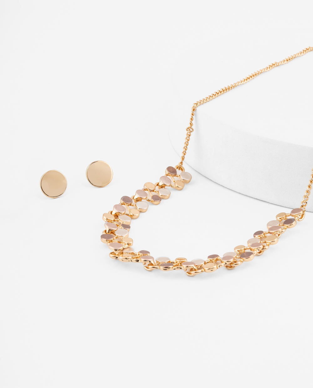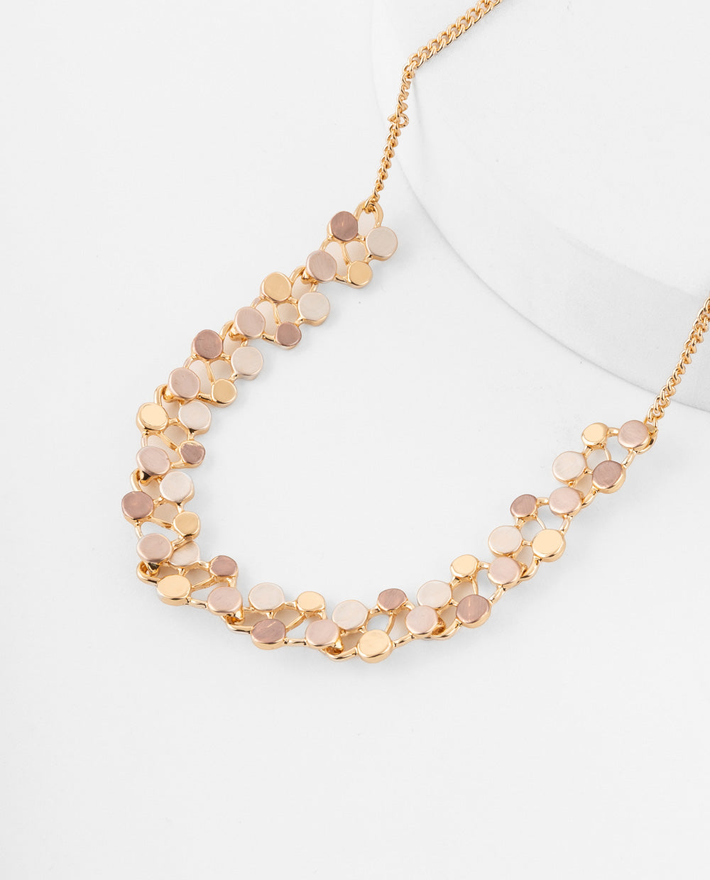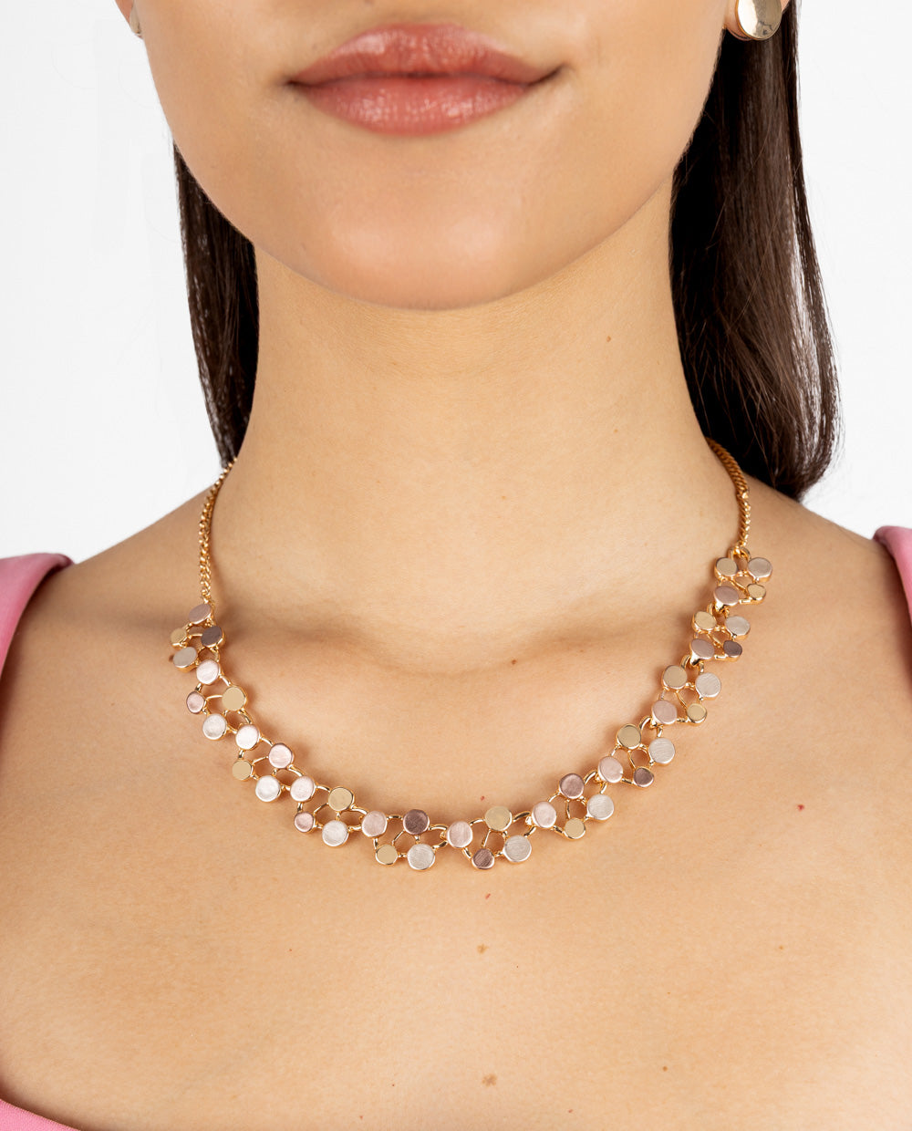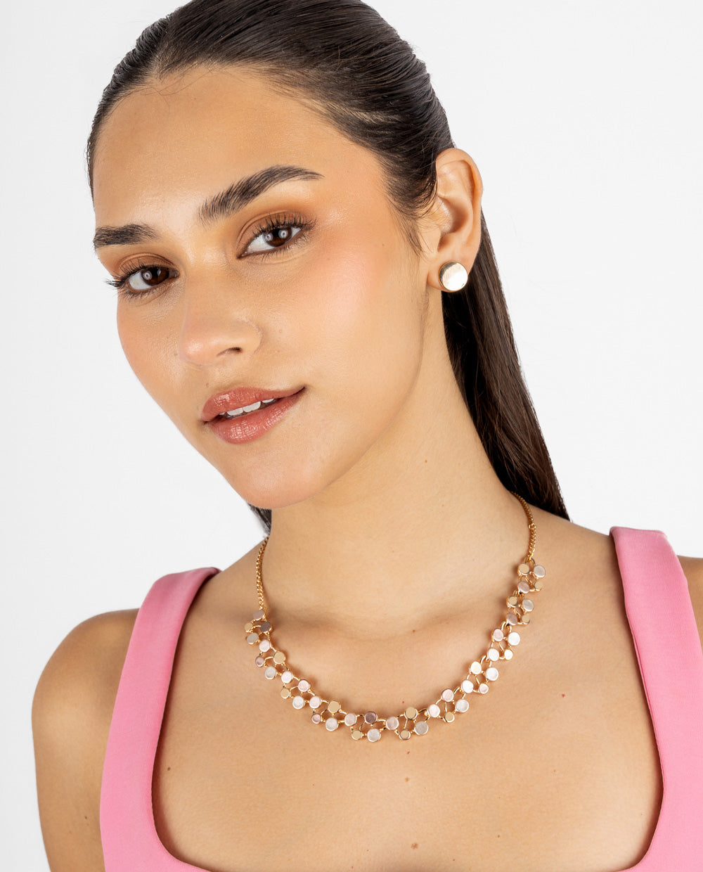 Collar dorado con cuentas facetadas en tonos nude y acabado brillante. Diseño ligero y delicado ideal para elevar looks cotidianos.