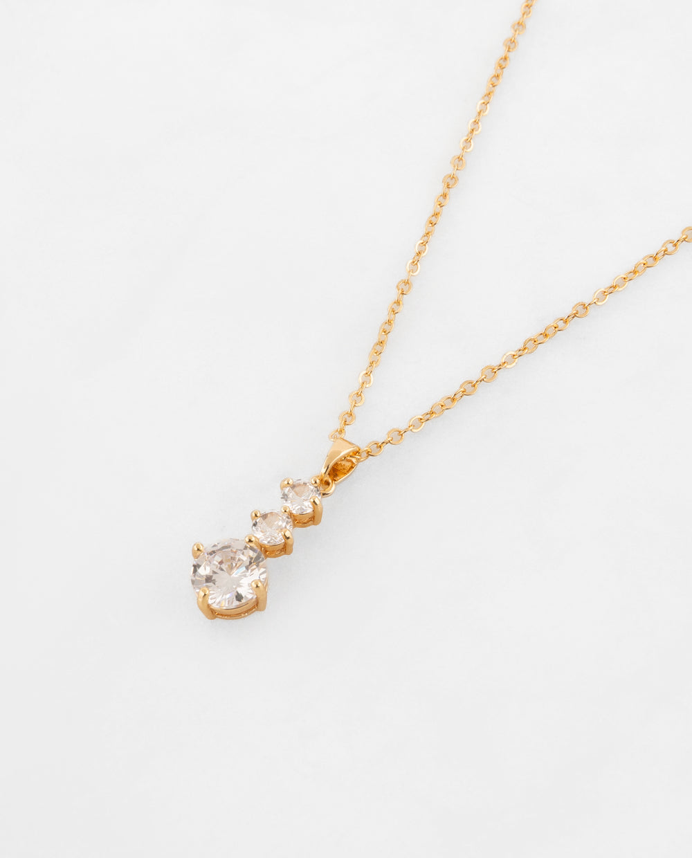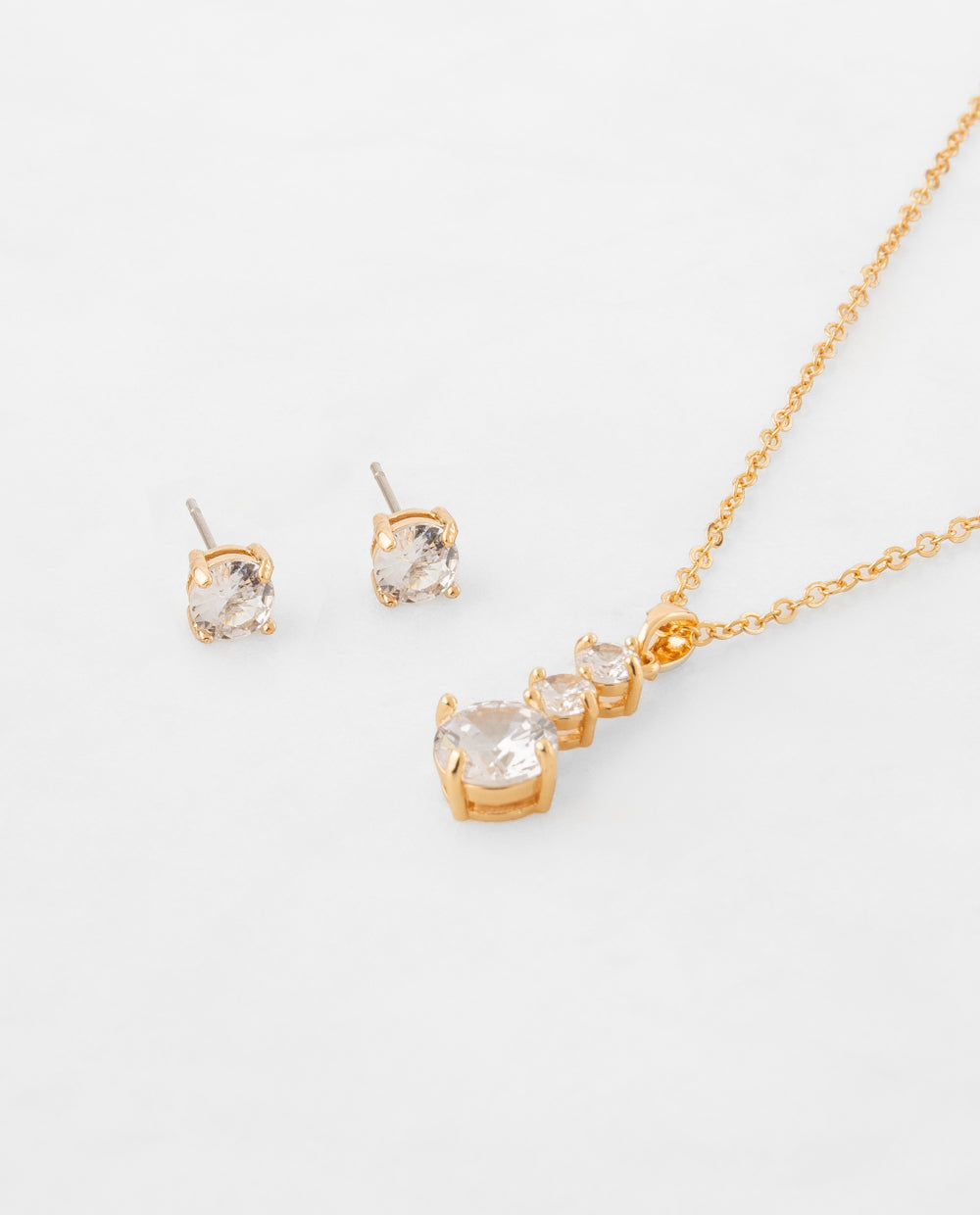 Collar dorado bañado en oro con dije de tres zircones y aretes tipo stud combinados, un dúo elegante y luminoso para cualquier ocasión.