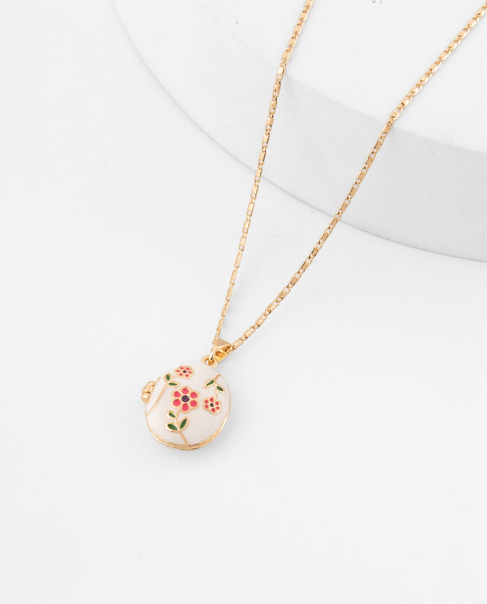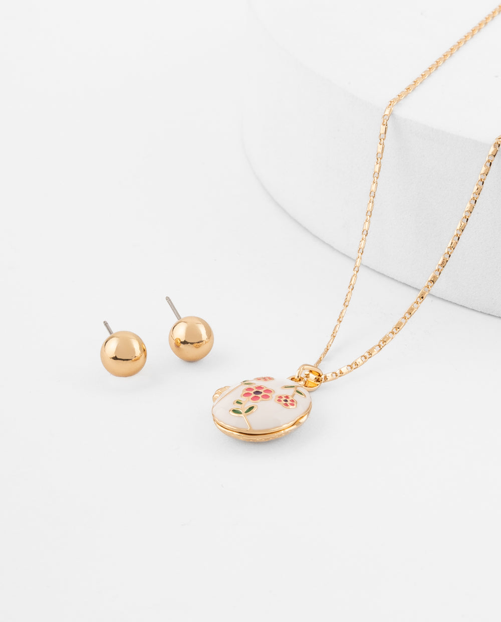 Collar con dije redondo decorado con flores en tonos rosados y dorados. Incluye aretes dorados pequeños.
