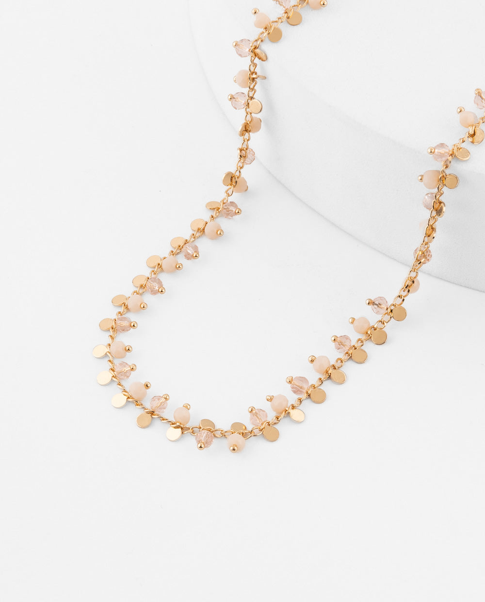Cadena dorada con pequeños dijes circulares y cuentas nude facetadas que aportan brillo sutil y movimiento delicado.