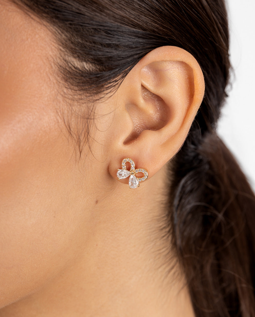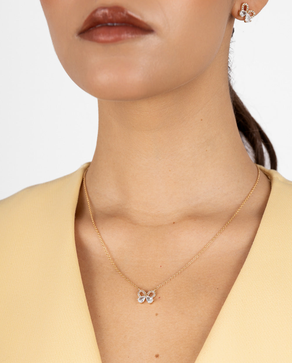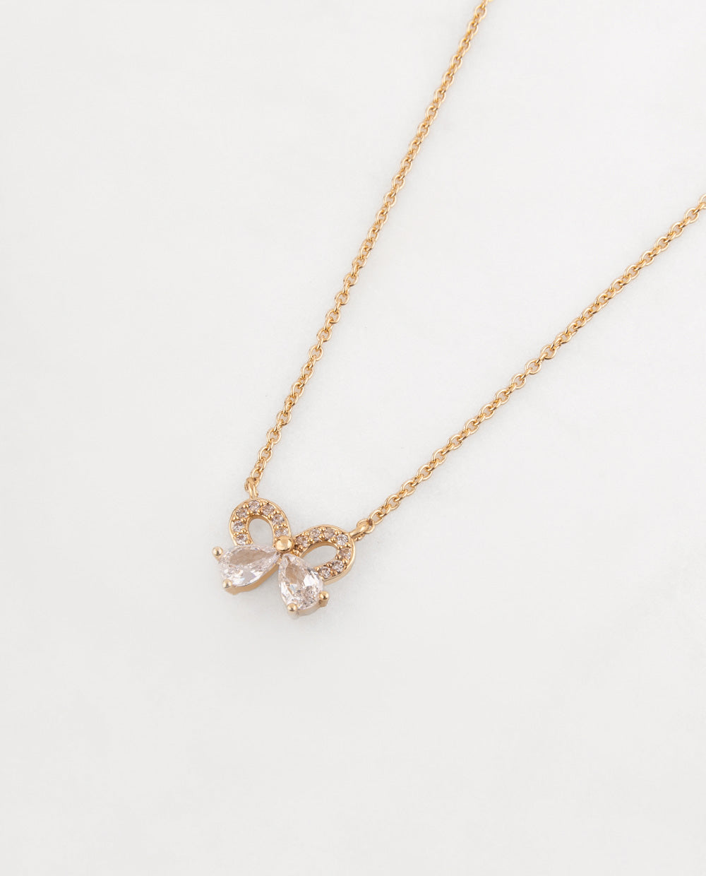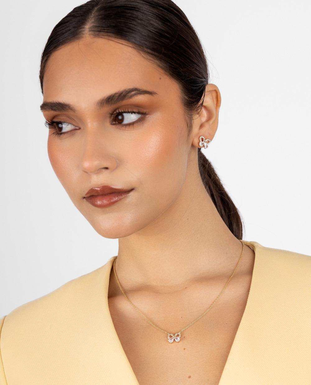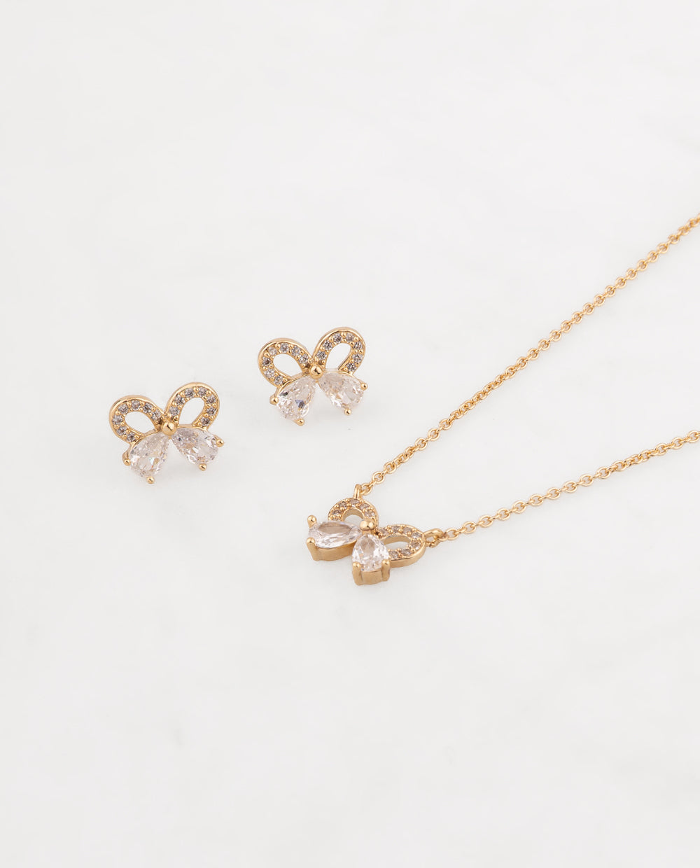 Set compuesto por collar y aretes en forma de delicado lazo adornado con pedrería de zircón, que aporta brillo y sofisticación. Su diseño femenino y versátil lo convierte en el accesorio perfecto para elevar desde un look casual hasta un outfit elegante. Un detalle encantador que ilumina cada ocasión.