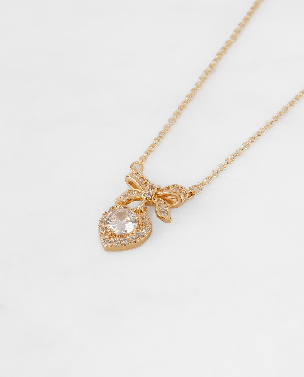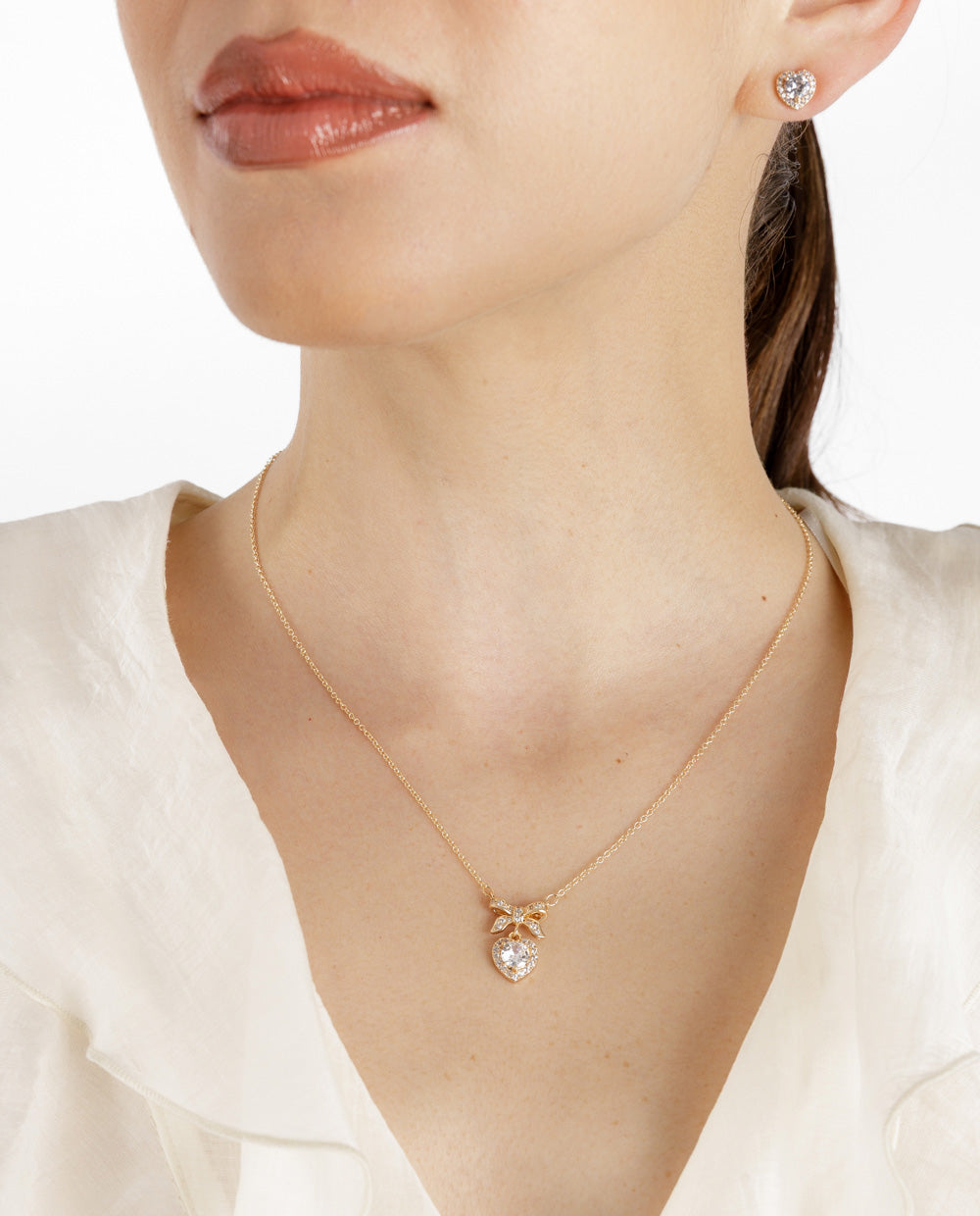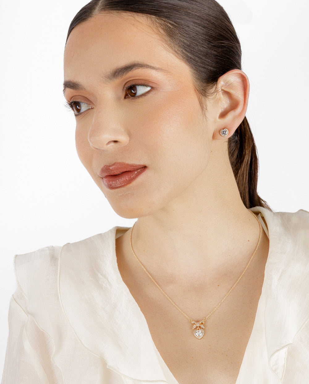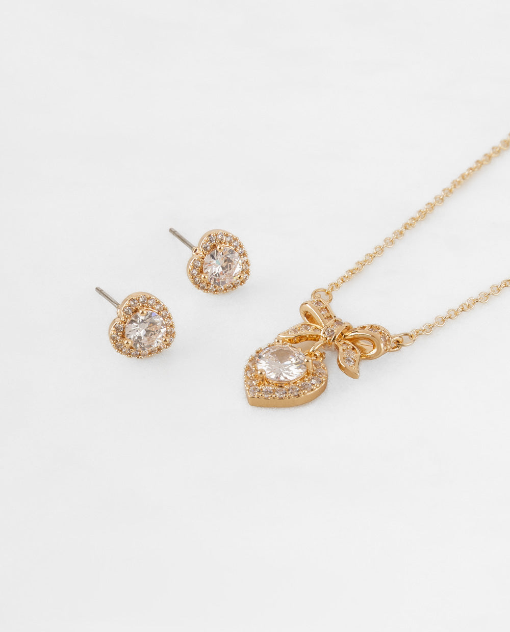Este set incluye un collar con dije en forma de corazón adornado con un delicado moño y aretes a juego con pedrería de zircón. Su baño en oro aporta un acabado elegante y sofisticado, ideal para elevar cualquier look. Una propuesta de la colección Glow que refleja brillo, frescura y un estilo atemporal.