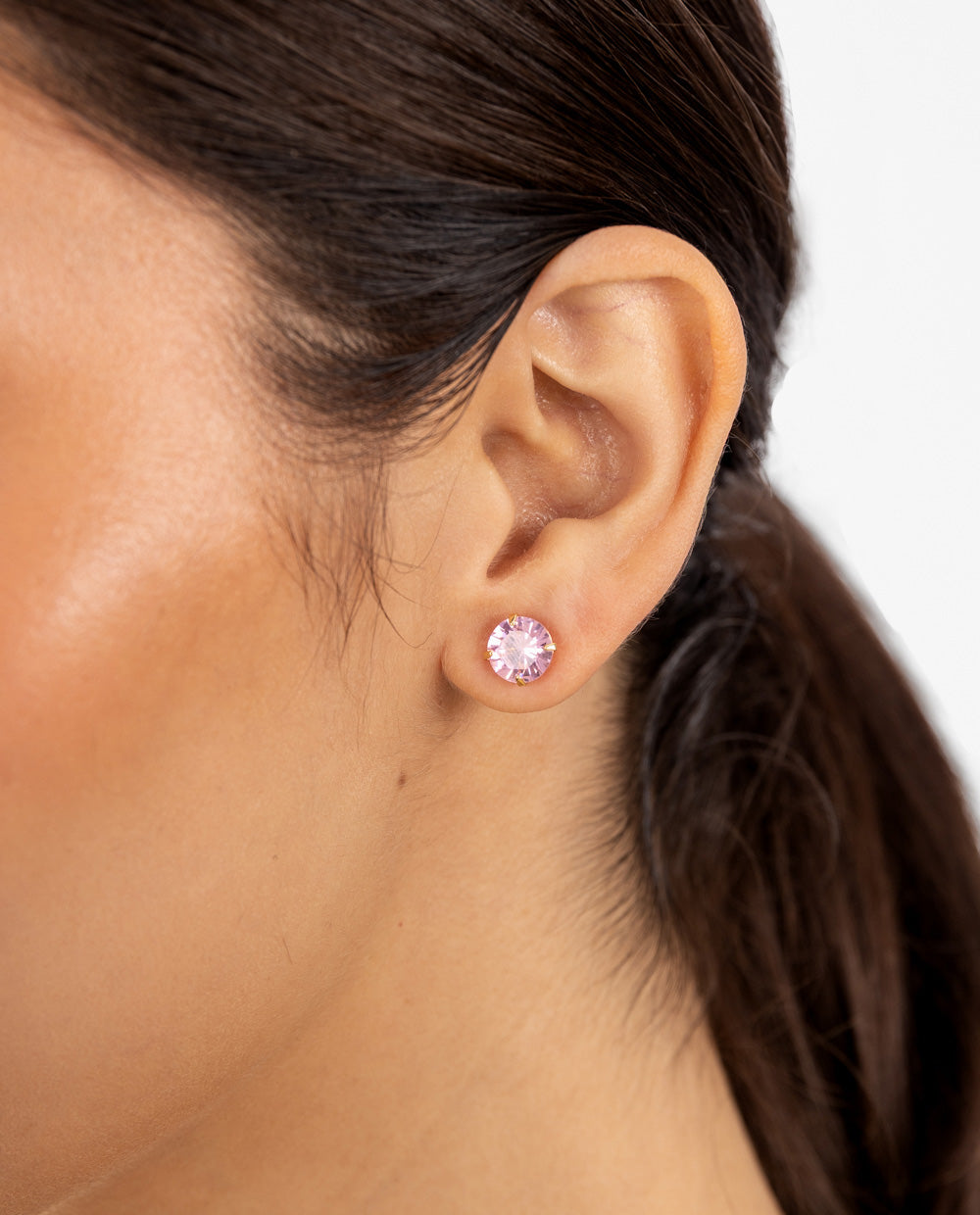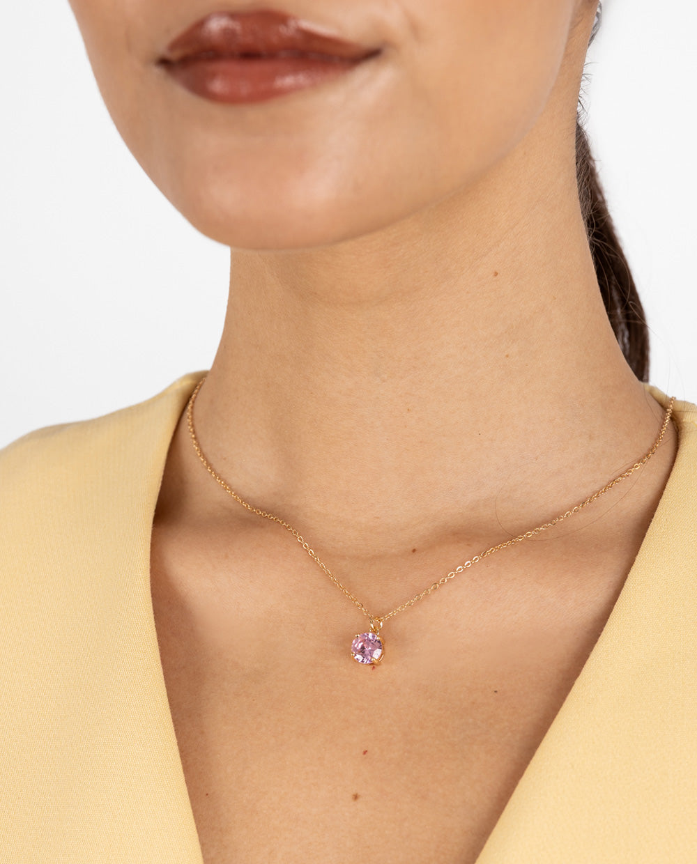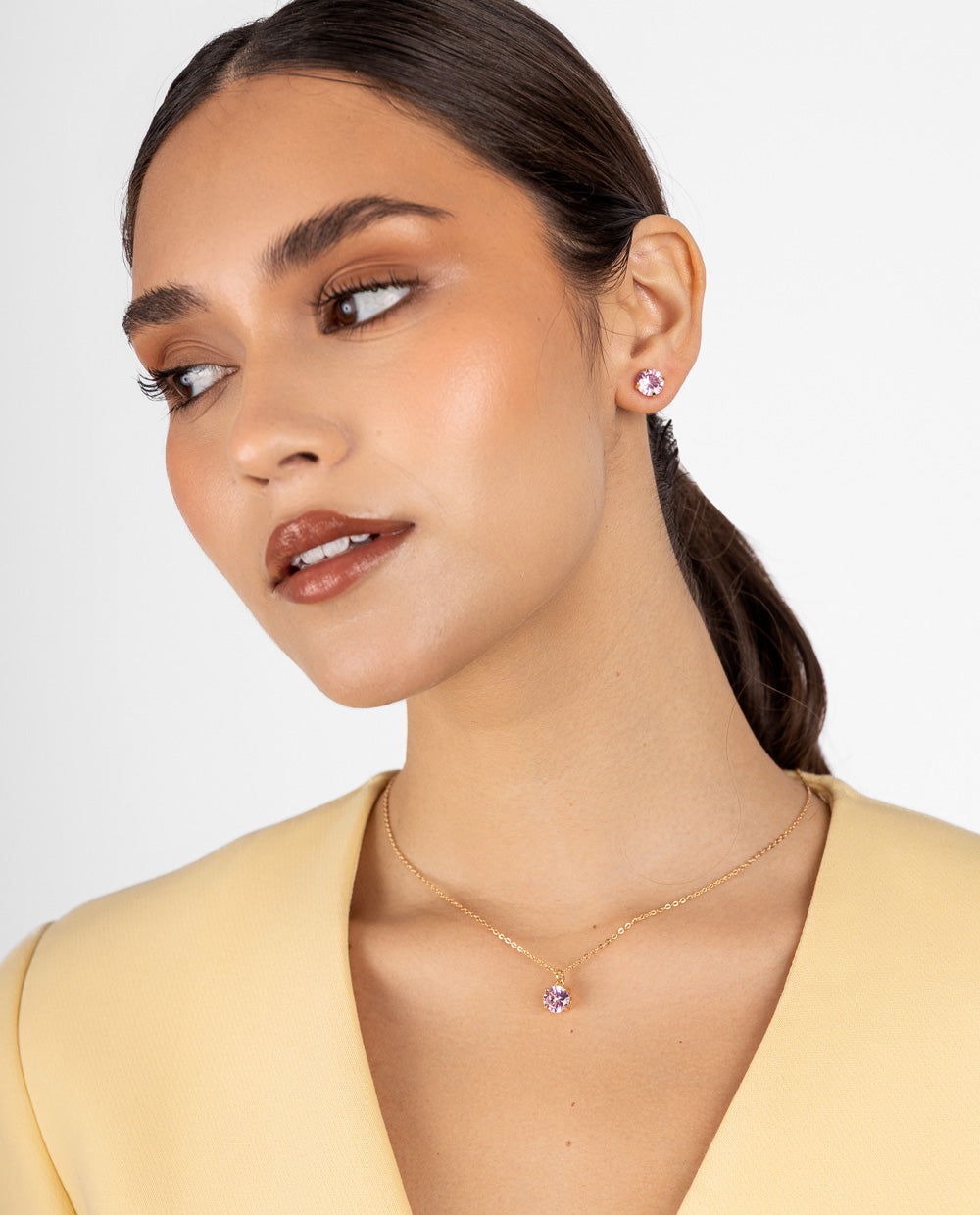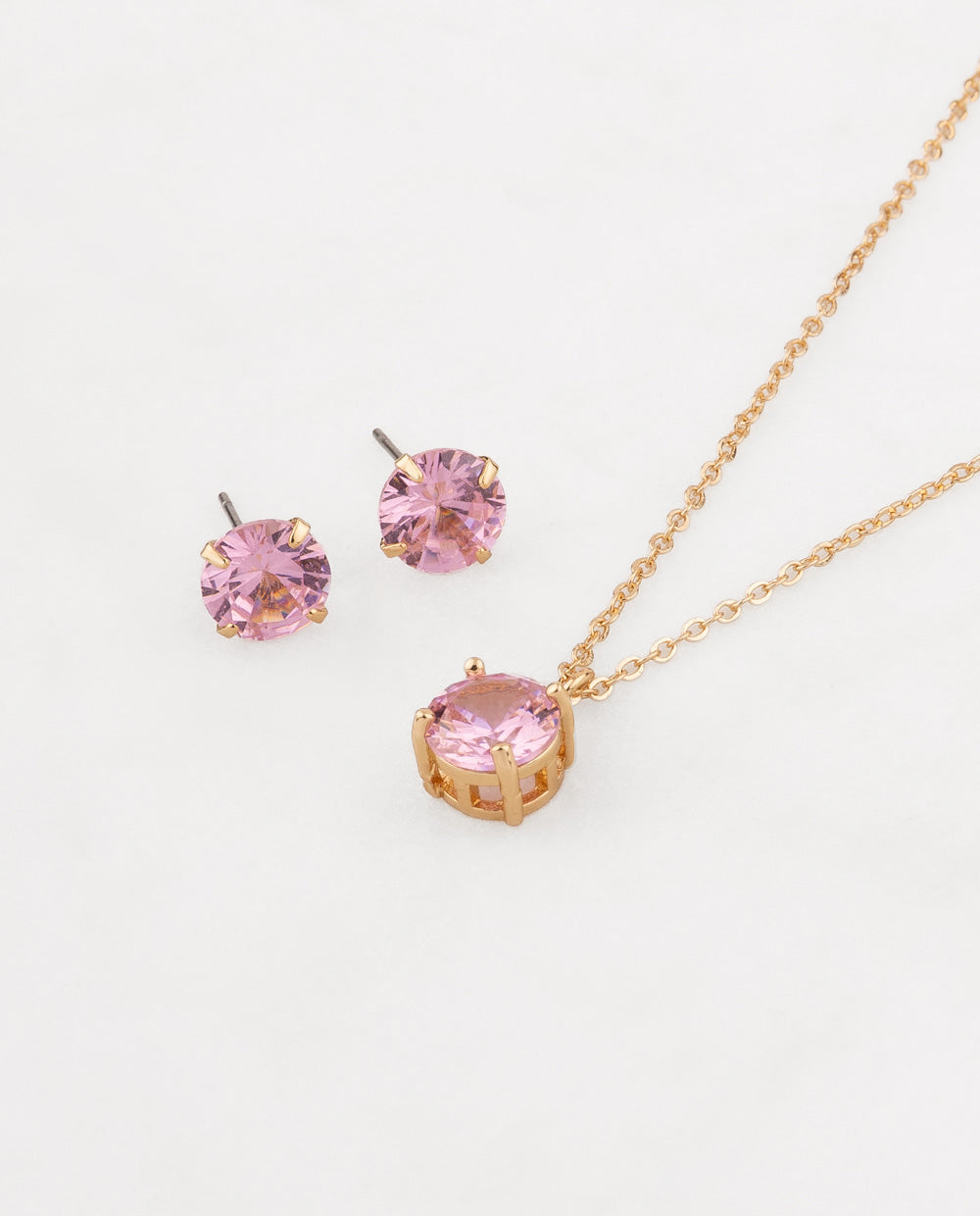 Set delicado compuesto por collar y aretes en baño dorado con pedrería de zircón en tono rosa. Su diseño romántico y elegante resalta la feminidad y añade un brillo sutil a tus looks. Ideal para complementar outfits de día o realzar un estilo más sofisticado en la noche.