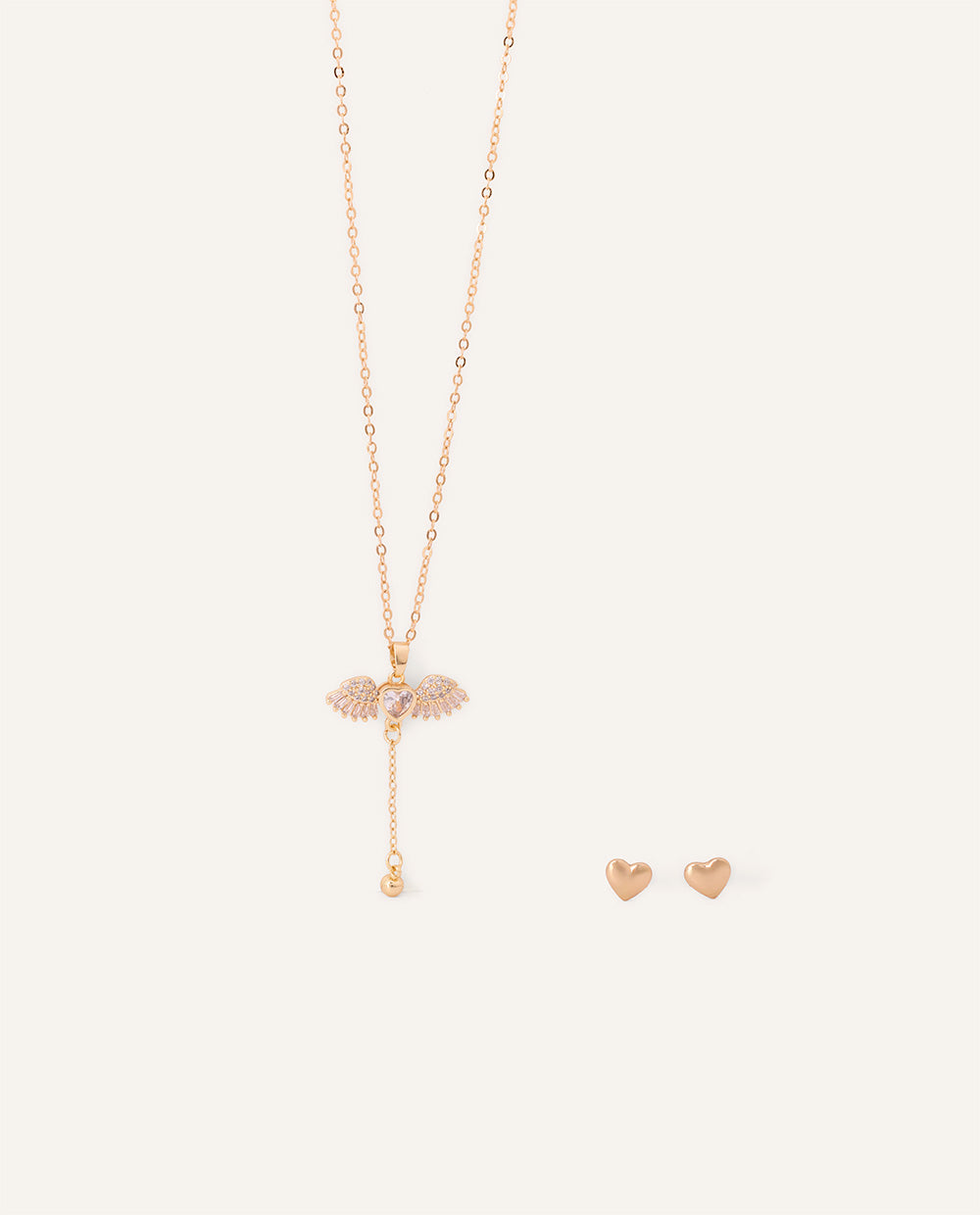 Collar con dije de alas con piedra de zircón en el centro. Aretes incluidos. Set bañado en oro.