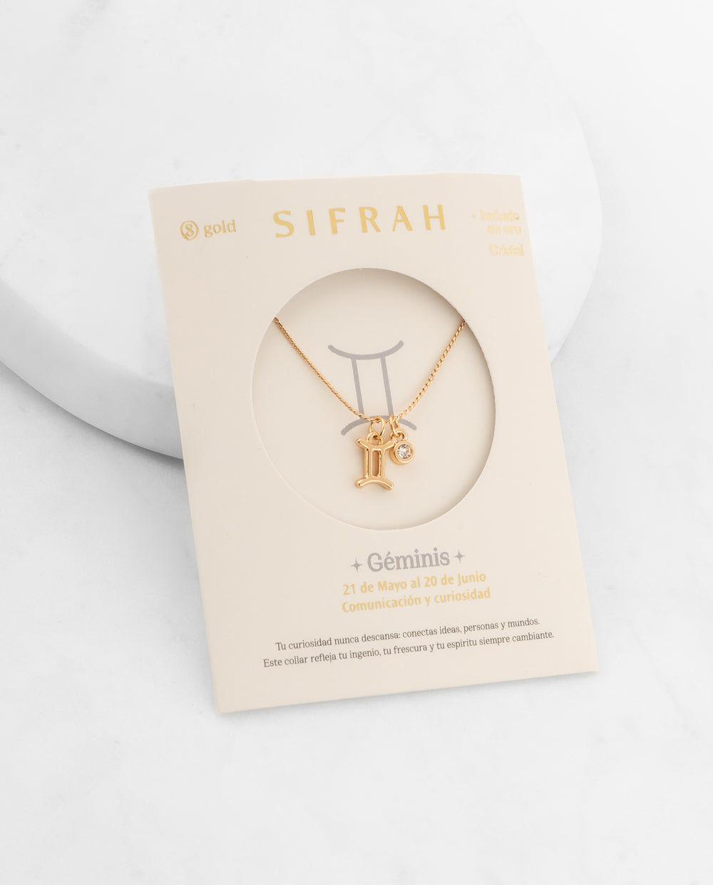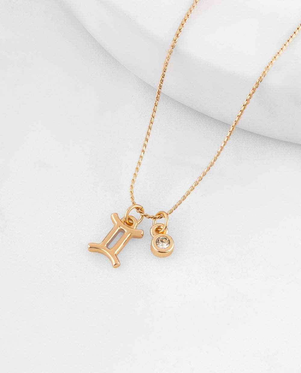 Collar dorado bañado en oro con dije del signo del zodiaco Géminis y detalle de cristal. Bisutería de la colección premium, hipoalergénica perfecta para pieles sensibles.