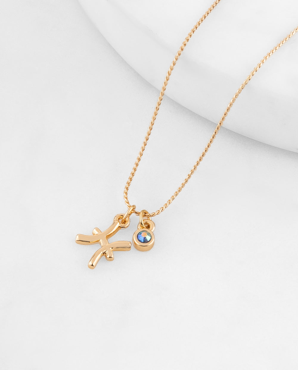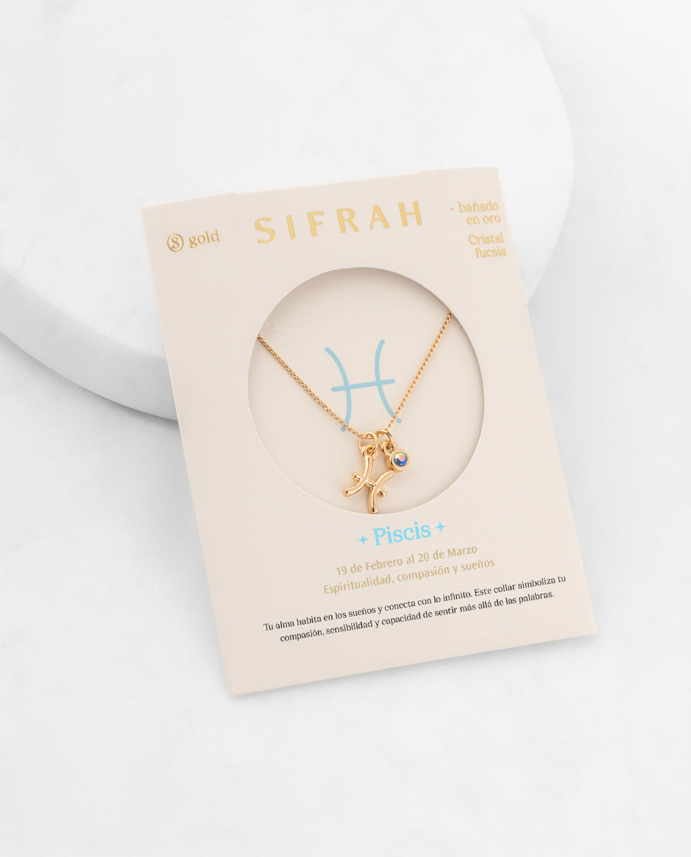Collar dorado bañado en oro con dije del signo del zodiaco Piscis y detalle de cristal. Bisutería de la colección premium, hipoalergénica perfecta para pieles sensibles.