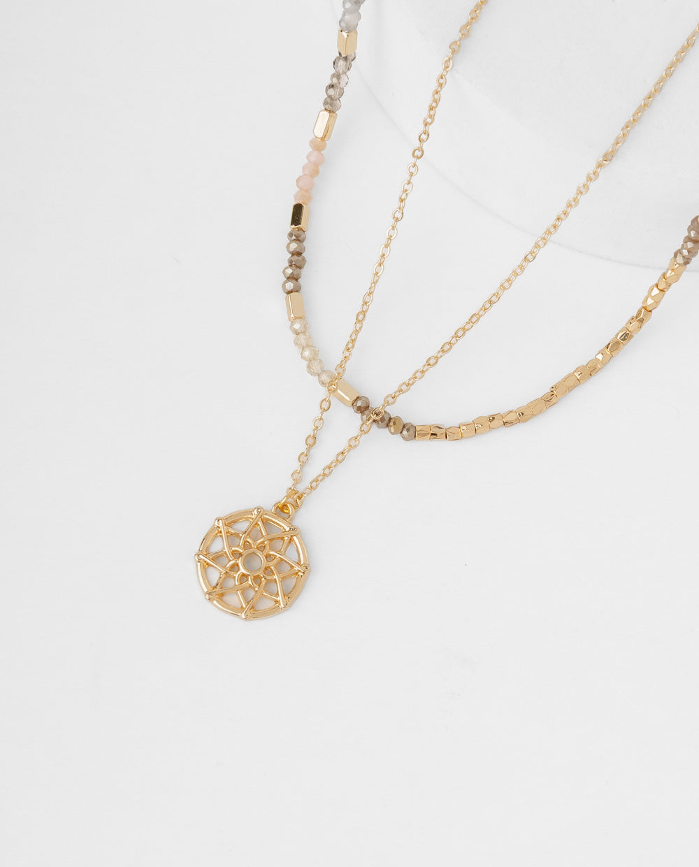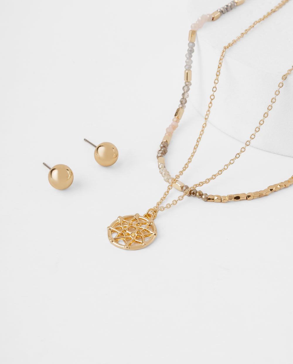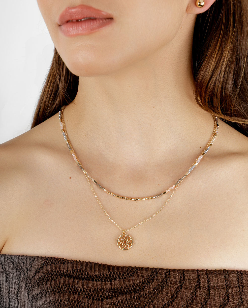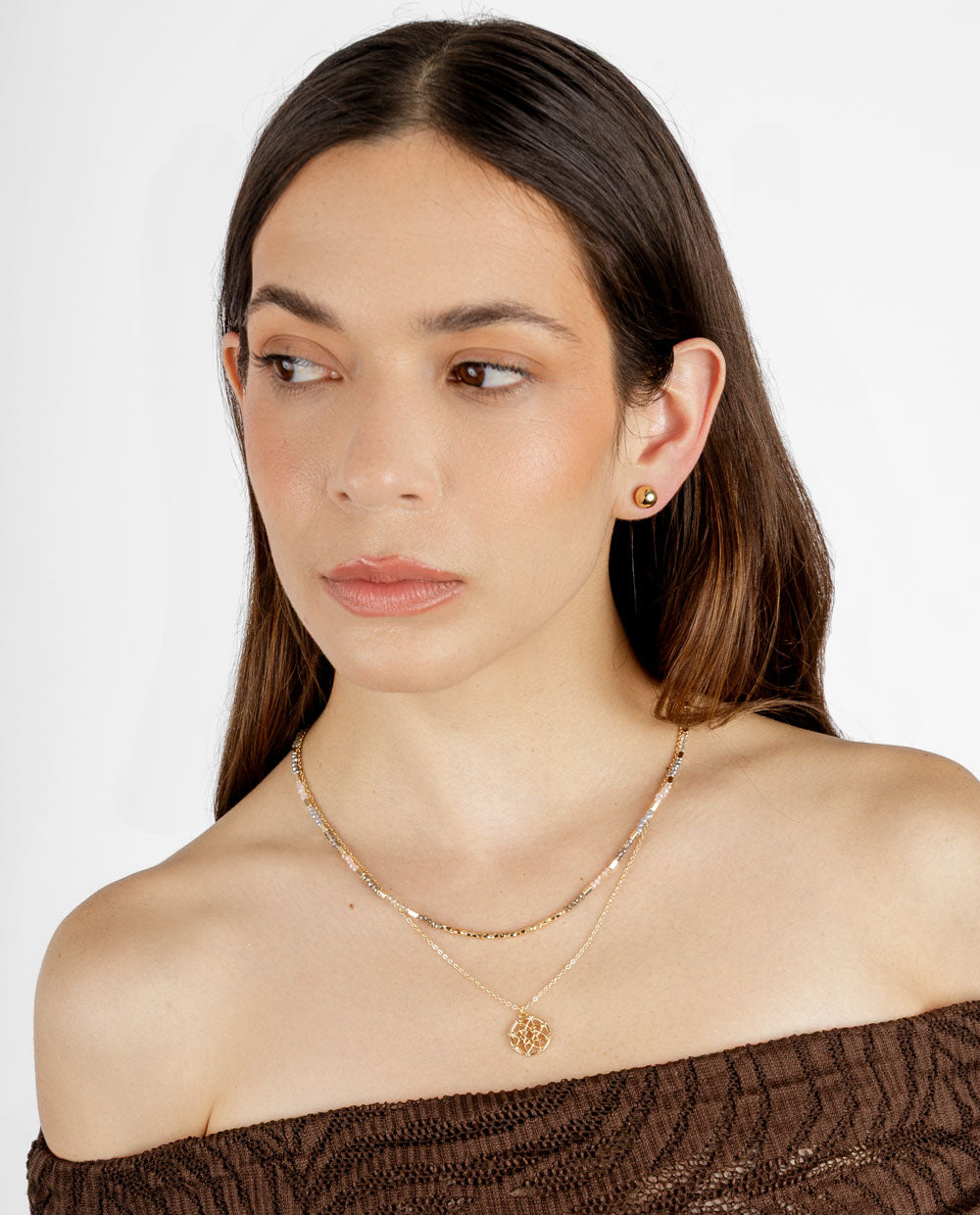 Este set incluye un collar en capas con cuentas naturales y un dije geométrico dorado, acompañado de aretes básicos que equilibran el look. Su diseño versátil es ideal para combinar con blusas ligeras, vestidos frescos o incluso un outfit casual con aire boho chic. Un accesorio que aporta frescura, modernidad y un toque sofisticado a tu estilo primaveral.