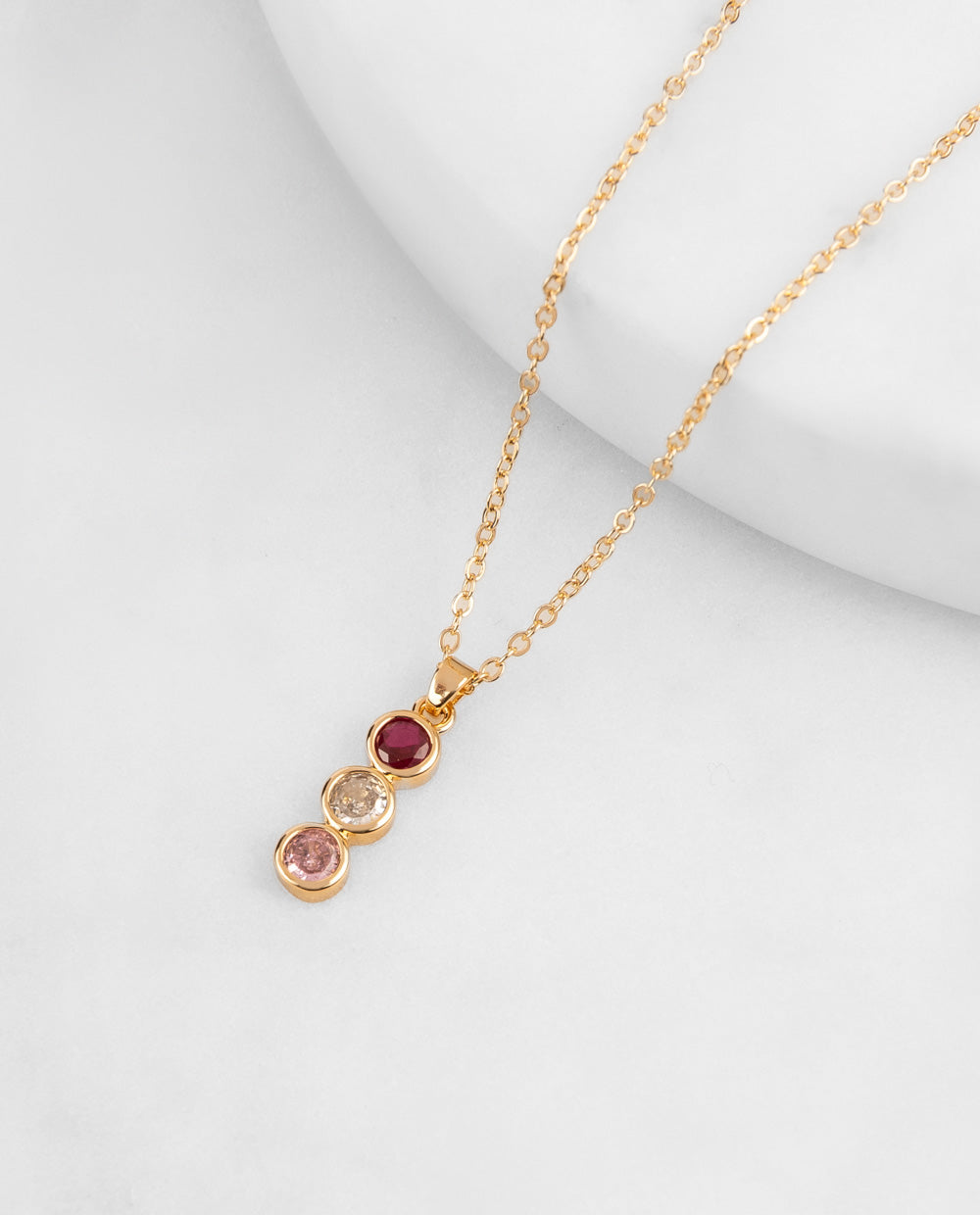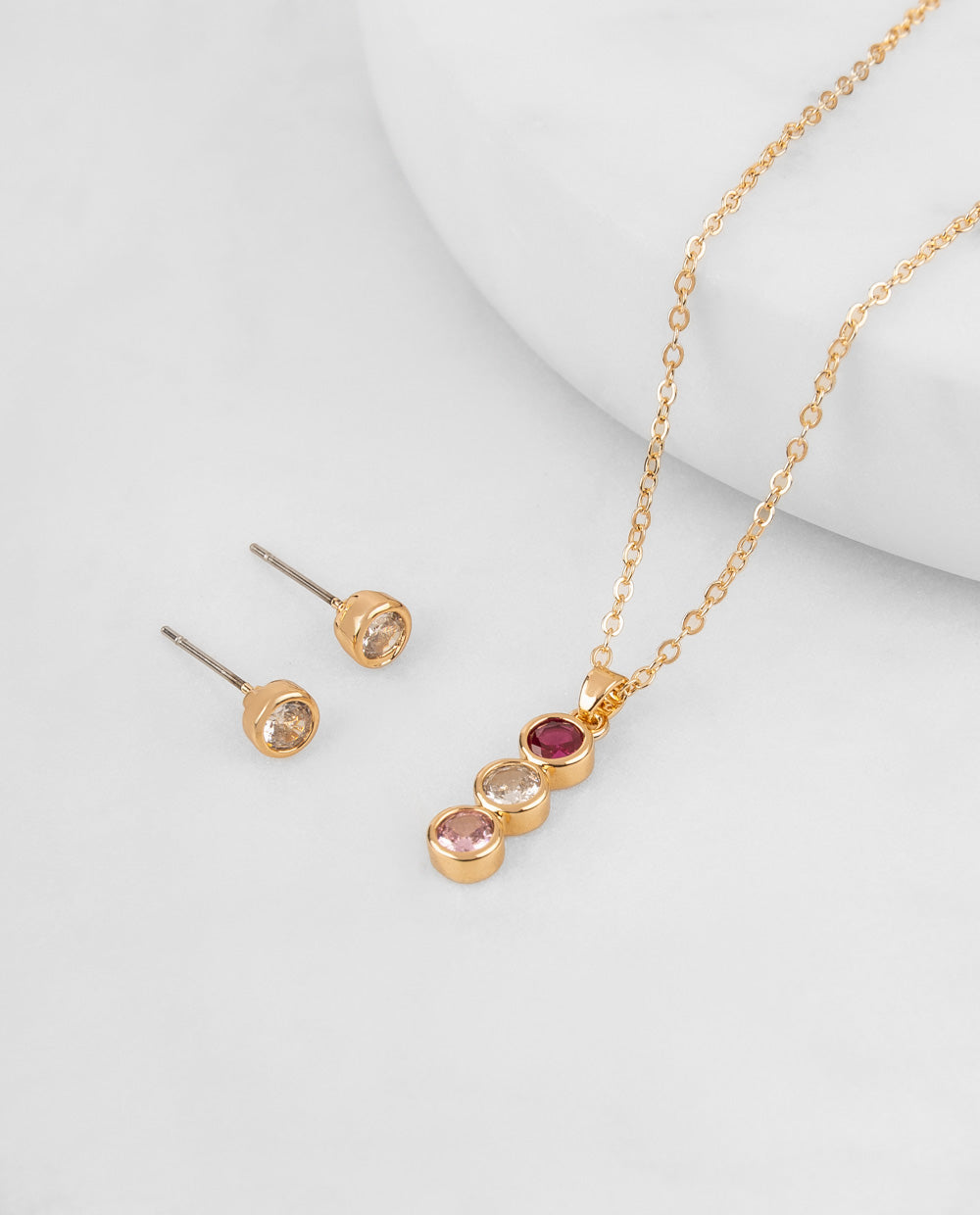 Este set de la colección Glow combina elegancia y color en su máxima expresión. El collar presenta un colgante con tres circones en tonos rosa, cristal y rubí, acompañado de aretes tipo brillante para un look equilibrado y sofisticado. Ideal para sumar luz y personalidad a cualquier outfit.
