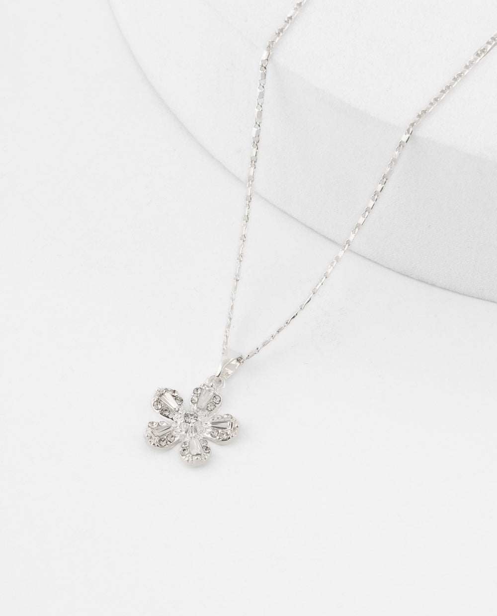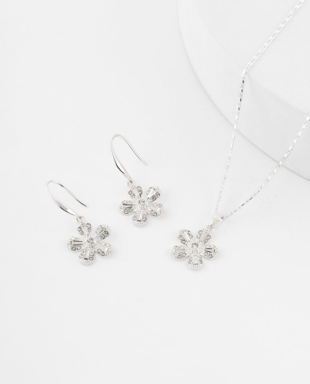 Set collar y aretes plateados con flor calada en forma de pétalos, acabado brillante y cadena ligera que aporta un toque delicado y femenino.