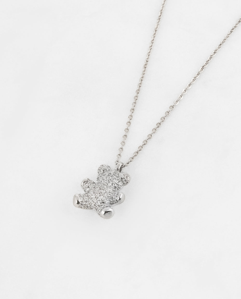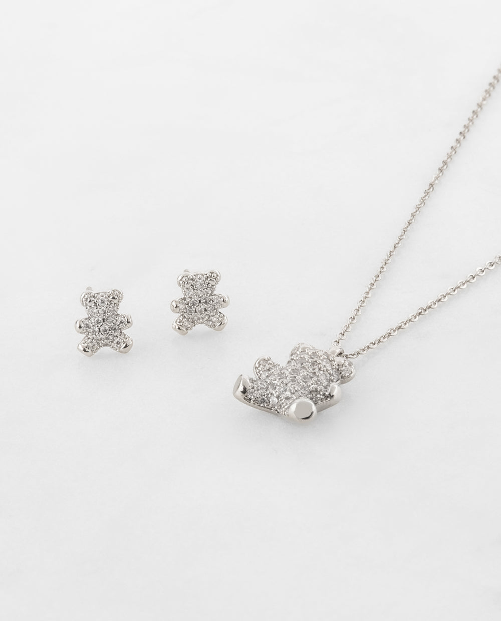Collar plateado bañado en plata con dije de oso cubierto en pedrería de zircón y aretes a juego, perfecto para un look tierno y lleno de brillo.