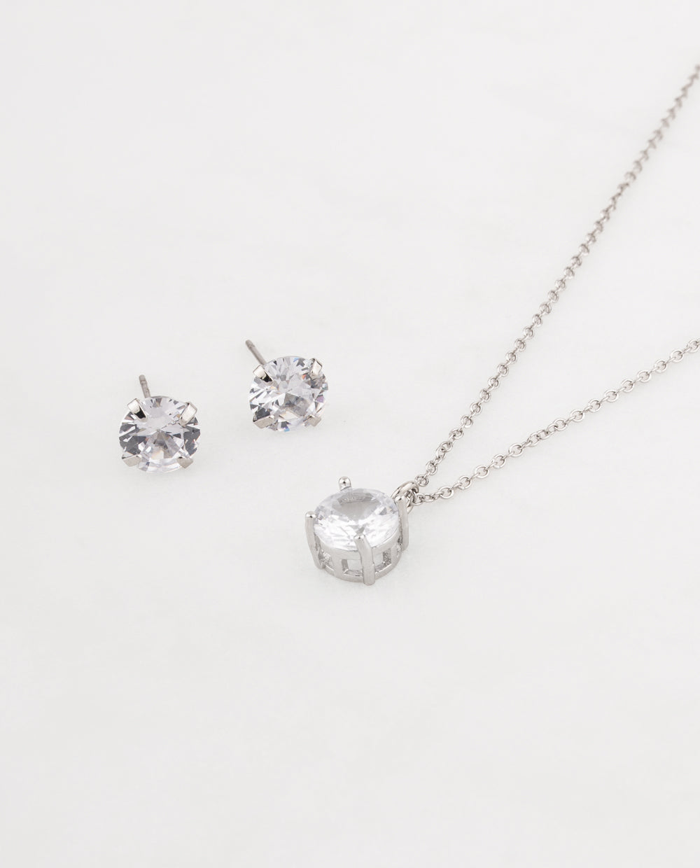 Set minimalista compuesto por collar y aretes con pedrería de zircón en corte redondo. Su diseño atemporal ilumina cualquier look, siendo perfecto tanto para el día a día como para una ocasión especial. Una pieza esencial que aporta brillo sutil y elegancia natural.