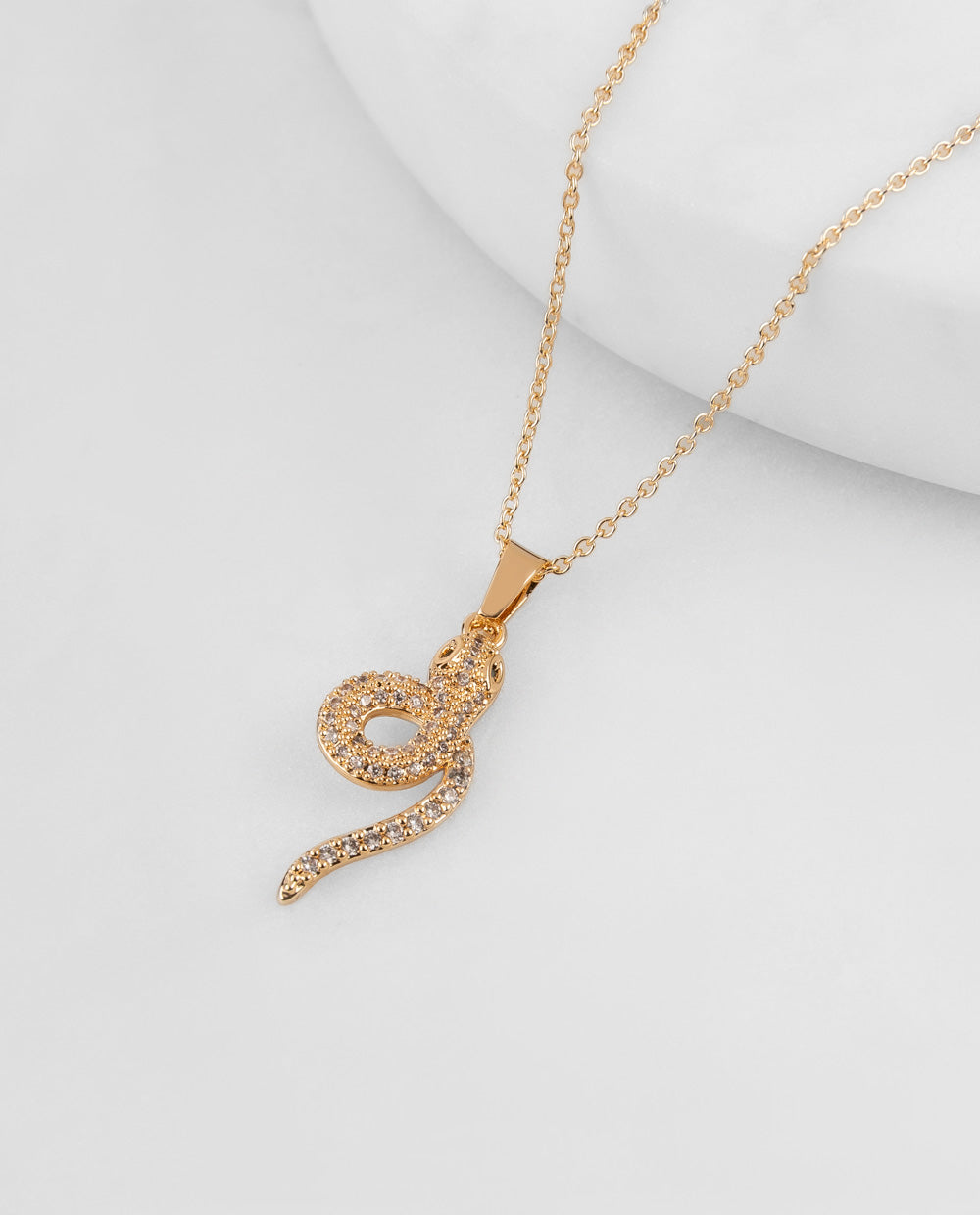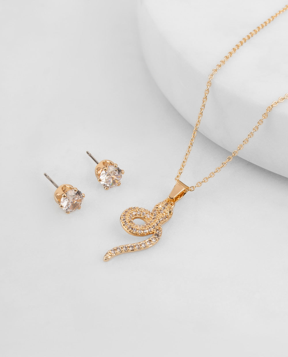 Este set de la colección Glow destaca por su estilo audaz y brillante. Incluye un collar con dije de serpiente decorado con pedrería de zircón y unos aretes tipo brillante, perfectos para equilibrar el look. Bañado en oro, es ideal para quienes buscan un accesorio con fuerza, elegancia y mucho glow.