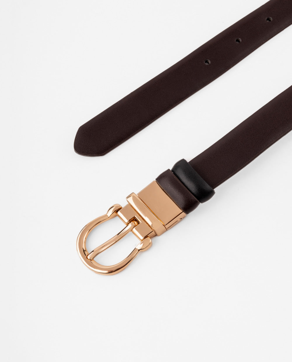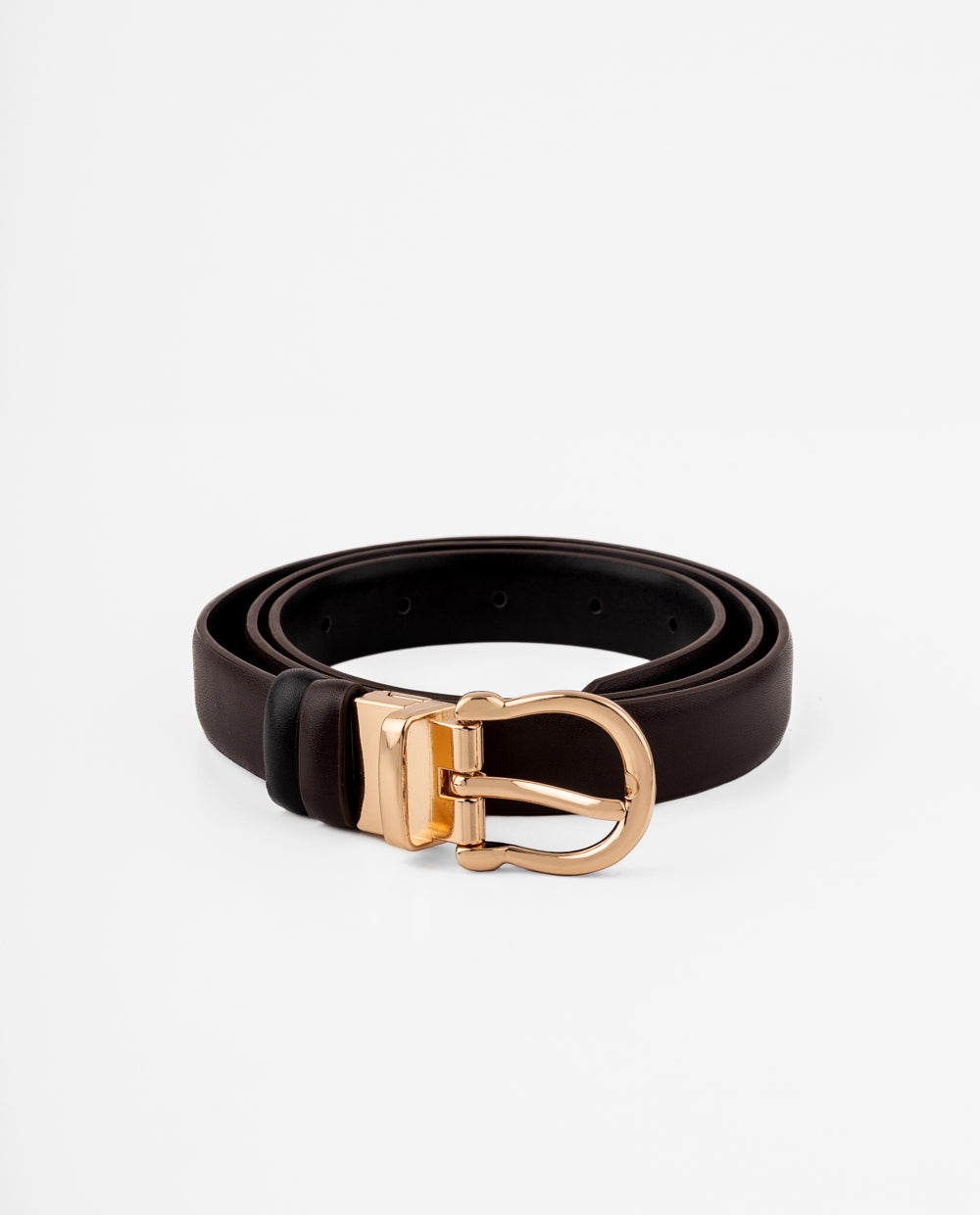 Correa en tono marrón clásico con una hebilla metálica dorada que resalta por su diseño moderno y sofisticado. Ideal para elevar cualquier look, desde el casual hasta el más elegante, aportando un toque de estilo y distinción en cada uso.