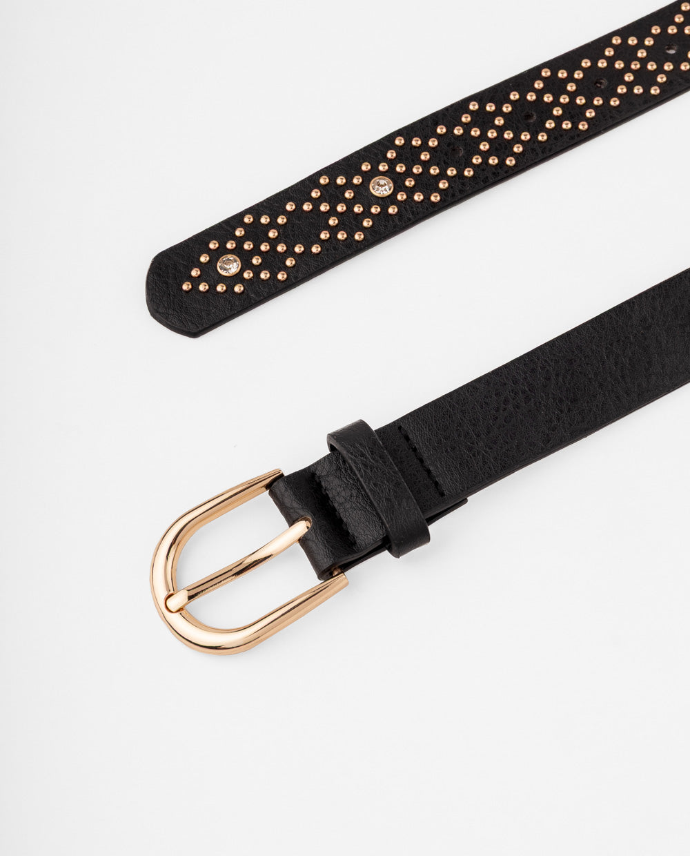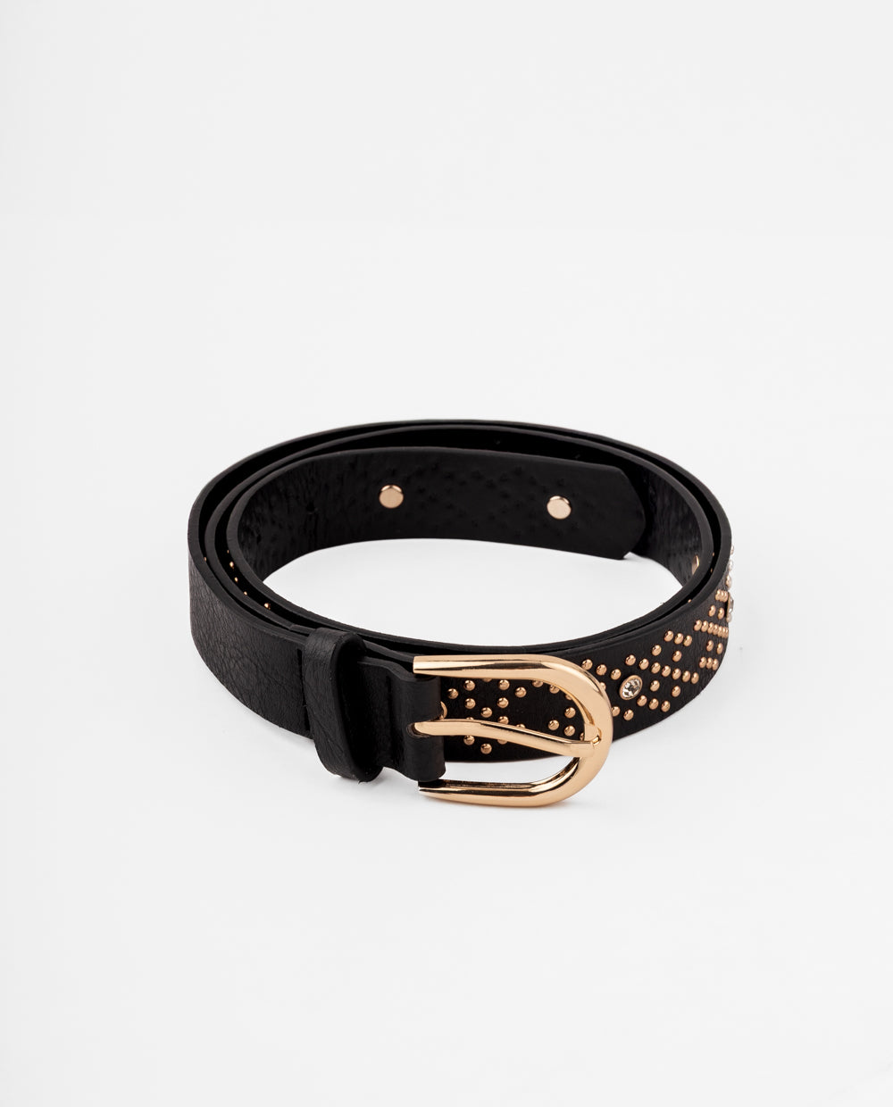 Correa en tono negro con detalles de tachas doradas y hebilla metálica en acabado brillante, que aporta un estilo moderno y atrevido. Ideal para realzar jeans, pantalones o vestidos, sumando un toque urbano y con personalidad. Un accesorio versátil que combina moda y actitud en cada ocasión.