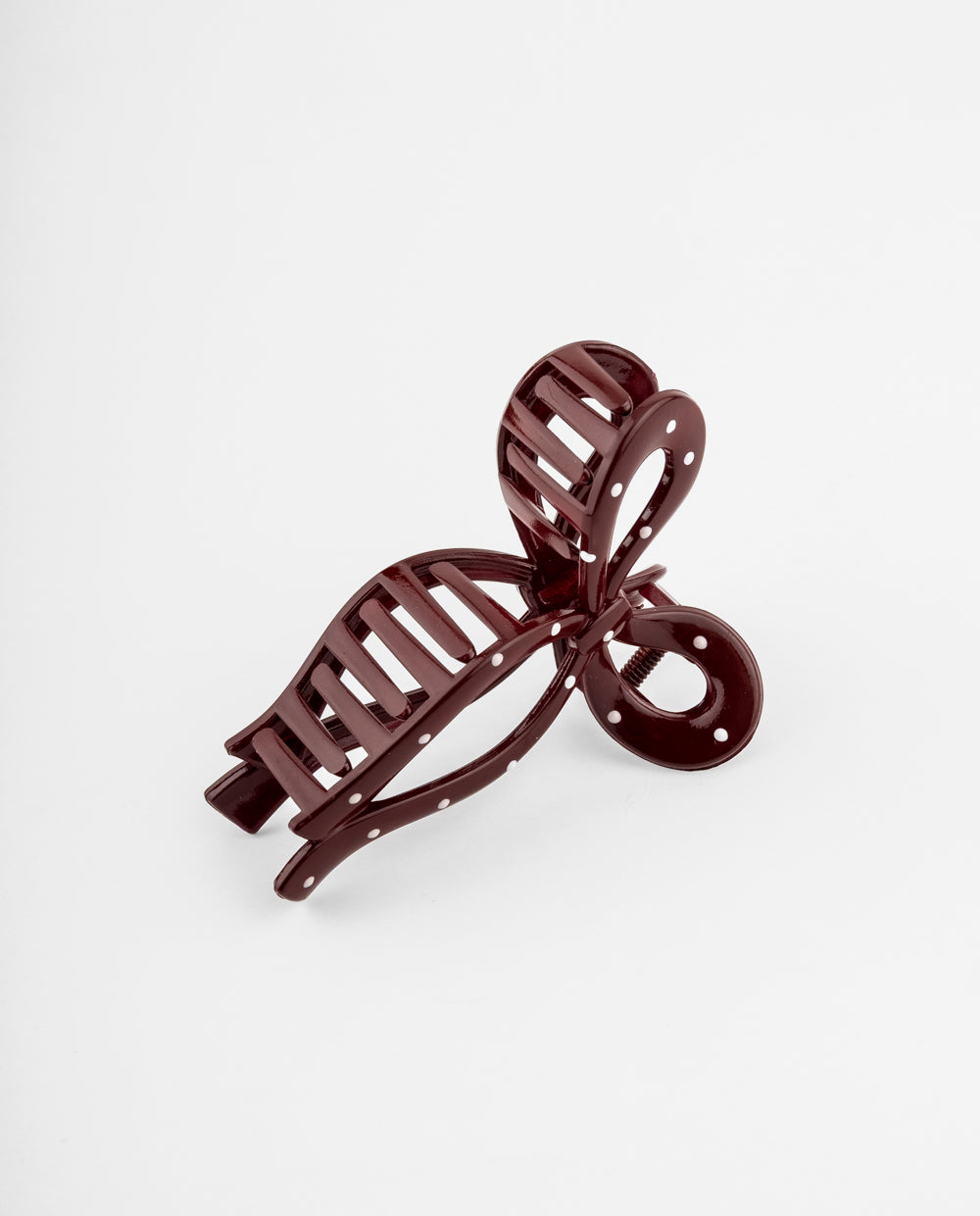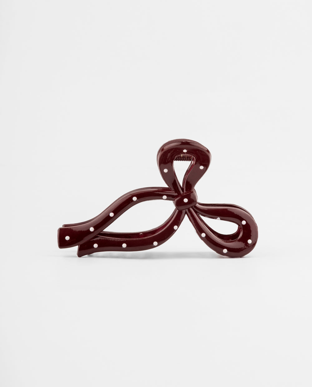 Gancho grande en forma de lazo color burgundy con detalles de lunares blancos. Hecho en material brillante y resistente, ideal para sujetar el cabello con un toque femenino y vintage.